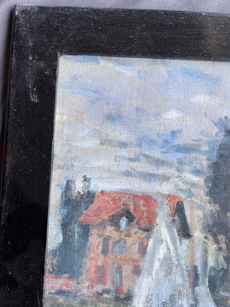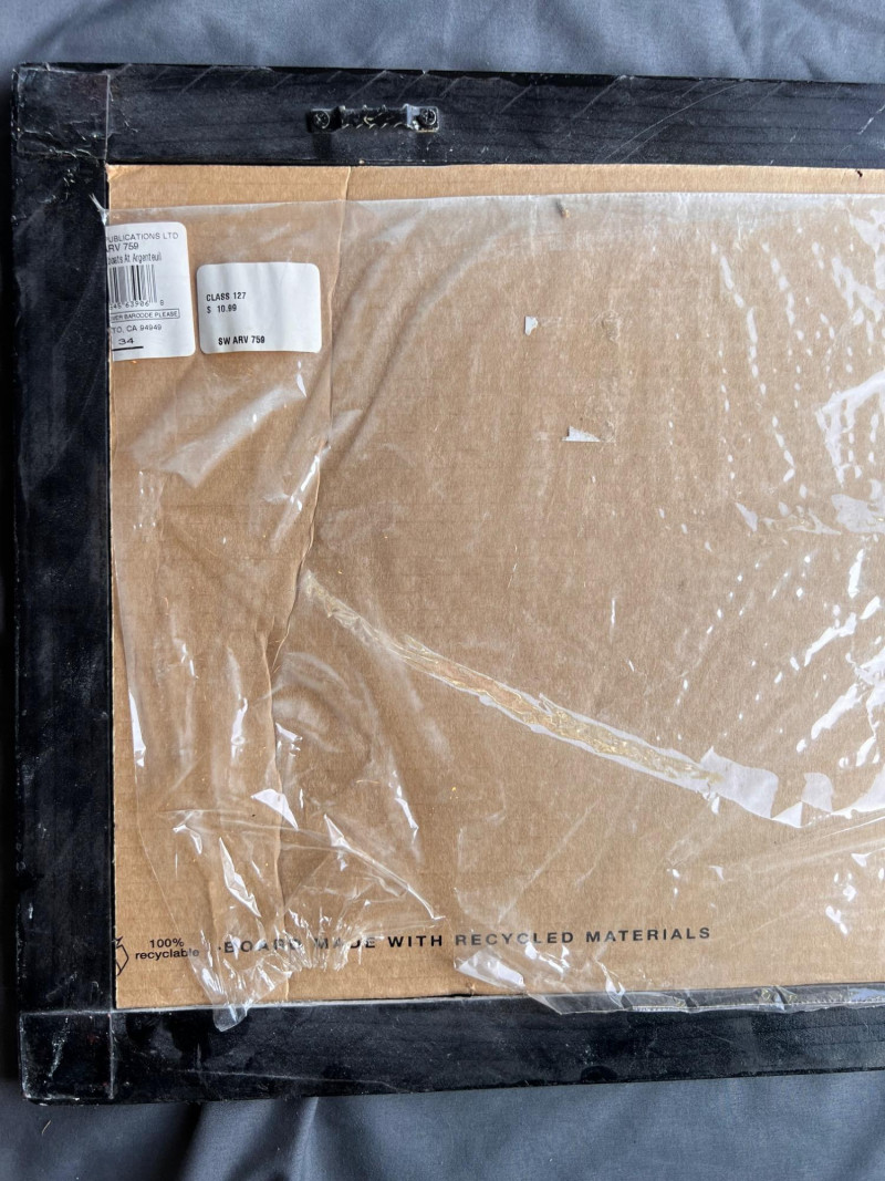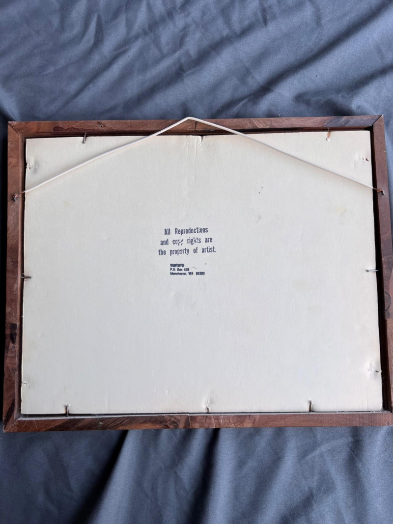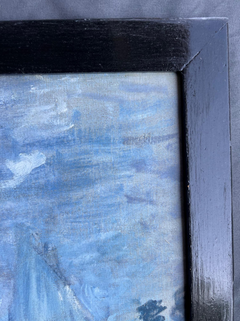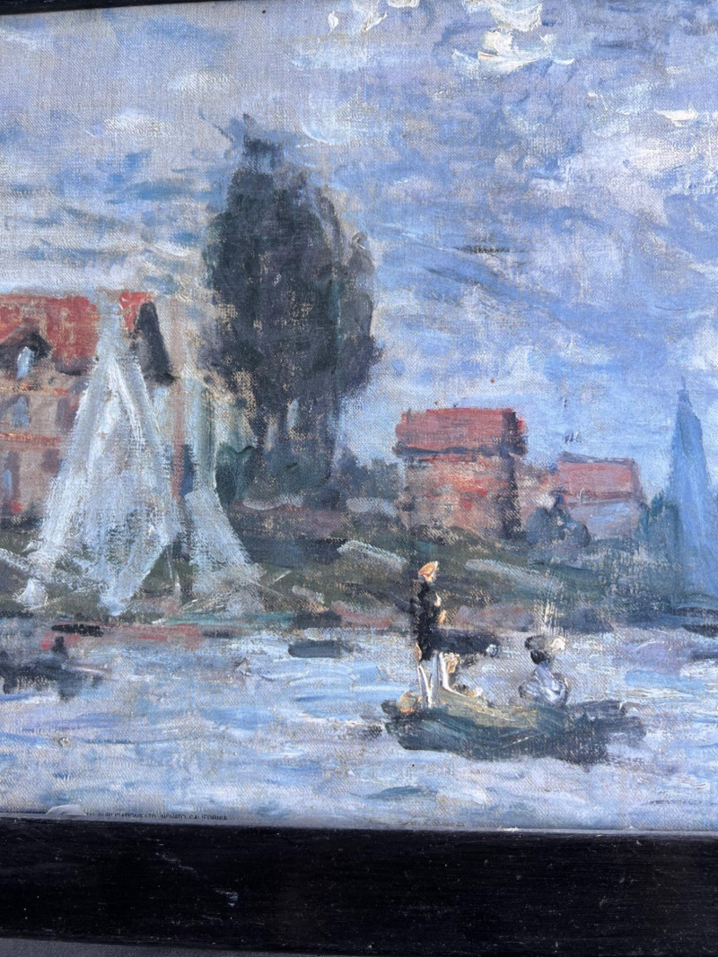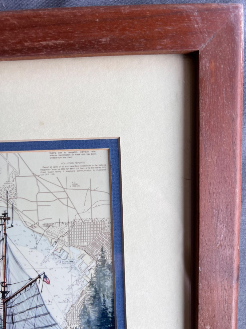 Claude Monet Regatta & Vestufo Tall Ship – Framed Prints (2 Pieces) A pair of framed maritime prints. One is Claude Monet’s Les Barques – Régates à Argenteuil, depicting sailboats near the shore. The other is a limited edition print by Vestufo of a three-masted Coast Guard ship over a nautical chart, signed and numbered 39/850, with a copyright stamp on the reverse. Both are framed in wood. Dimensions: