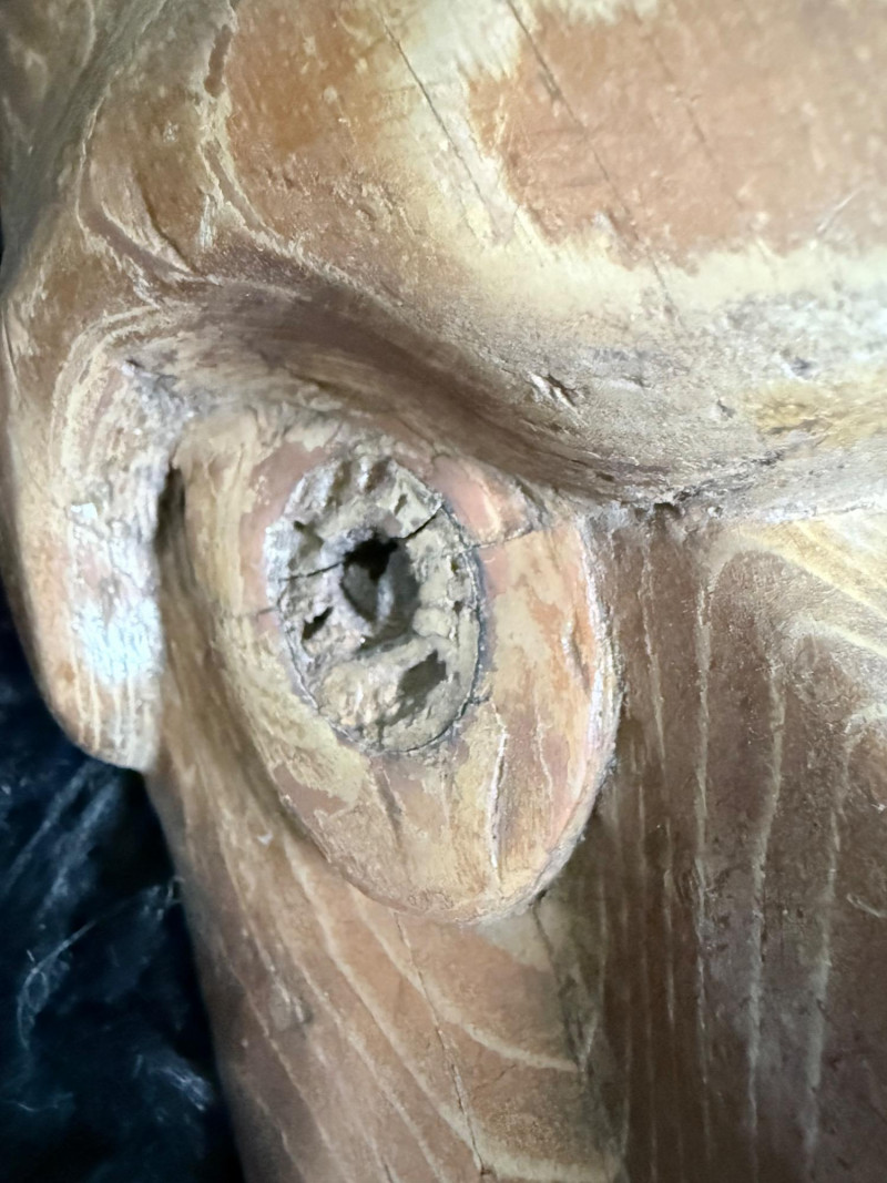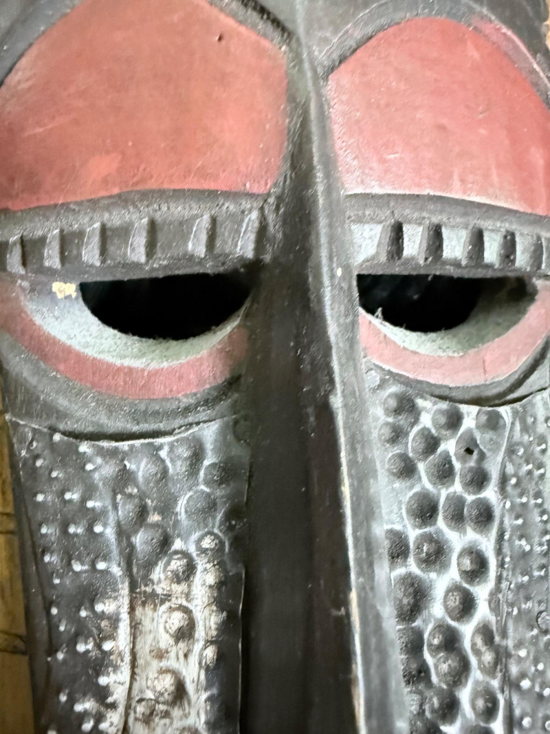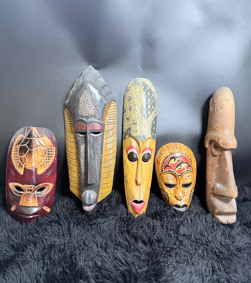 • One stylized mask with deep-set eyes and prominent carved features resembling Oceanic decor
