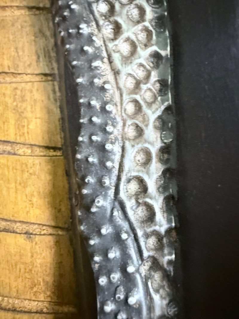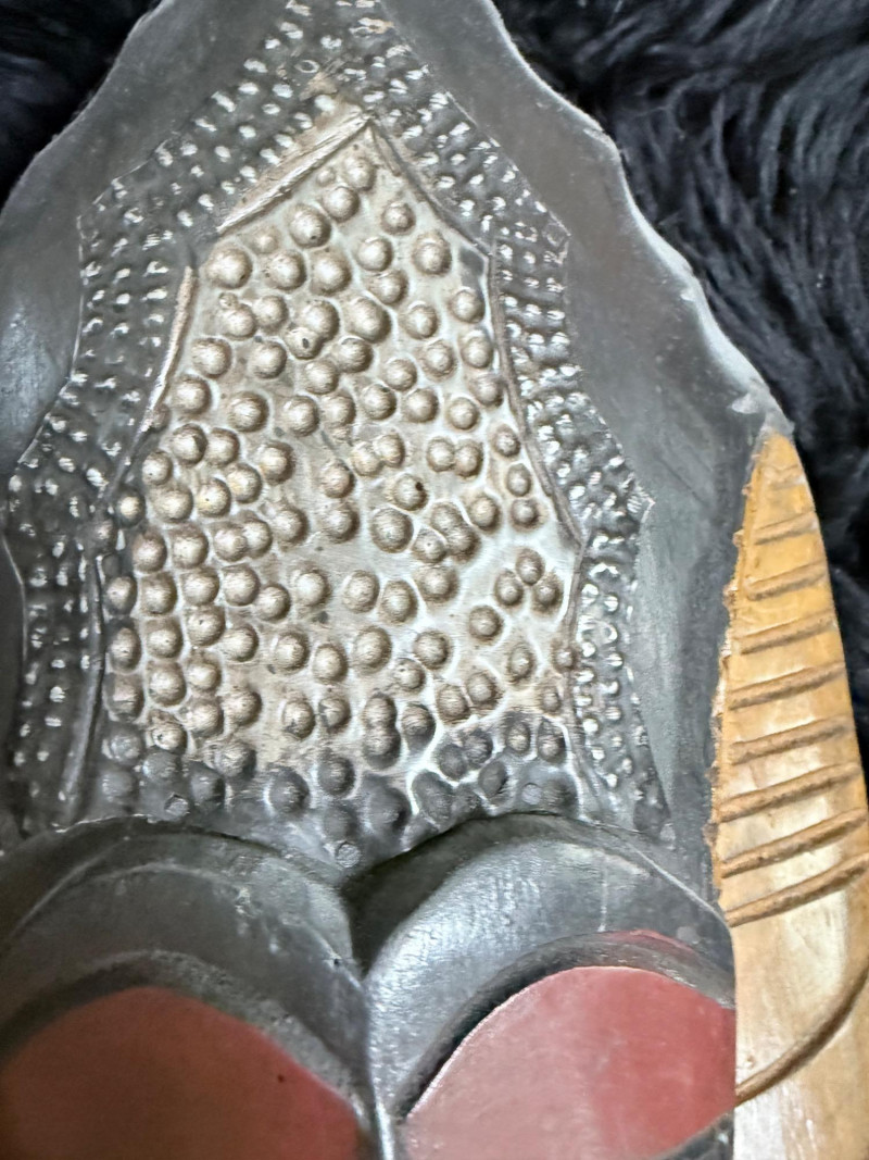 • One African-inspired tall mask with vertical bands and stippled detailing
