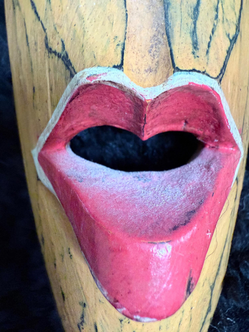 • One Indonesian-style mask with painted lips and engraved surface motifs