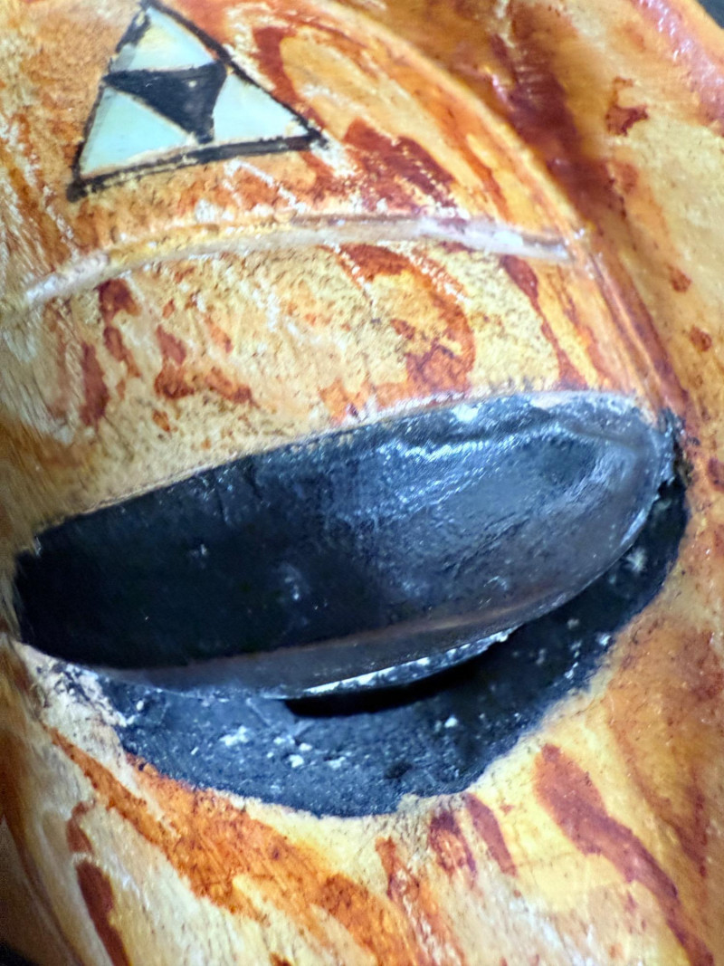 • One Tiki-style mask with carved facial features and a turtle-like pattern