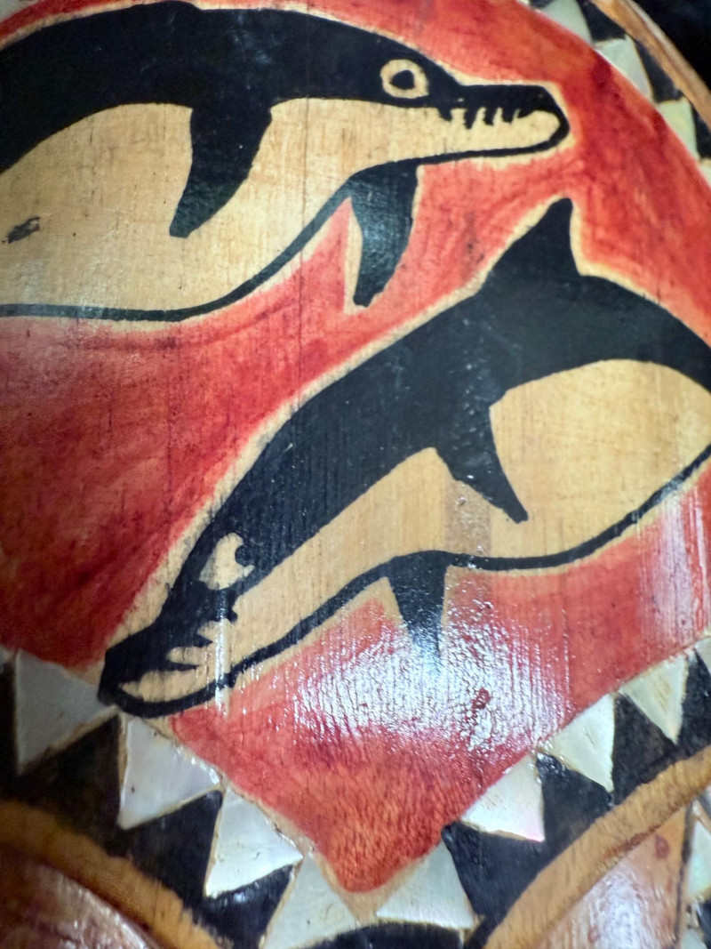 • One small mask with painted dolphin motif in the style of Balinese souvenirs