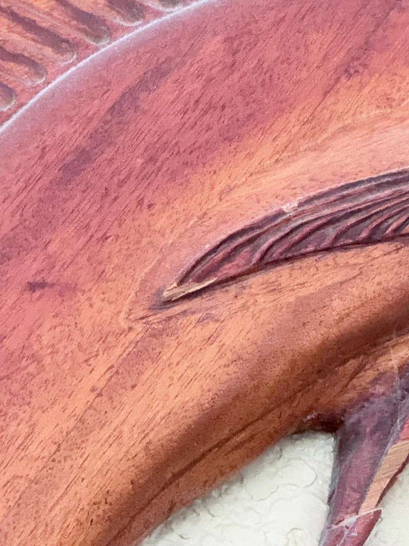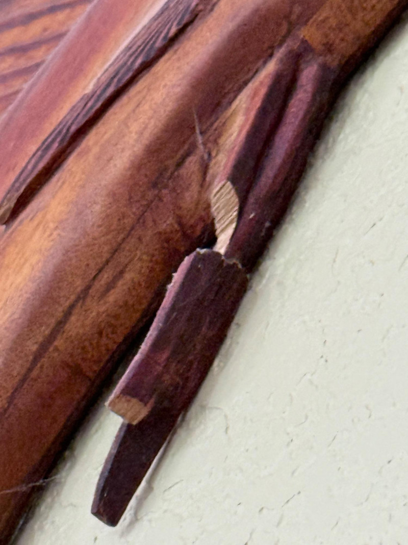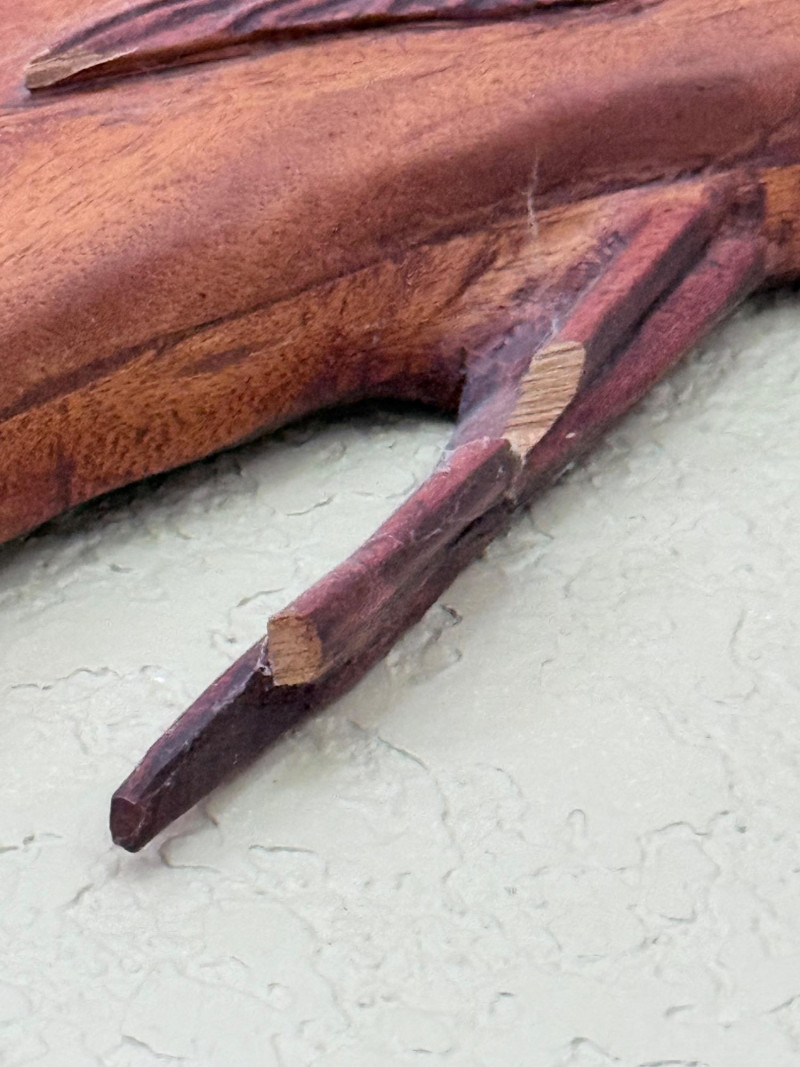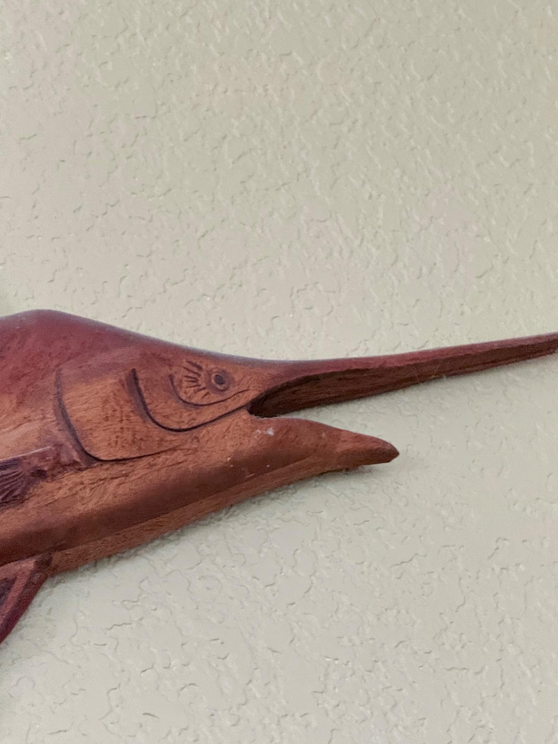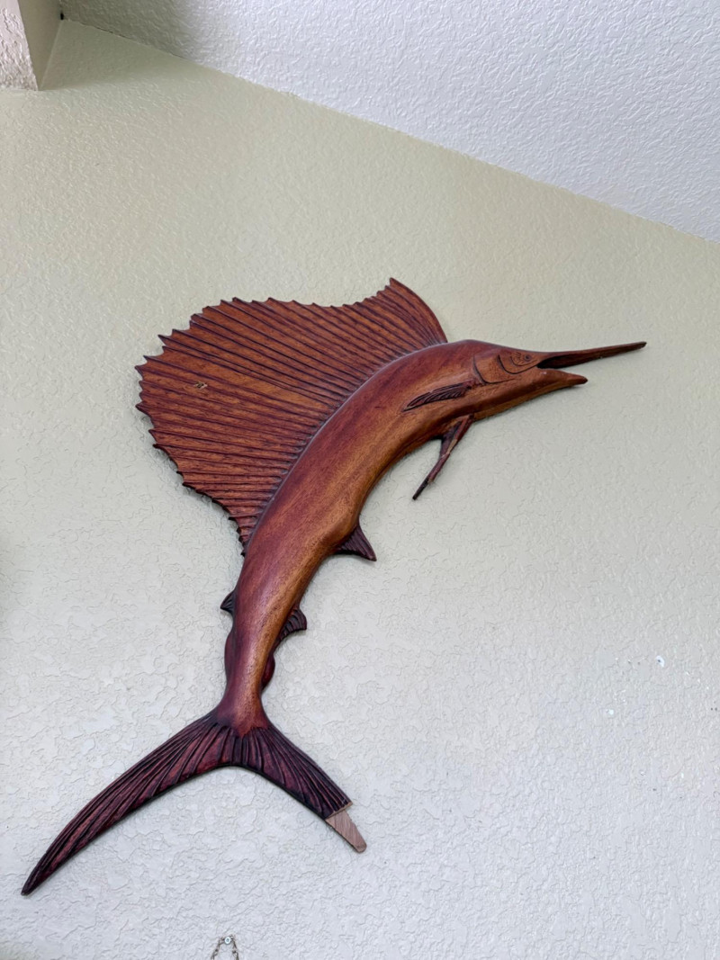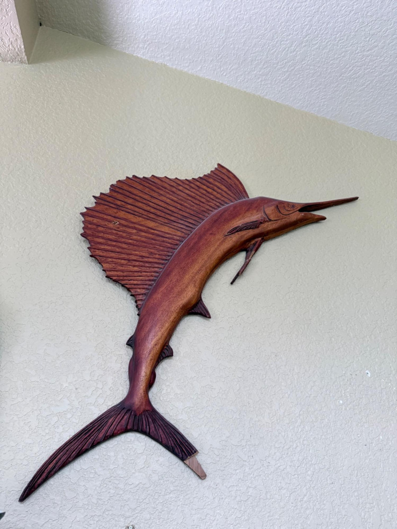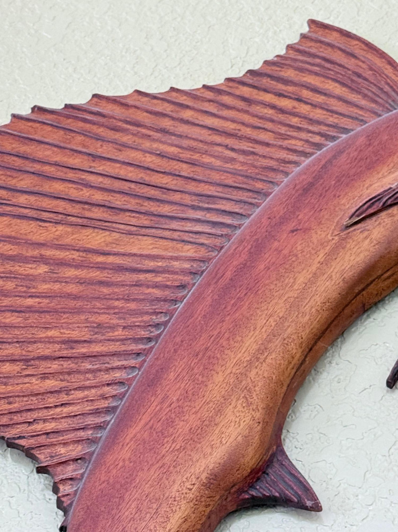 Carved Wooden Sailfish Wall Sculpture – 39" Tall Carved wooden sailfish wall sculpture with extended fins, long bill, and detailed body contours. Incised linework appears along the sail and fins. Some portions, including the pectoral fins and lower tail, show breaks or missing sections. Dimensions:
