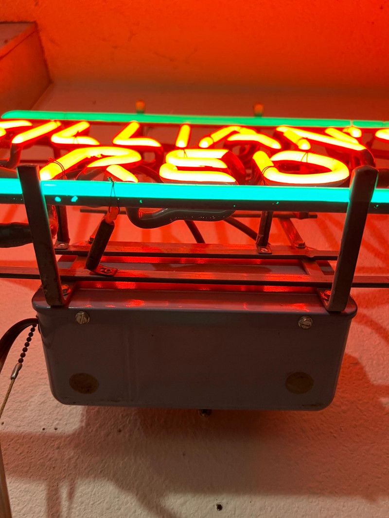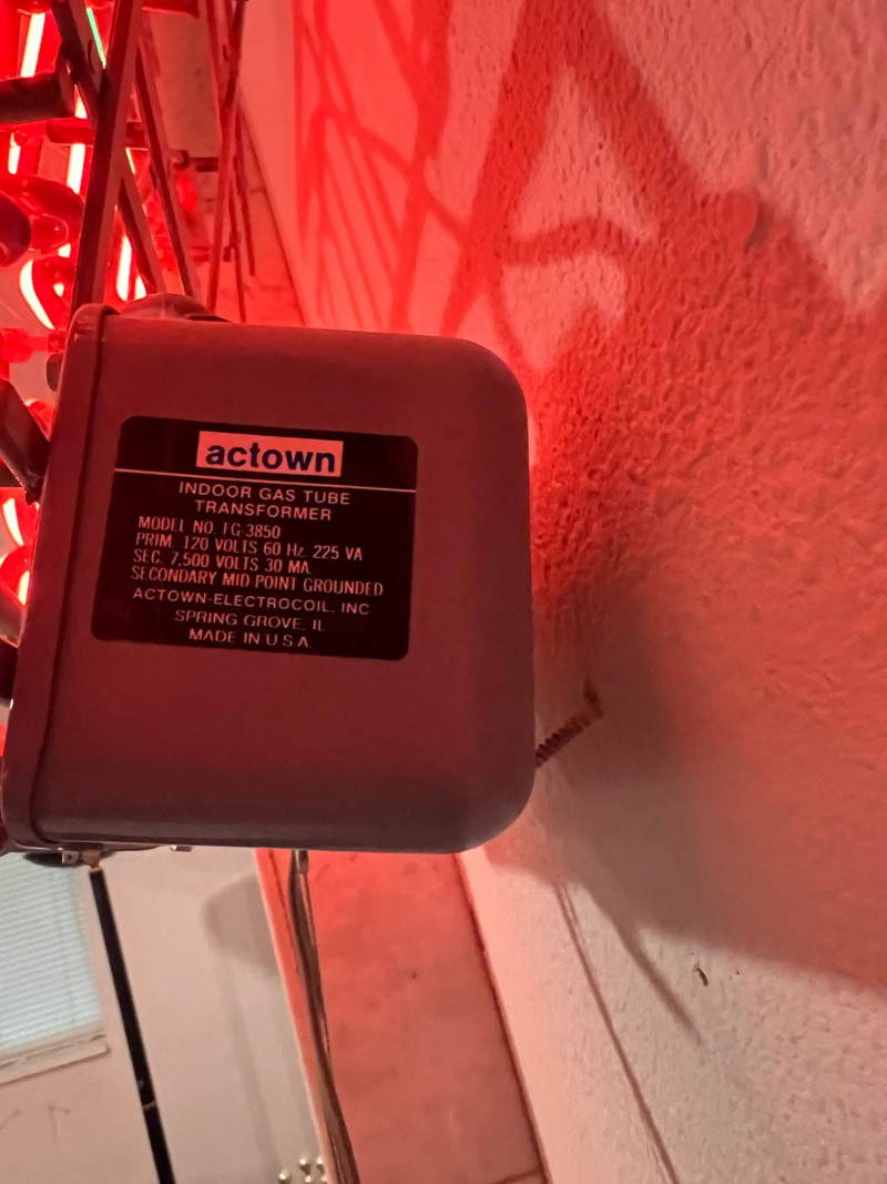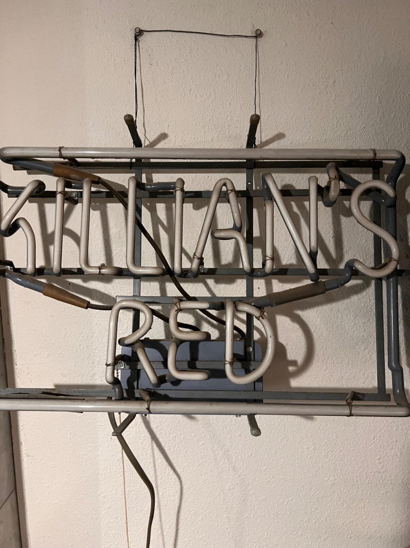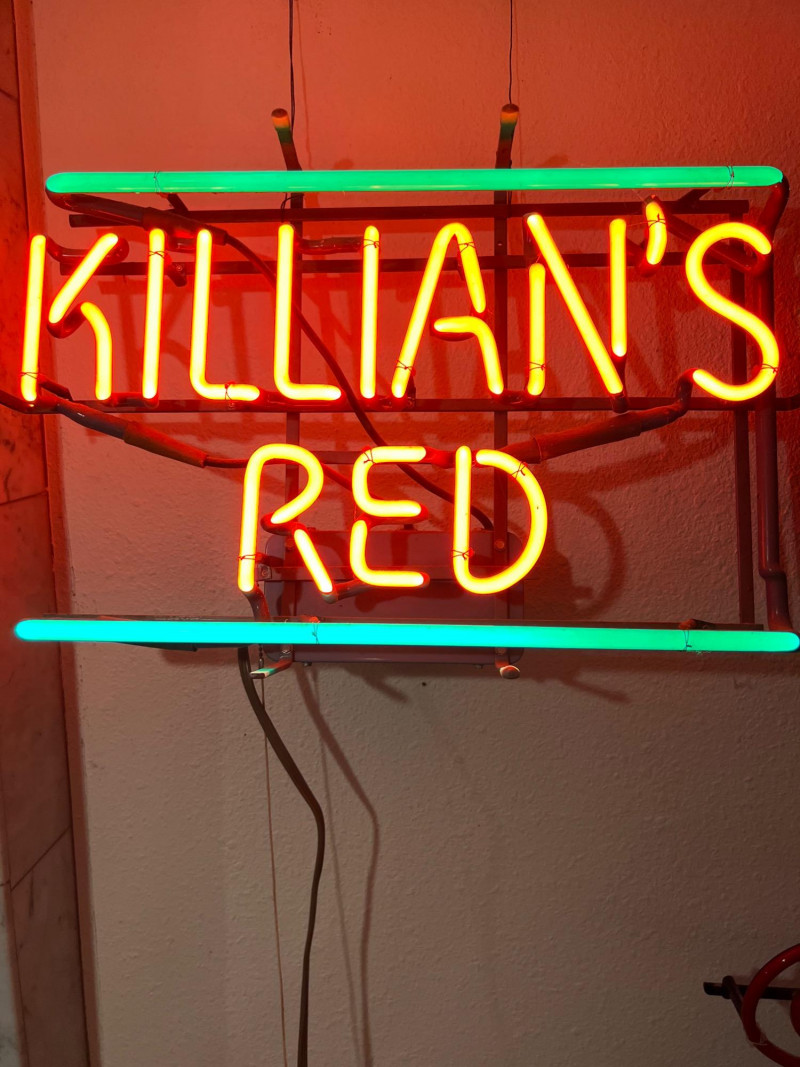 Killian's Red Neon Beer Sign Glass neon beer sign displaying the text "KILLIAN'S RED" in red and orange tubing with a horizontal green-blue accent tube above and below. The sign is mounted on a black metal frame and is powered by an Actown transformer connected via a pull-chain switch and standard wall plug. The piece includes two metal hanging hooks for wall suspension. Dimensions: 22" W x 15" H Power: Actown GTO10 transformer, indoor use only.