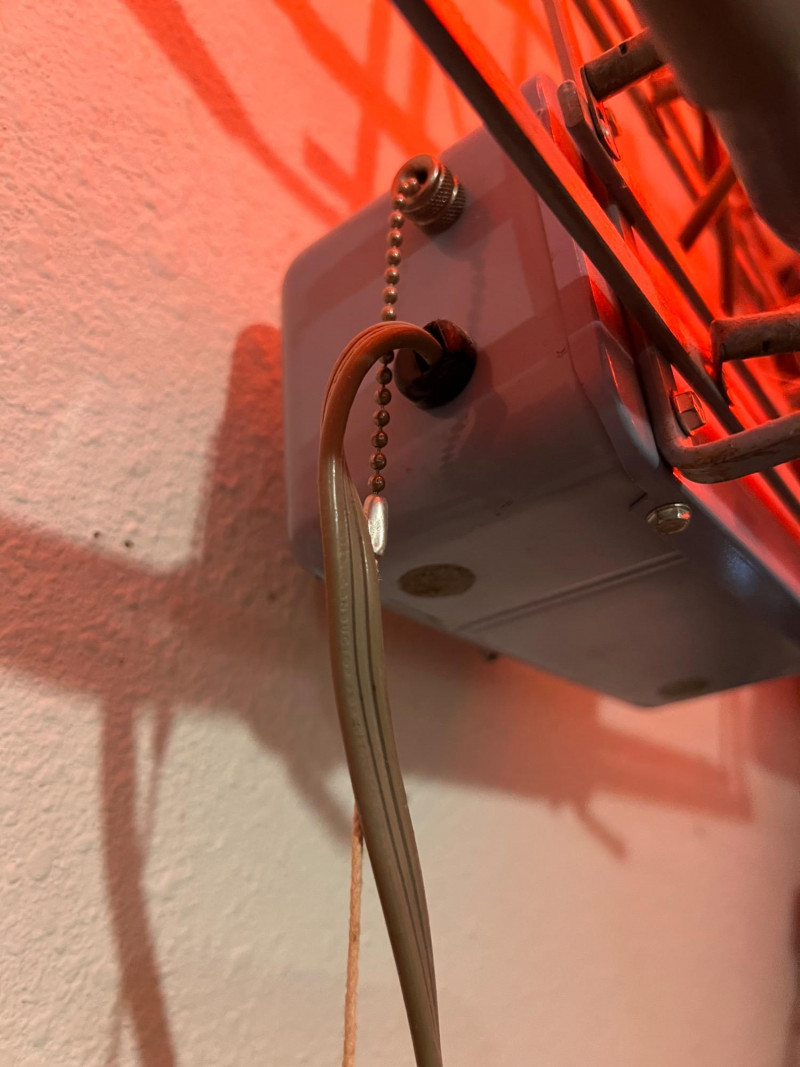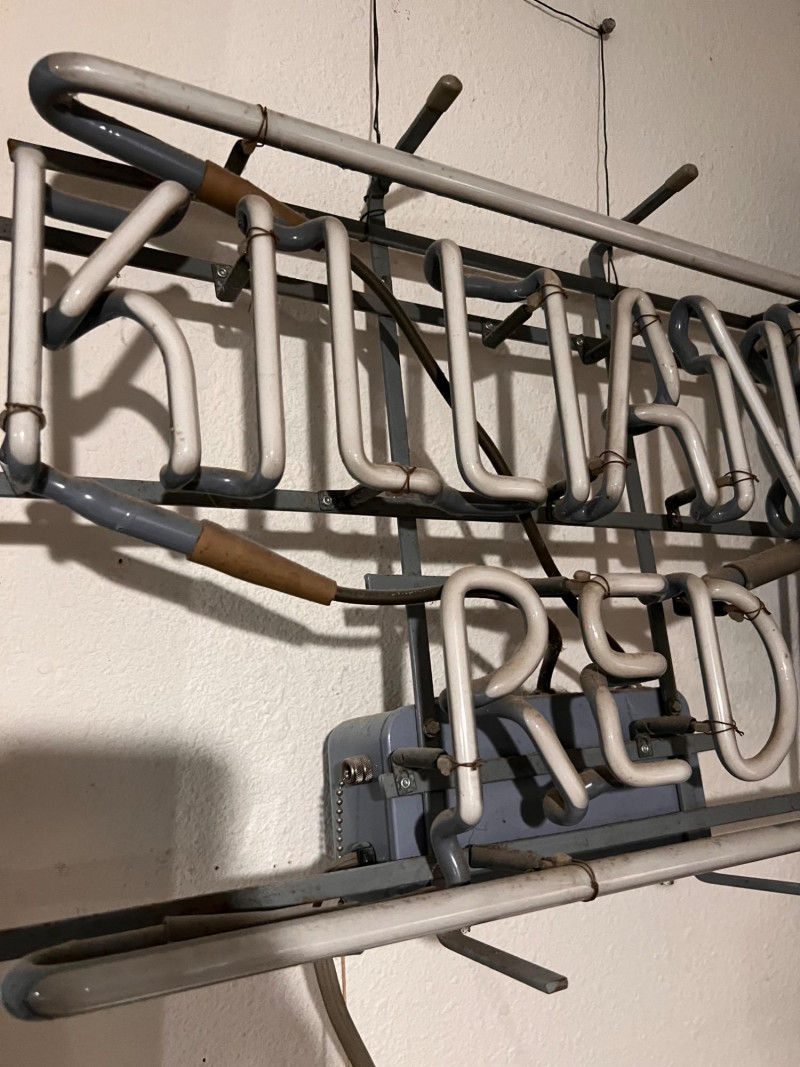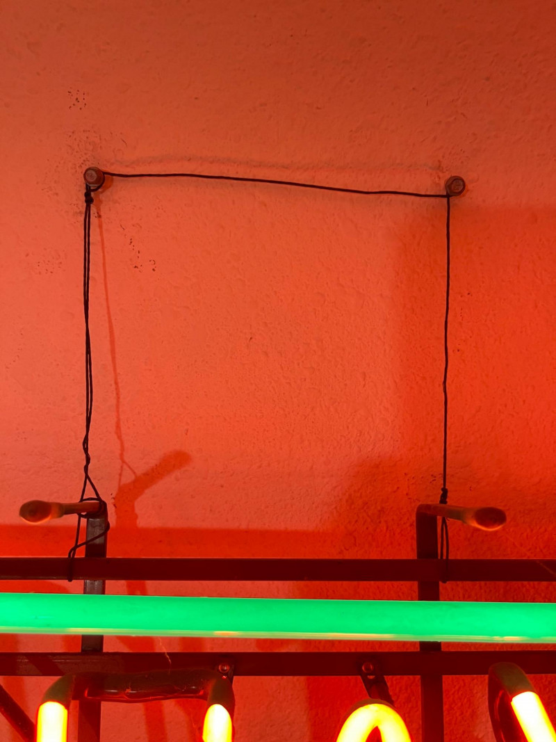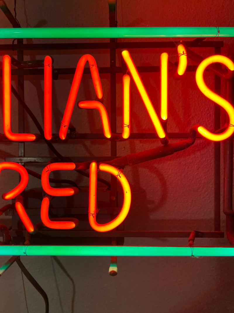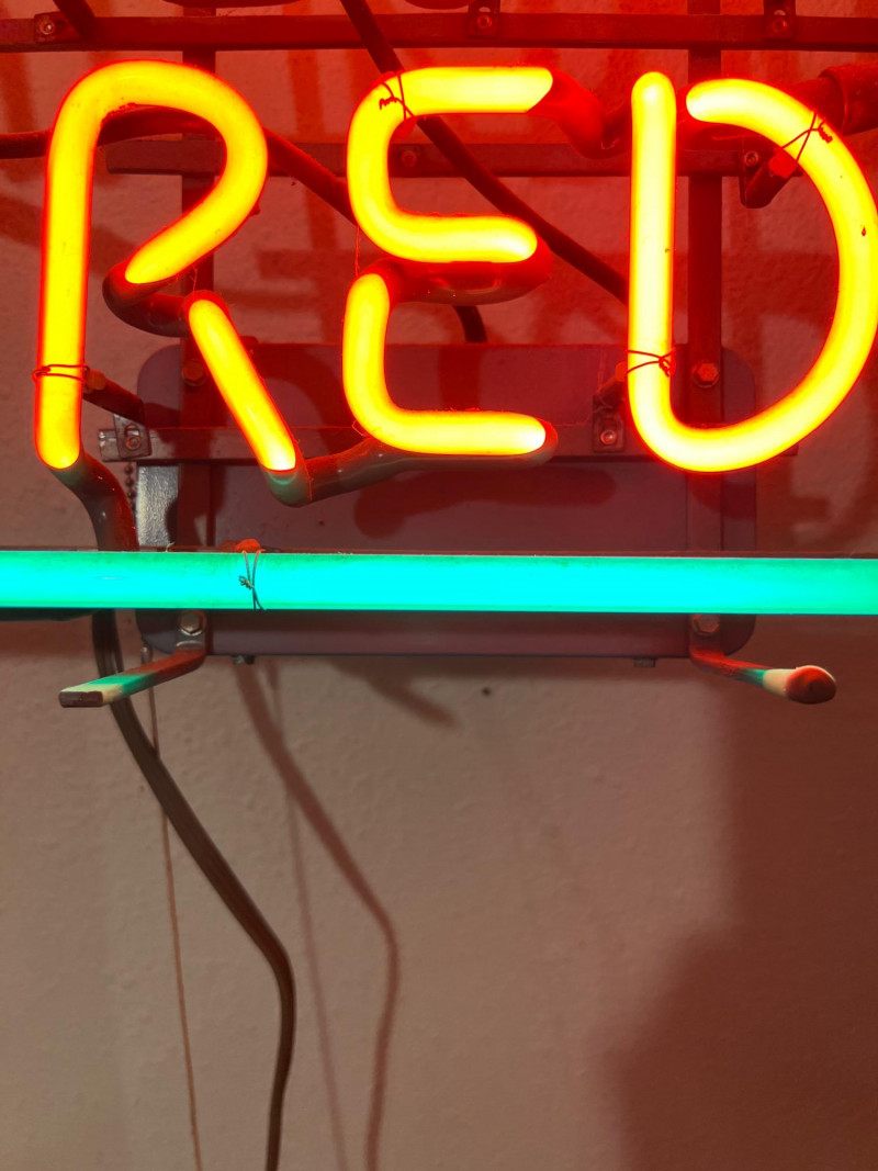 Killian's Red Neon Beer Sign Glass neon beer sign displaying the text "KILLIAN'S RED" in red and orange tubing with a horizontal green-blue accent tube above and below. The sign is mounted on a black metal frame and is powered by an Actown transformer connected via a pull-chain switch and standard wall plug. The piece includes two metal hanging hooks for wall suspension. Dimensions: 22" W x 15" H Power: Actown GTO10 transformer, indoor use only.