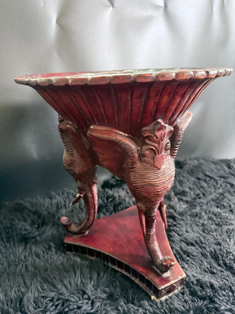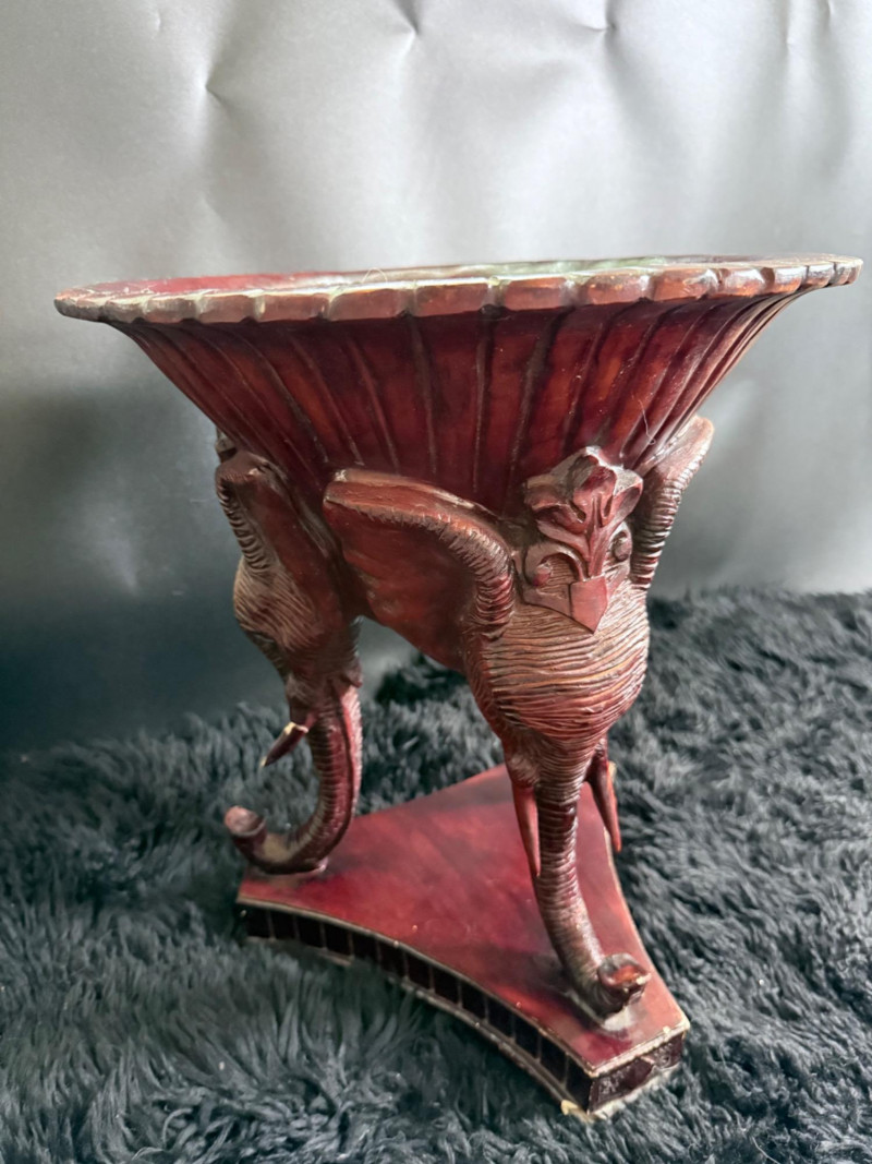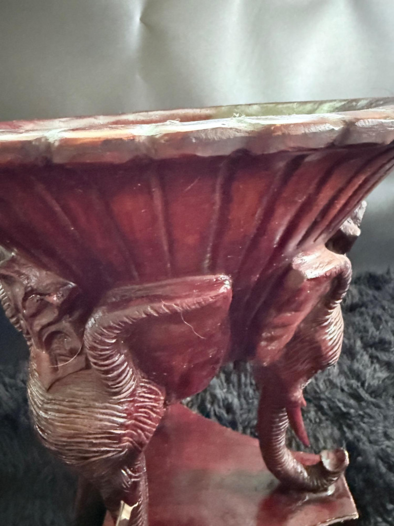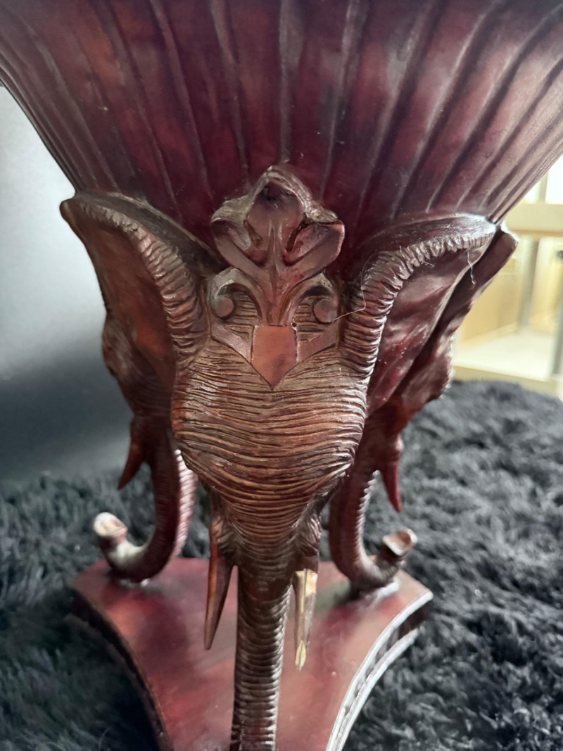 Carved Wooden Elephant Stand Planter – 17" Tall A wooden planter featuring three carved elephants with uplifted trunks supporting a flared bowl. The bowl has a ribbed interior and scalloped rim, set on a curved triangular base. Dimensions: Note: Some broken spots