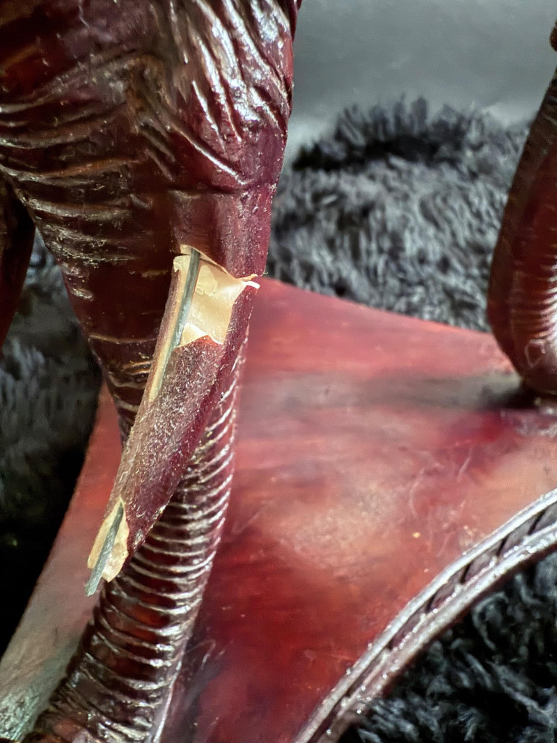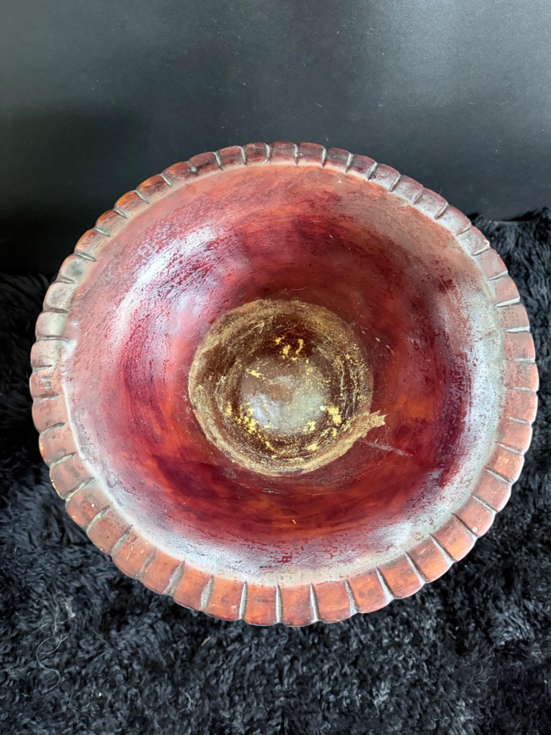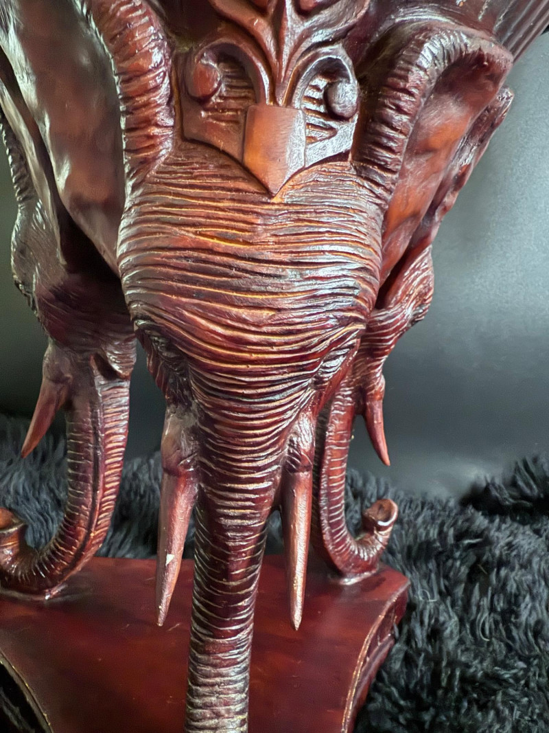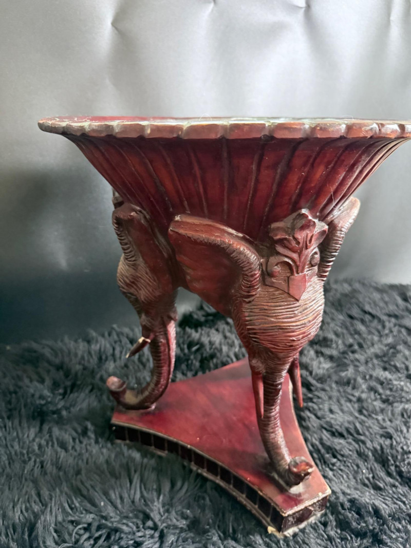 Carved Wooden Elephant Stand Planter – 17" Tall A wooden planter featuring three carved elephants with uplifted trunks supporting a flared bowl. The bowl has a ribbed interior and scalloped rim, set on a curved triangular base. Dimensions: Note: Some broken spots
