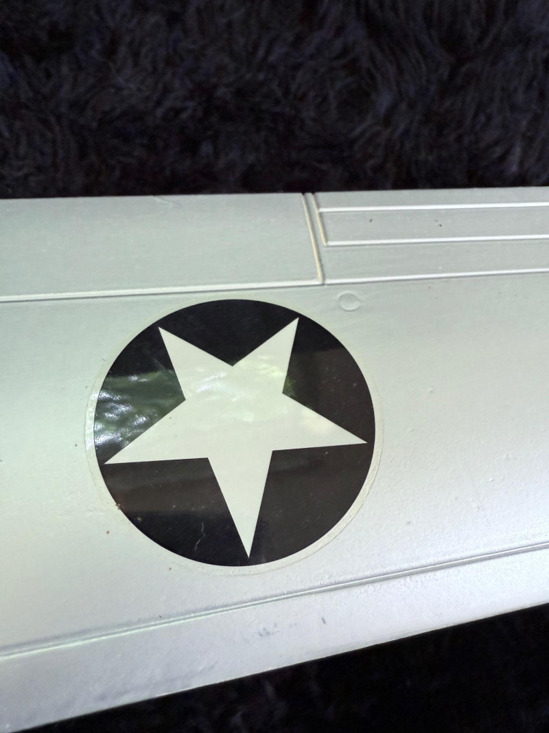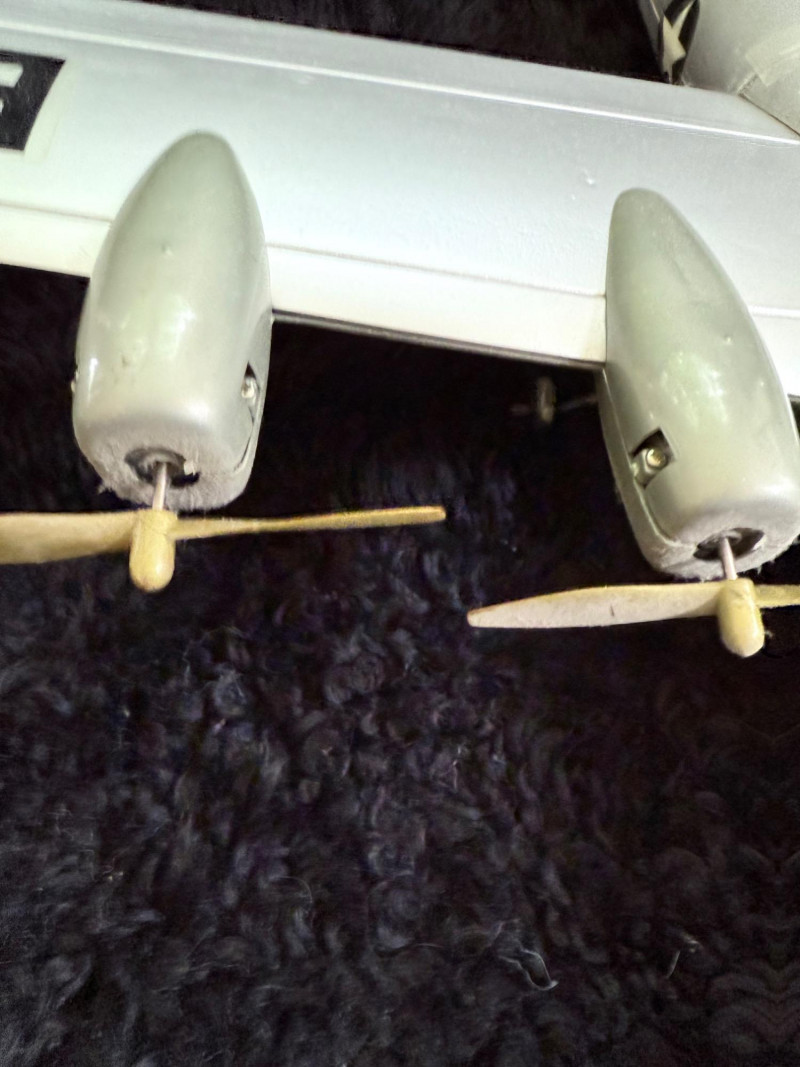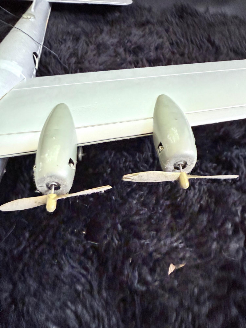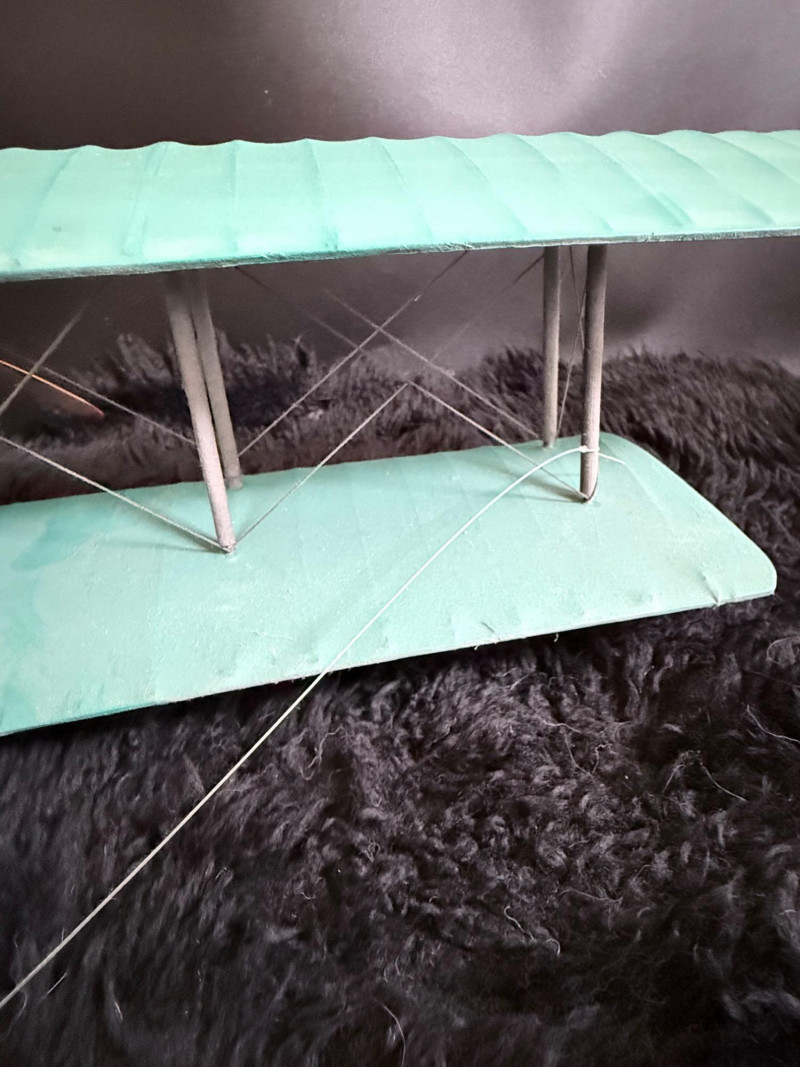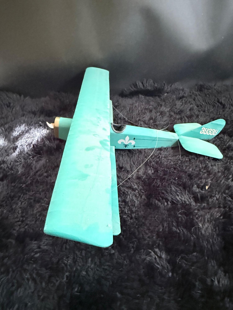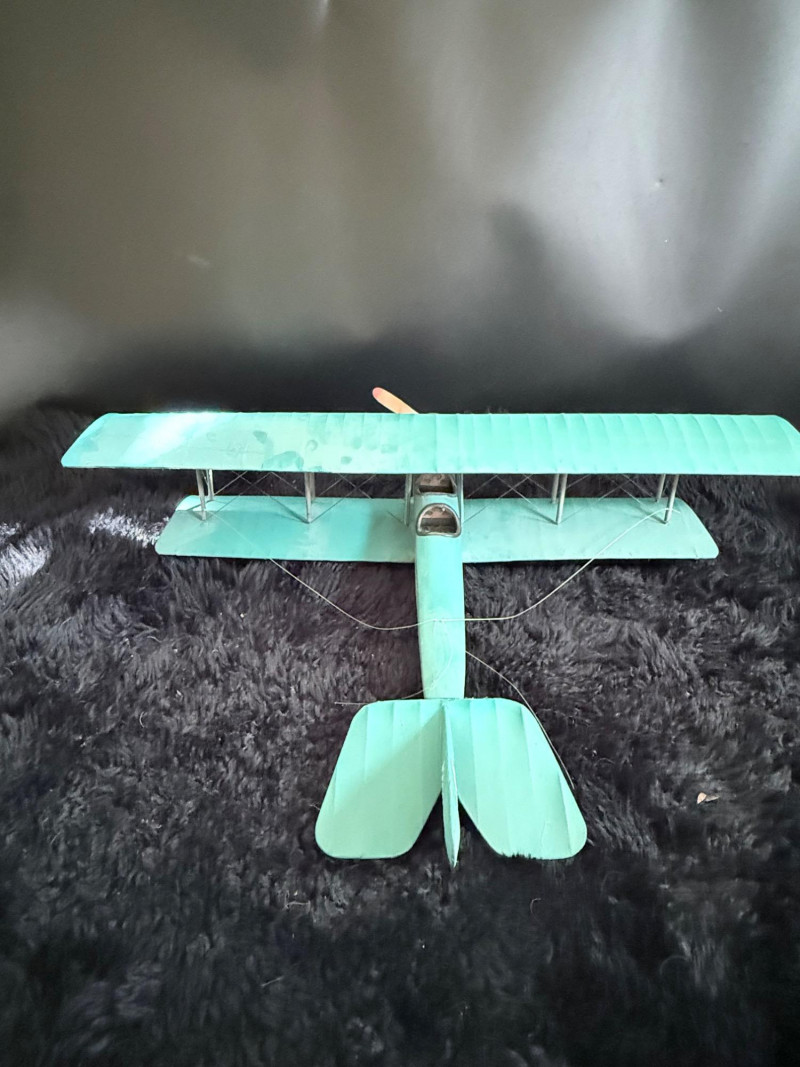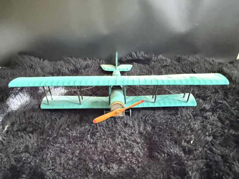 Bomber and Curtiss JN-4 “Jenny” Biplane Model Aircrafts A pair of handcrafted model aircrafts featuring a large four-engine bomber and a Curtiss JN-4 “Jenny” biplane. The bomber has a styrofoam body with plastic propellers, battery housing, and printed military markings including a star insignia and bold wing text. The biplane has a wooden fuselage with paper-covered wings, wire rigging, dual open cockpits, a wooden propeller, fixed wheels, and tail number 39334. A fleur-de-lis emblem is painted on both sides of the fuselage. Dimensions: