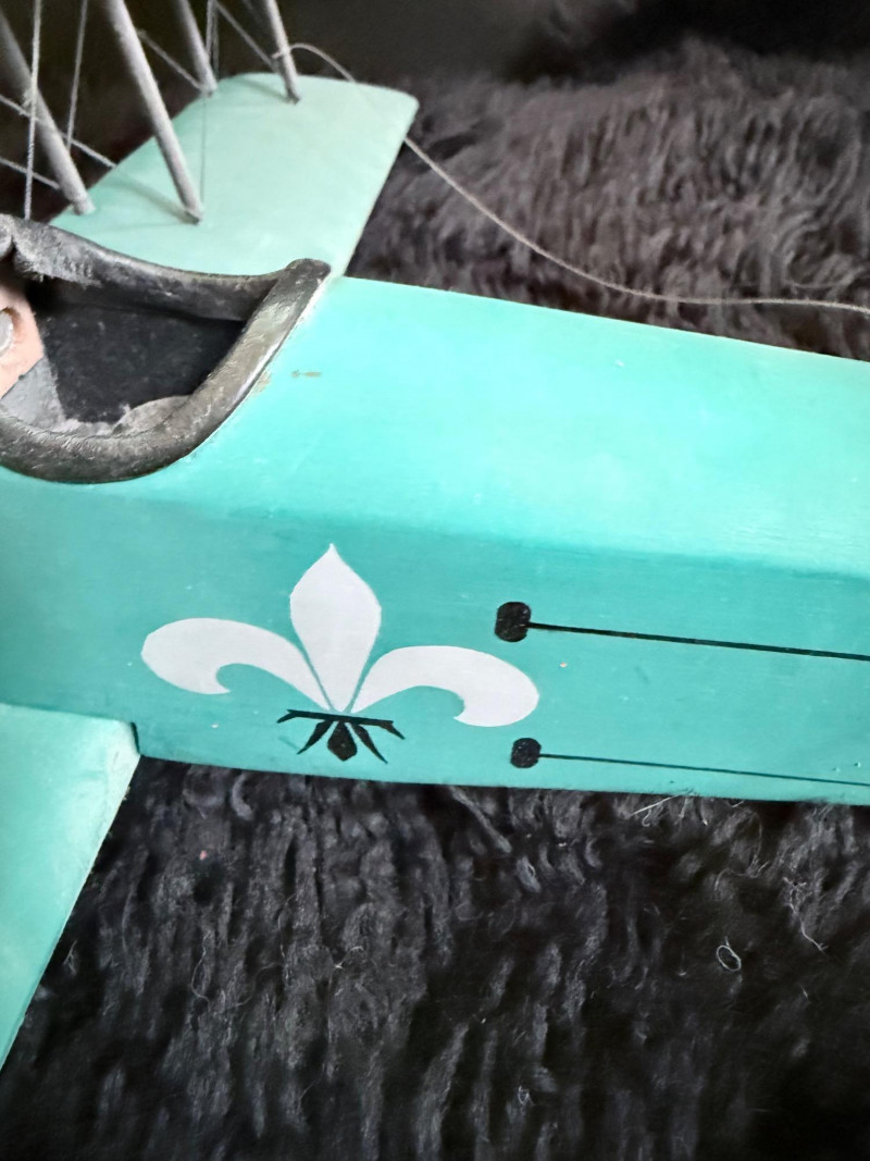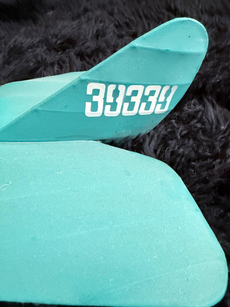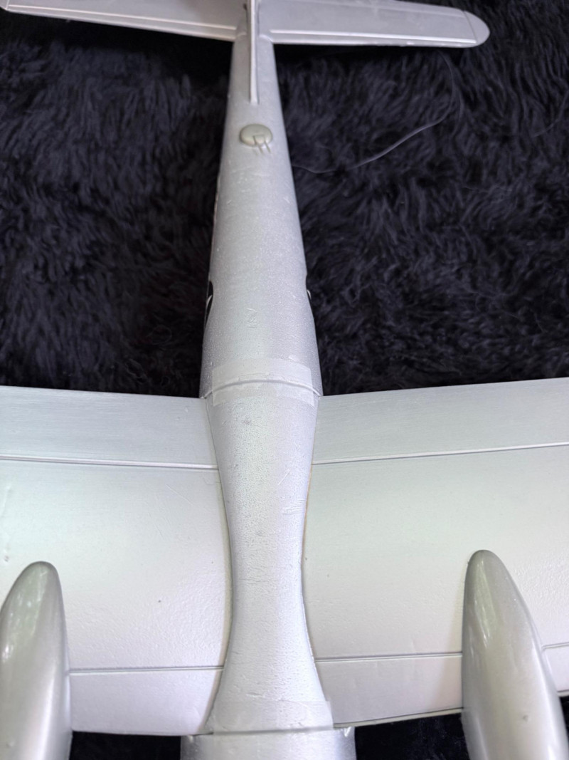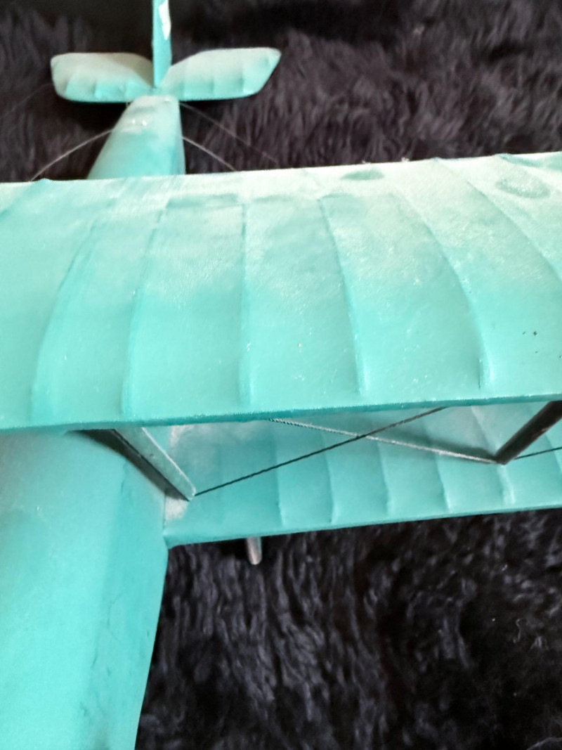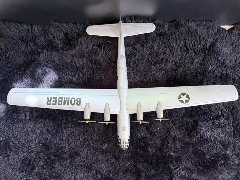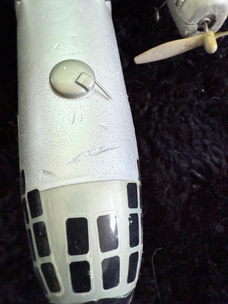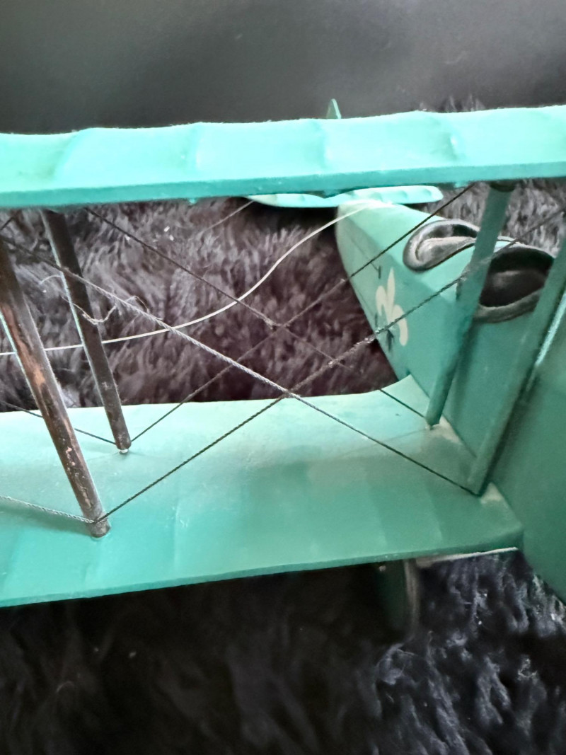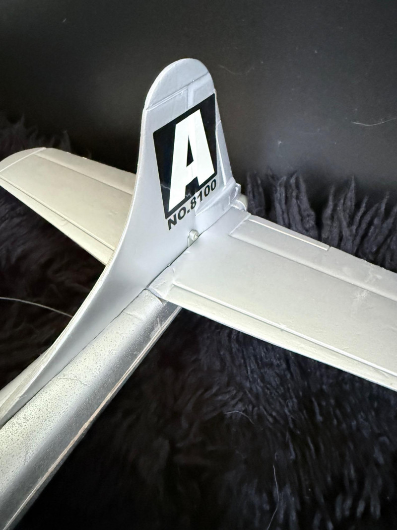 Bomber and Curtiss JN-4 “Jenny” Biplane Model Aircrafts A pair of handcrafted model aircrafts featuring a large four-engine bomber and a Curtiss JN-4 “Jenny” biplane. The bomber has a styrofoam body with plastic propellers, battery housing, and printed military markings including a star insignia and bold wing text. The biplane has a wooden fuselage with paper-covered wings, wire rigging, dual open cockpits, a wooden propeller, fixed wheels, and tail number 39334. A fleur-de-lis emblem is painted on both sides of the fuselage. Dimensions: