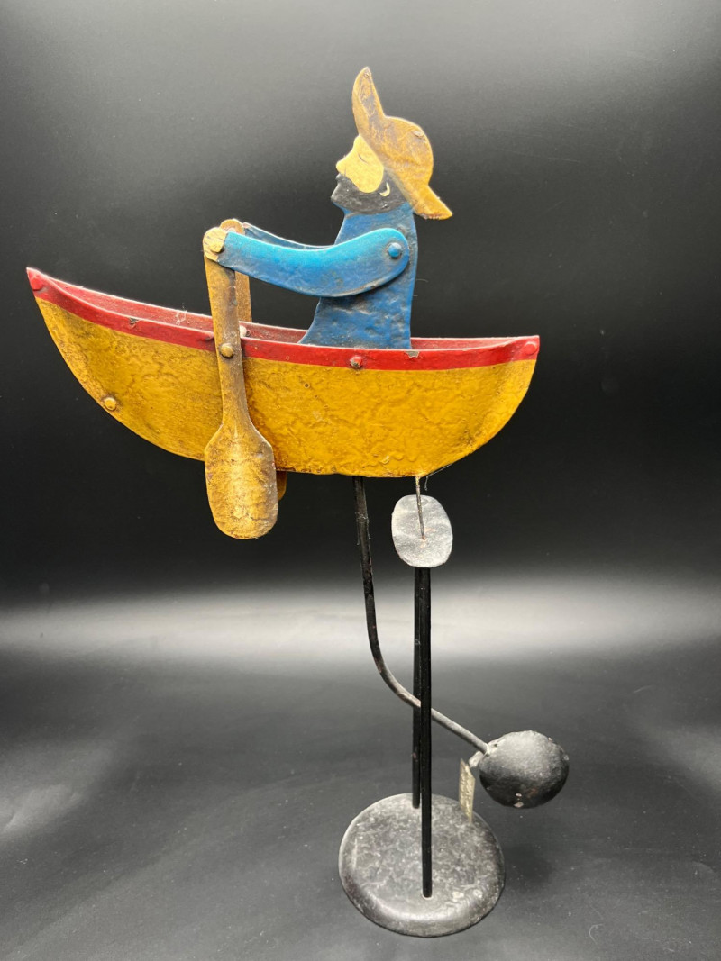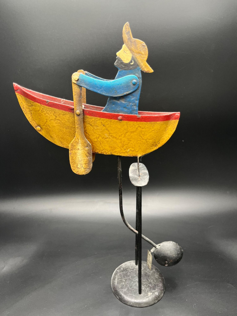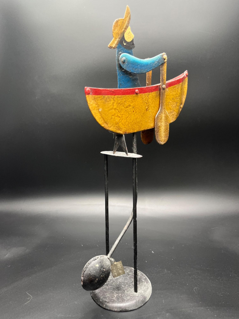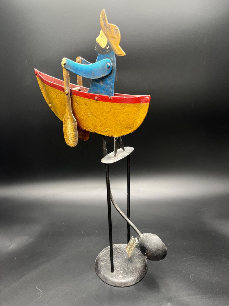 Vintage Authentic Models 2001 Kinetic Balancing Man Rowing Boat Metal Toy Metal kinetic balancing toy by Authentic Models, dated 2001. Features a hand-painted figure in a yellow and red rowboat, with articulated arms holding oars and a wide-brimmed hat. Mounted on a dual-rod stand with a counterweight mechanism that allows the boat to rock in motion. Includes original metal tag marked “AM 2001 SM0294.” Dimensions: