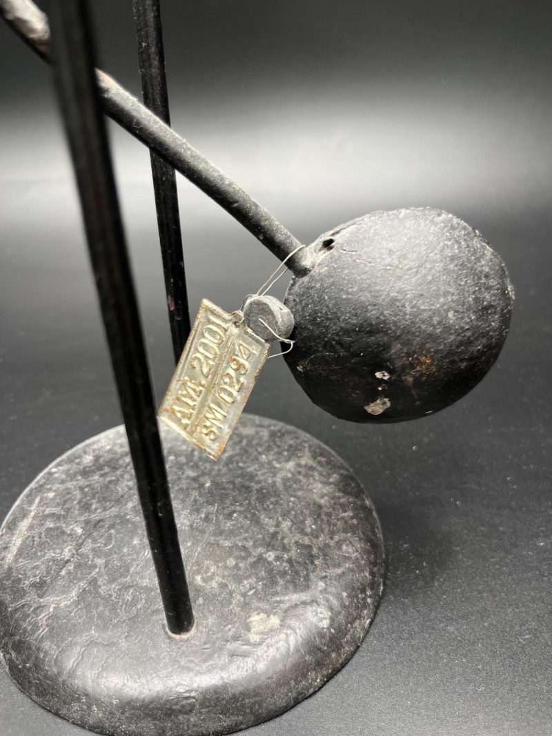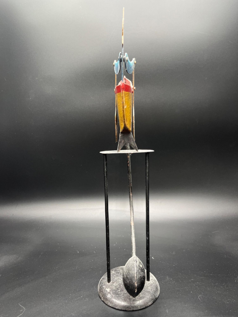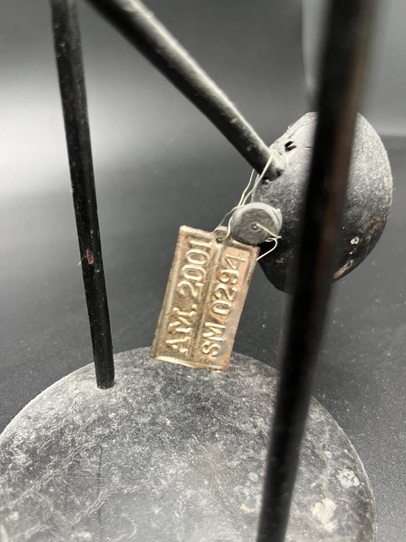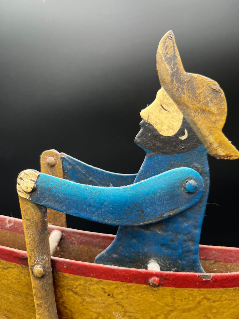 Vintage Authentic Models 2001 Kinetic Balancing Man Rowing Boat Metal Toy Metal kinetic balancing toy by Authentic Models, dated 2001. Features a hand-painted figure in a yellow and red rowboat, with articulated arms holding oars and a wide-brimmed hat. Mounted on a dual-rod stand with a counterweight mechanism that allows the boat to rock in motion. Includes original metal tag marked “AM 2001 SM0294.” Dimensions: