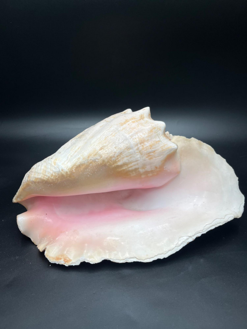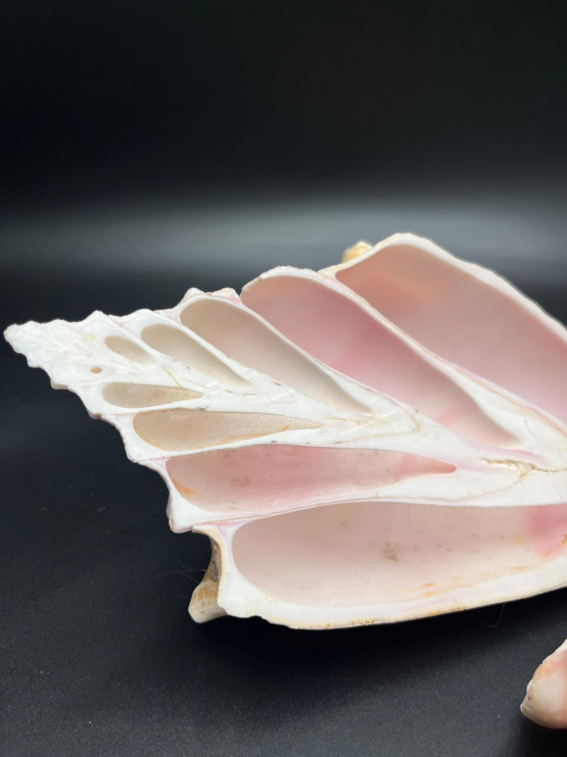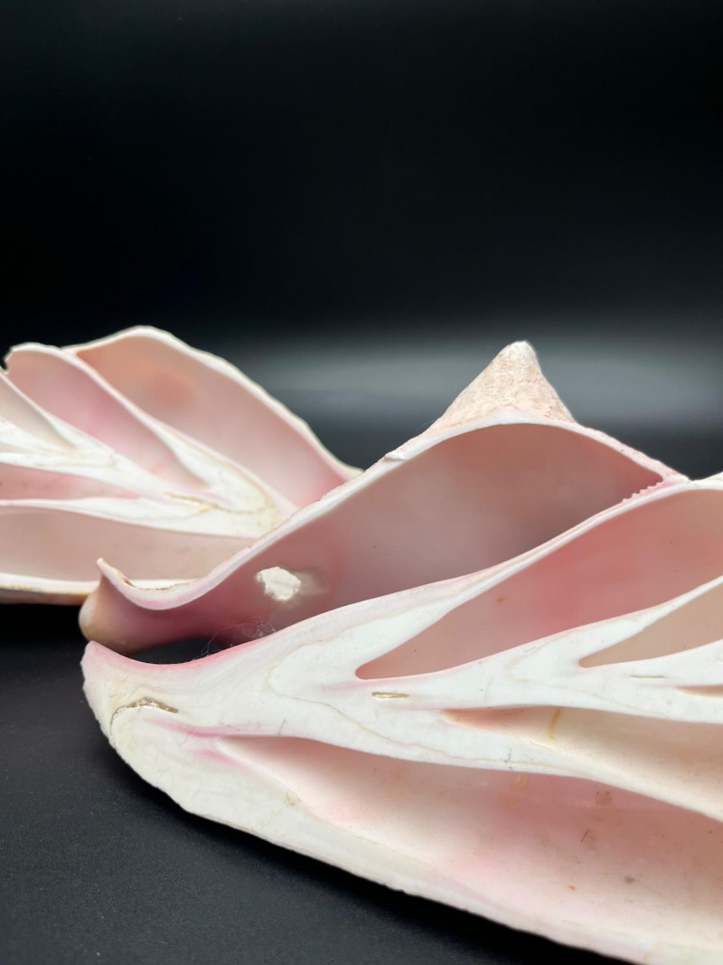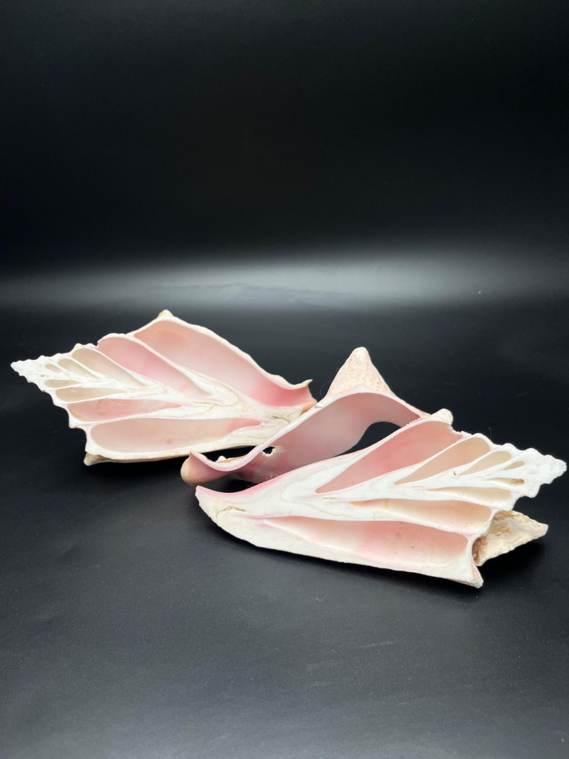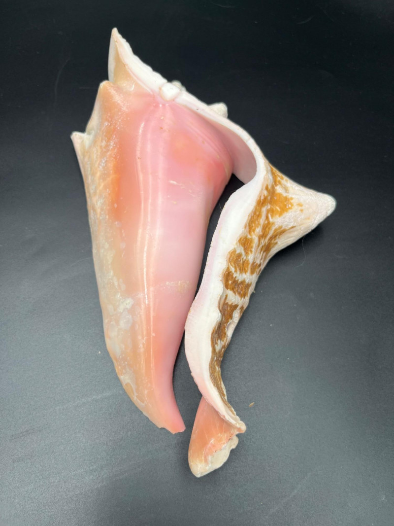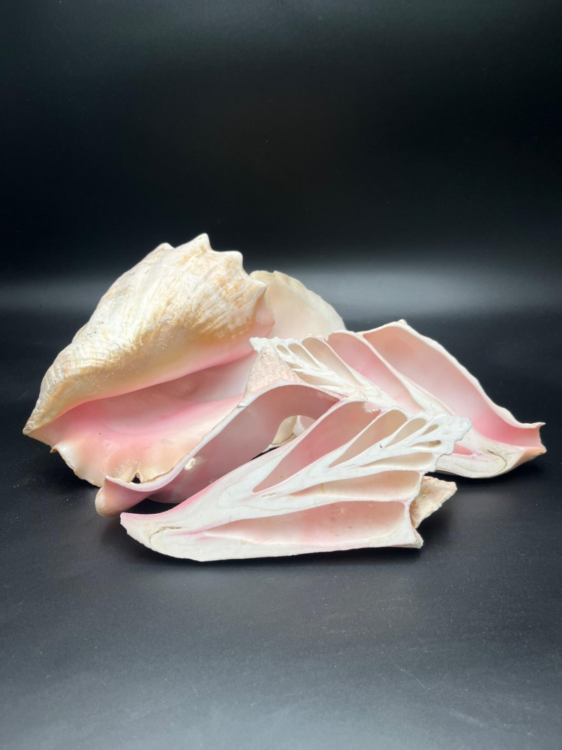 Conch Shell and Halved Shell Display A display featuring one complete conch shell alongside a carved halved shell showing its interior structure. The complete shell presents a natural exterior with a flared lip and spiraled point. The halved shell is sectioned to reveal the inner pink-toned whorls and ridges. Dimensions: