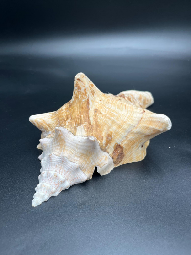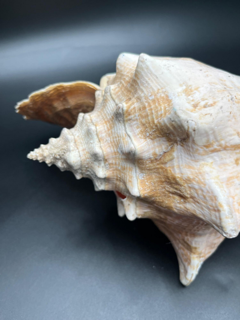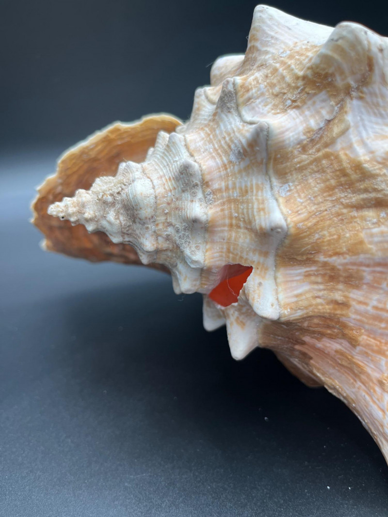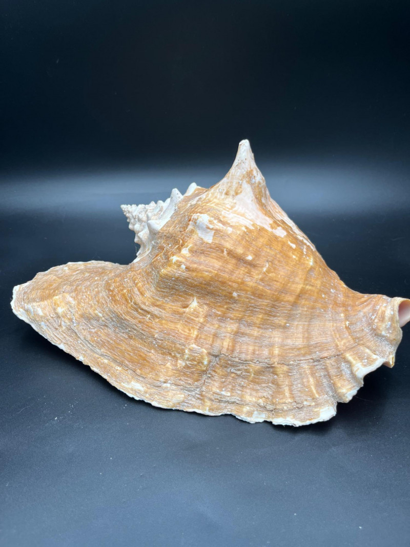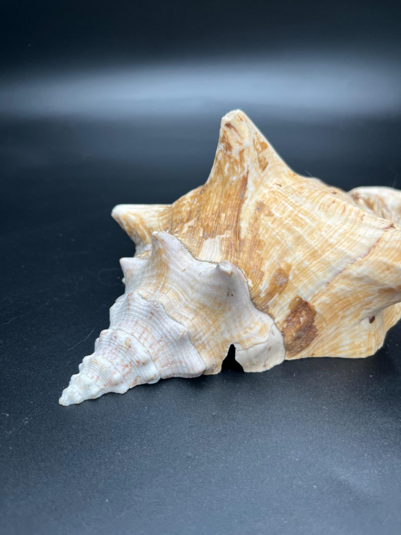 Conch Shell and Halved Shell Display A display featuring one complete conch shell alongside a carved halved shell showing its interior structure. The complete shell presents a natural exterior with a flared lip and spiraled point. The halved shell is sectioned to reveal the inner pink-toned whorls and ridges. Dimensions: