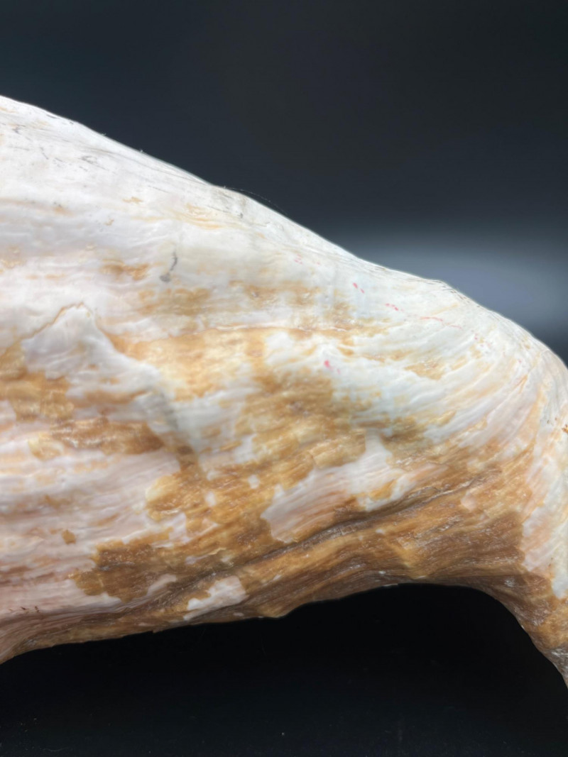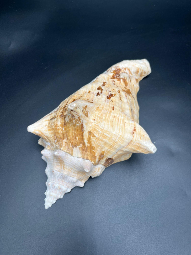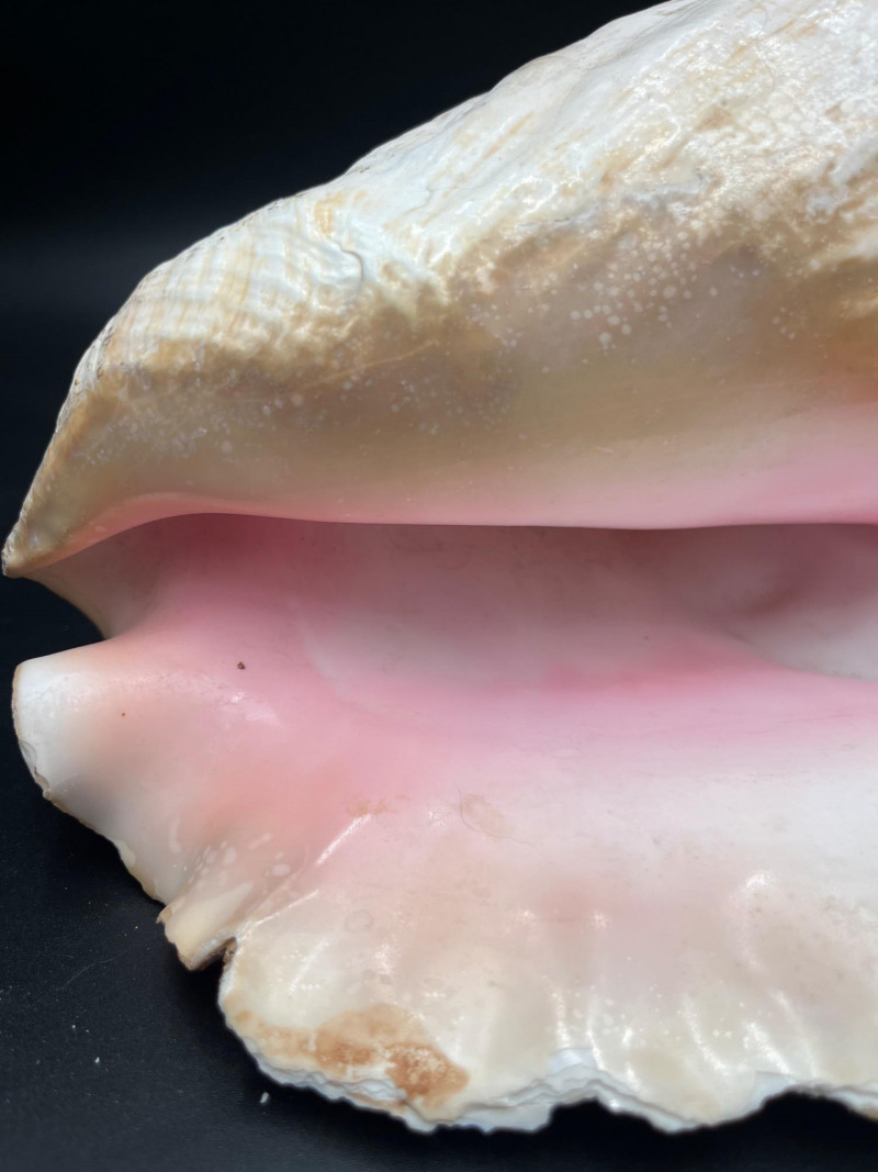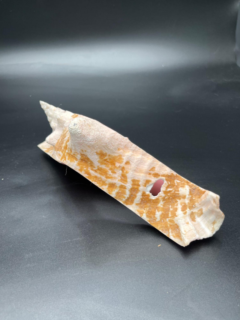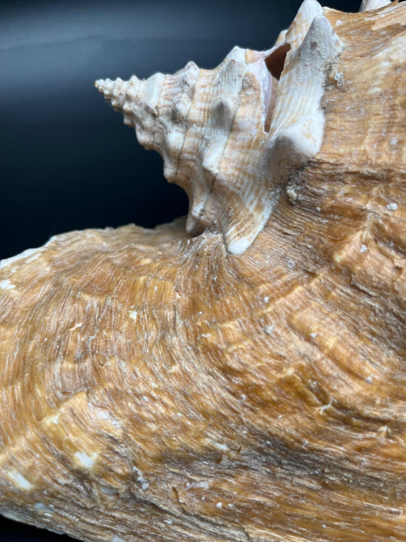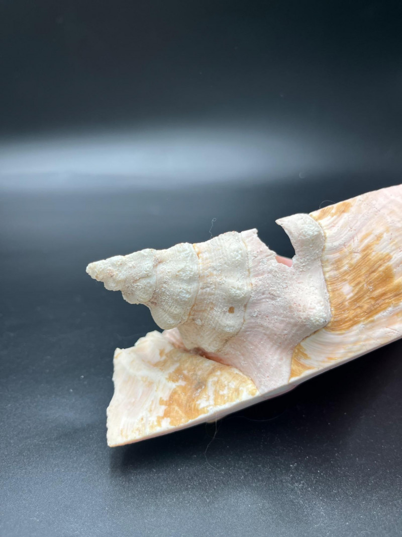 Conch Shell and Halved Shell Display A display featuring one complete conch shell alongside a carved halved shell showing its interior structure. The complete shell presents a natural exterior with a flared lip and spiraled point. The halved shell is sectioned to reveal the inner pink-toned whorls and ridges. Dimensions: