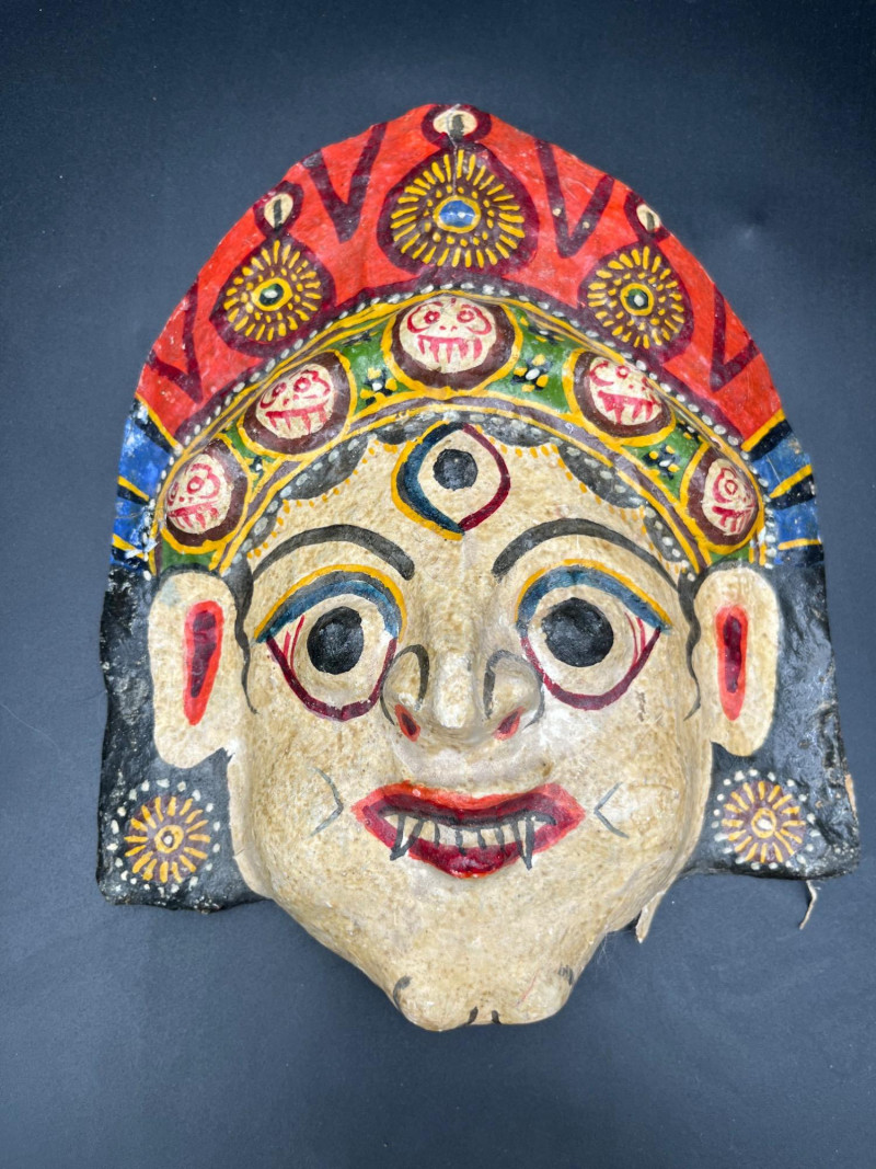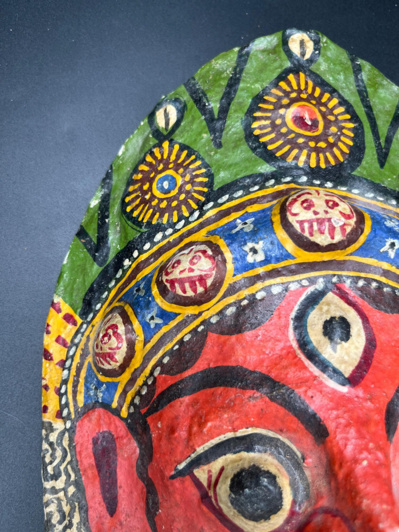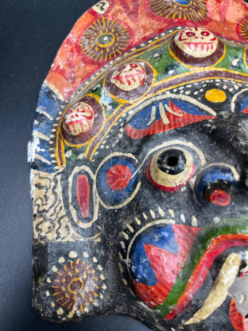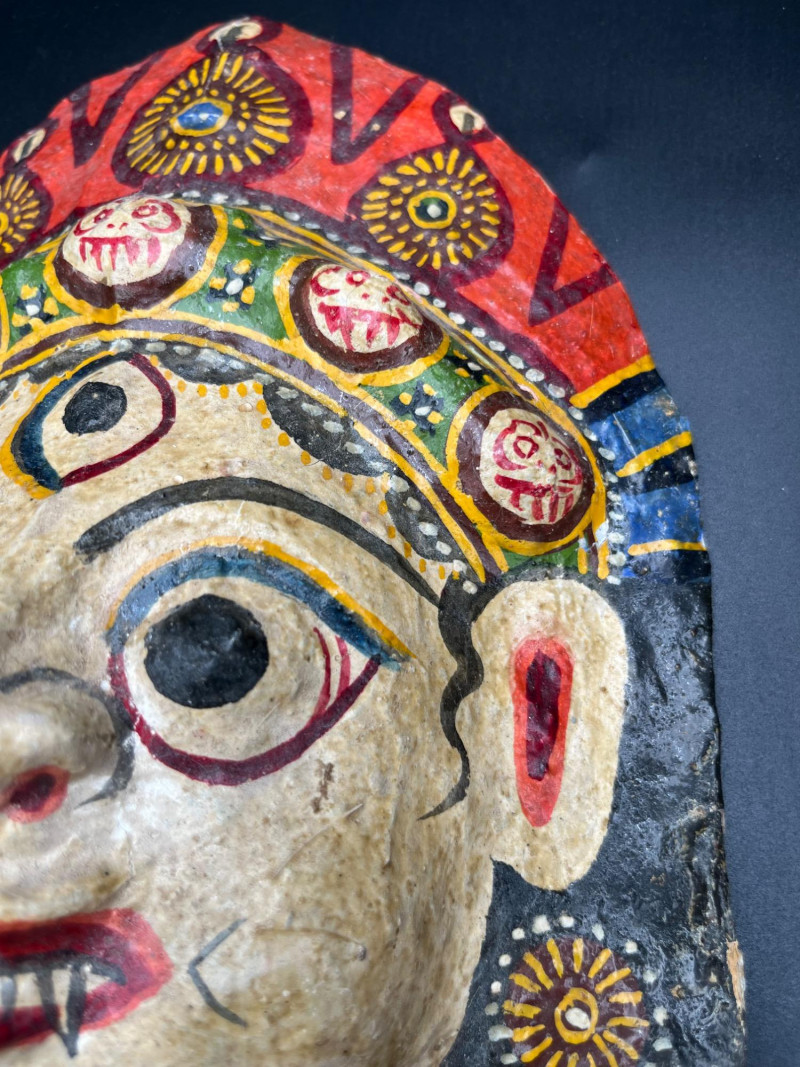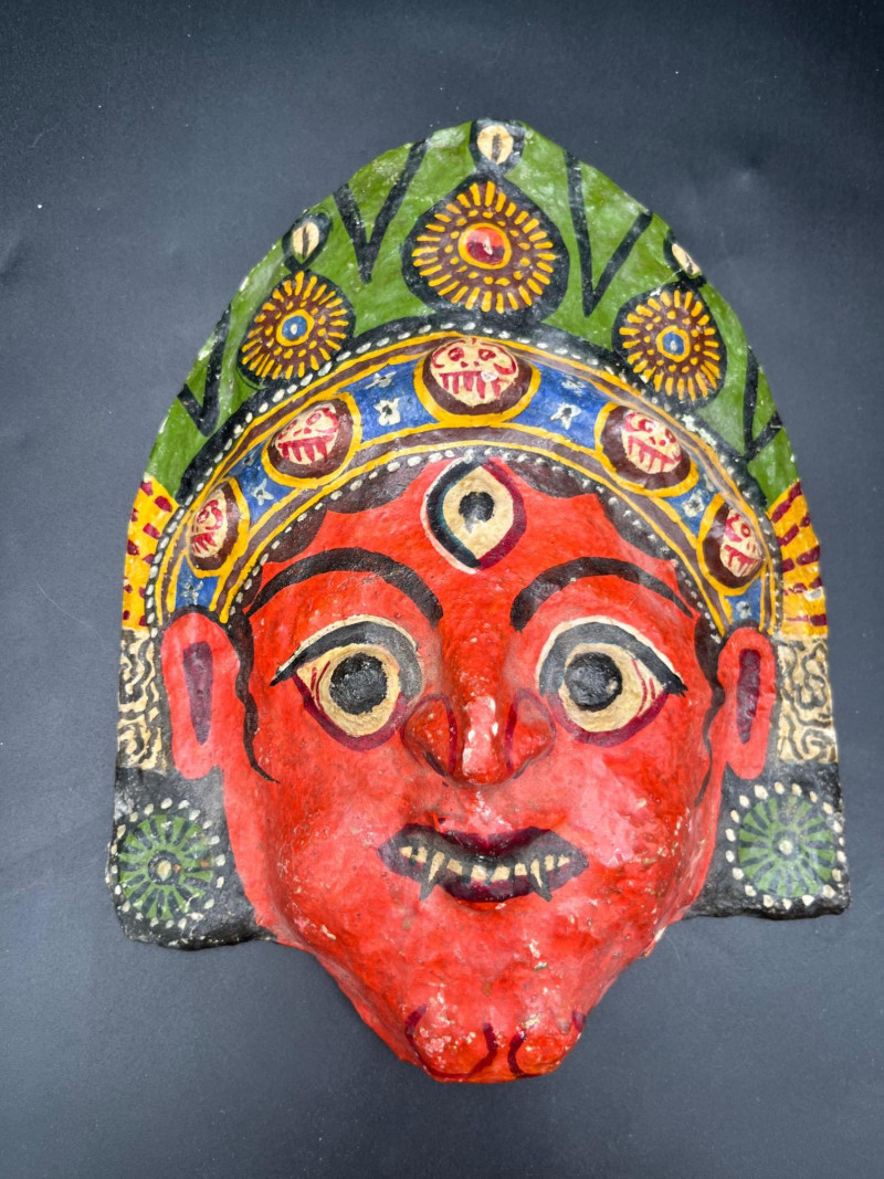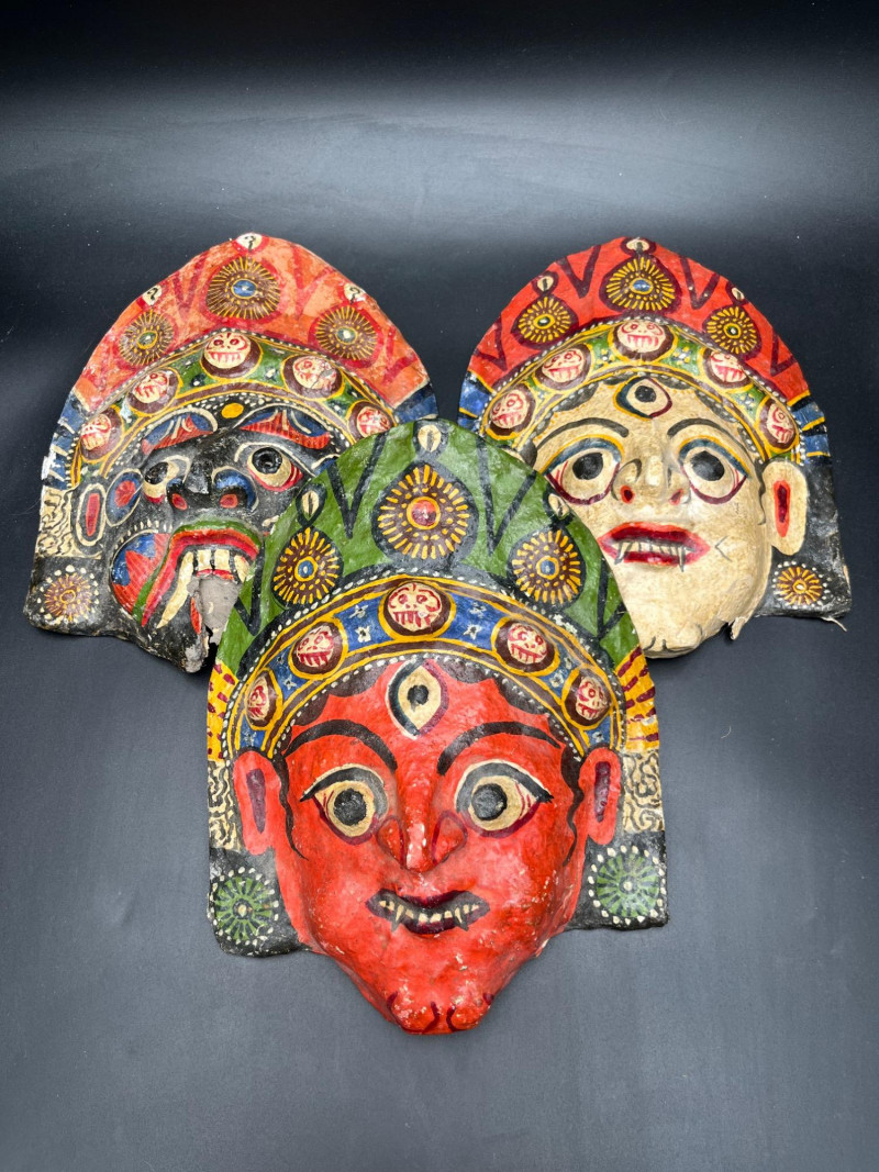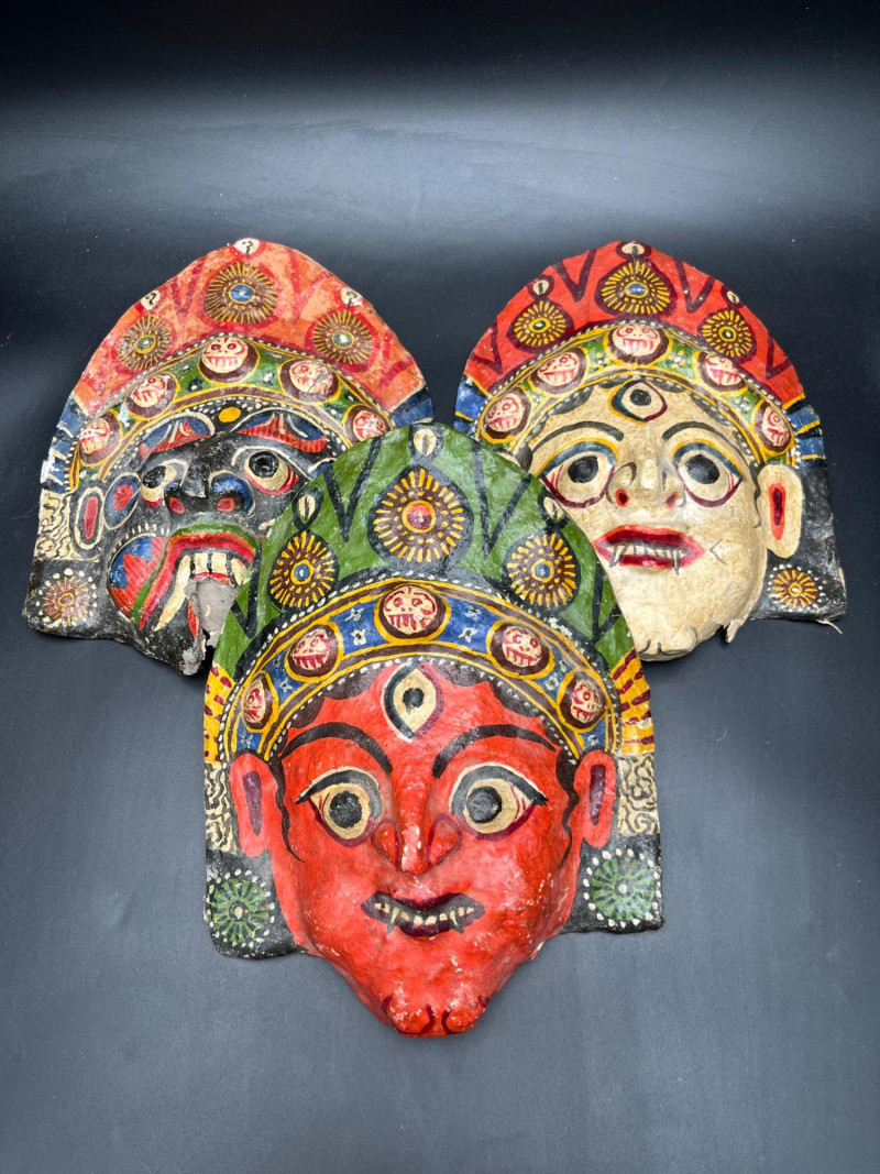 Handmade Nepalese Paper Mâché Masks – Kali & Mahakala Wall Art Set of three hand-formed paper mâché masks from Nepal, each painted with traditional imagery using natural pigments. Figures include representations of Kali, Mahakala, and other Himalayan deities. Crafted for wall display, ritual use, or inclusion in cultural art collections. Material: Paper mâché, natural pigment Measurements: