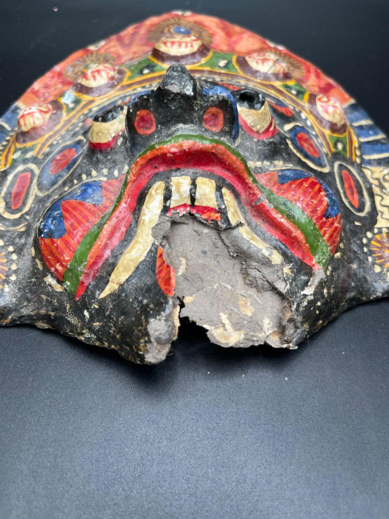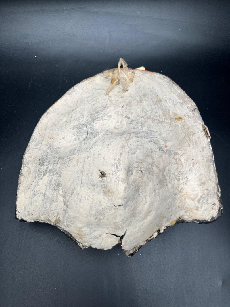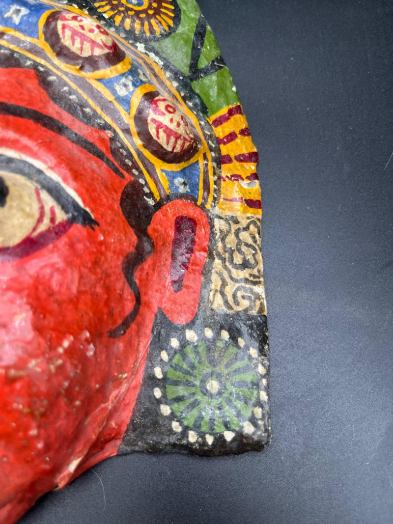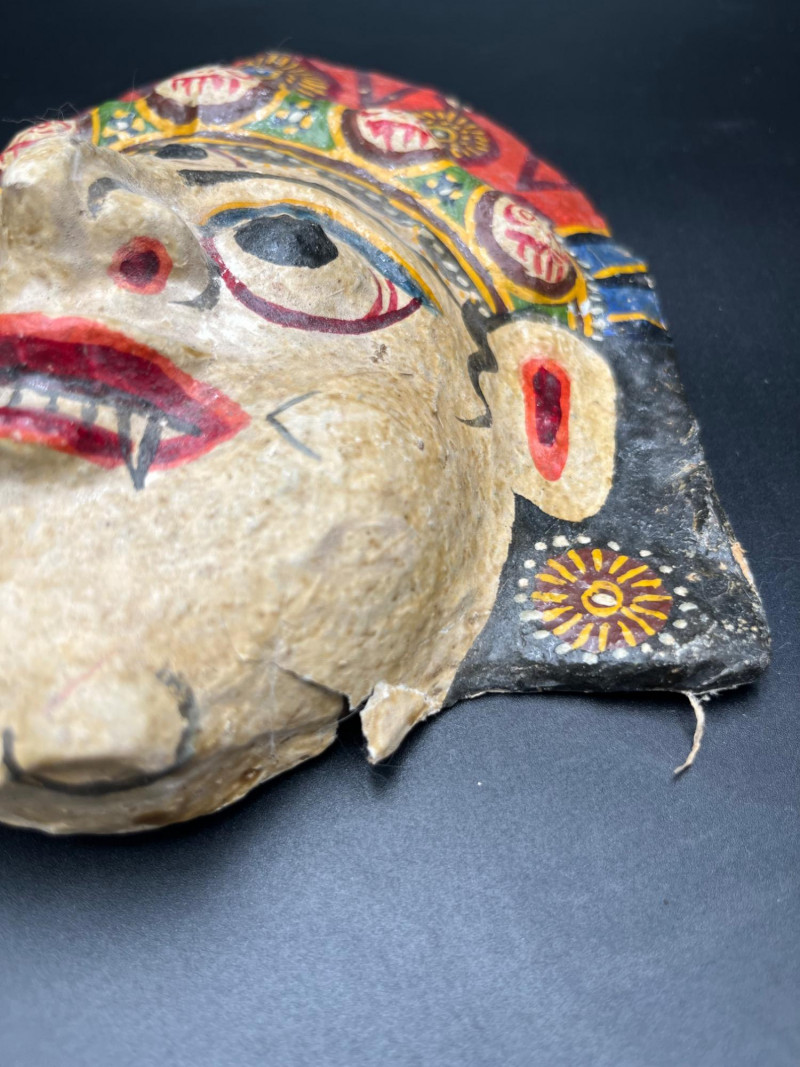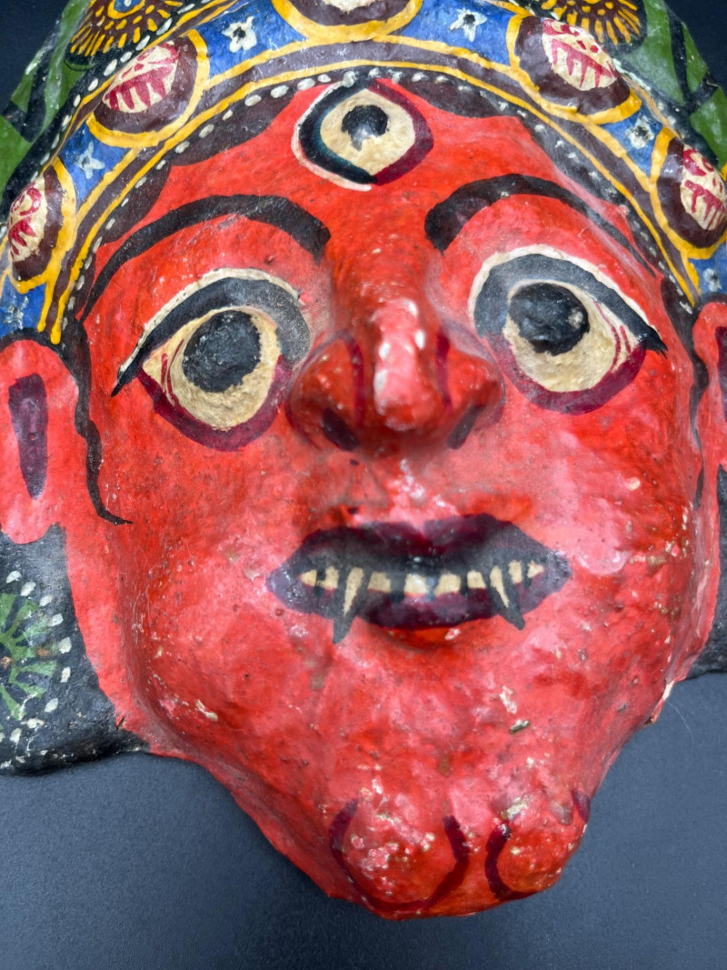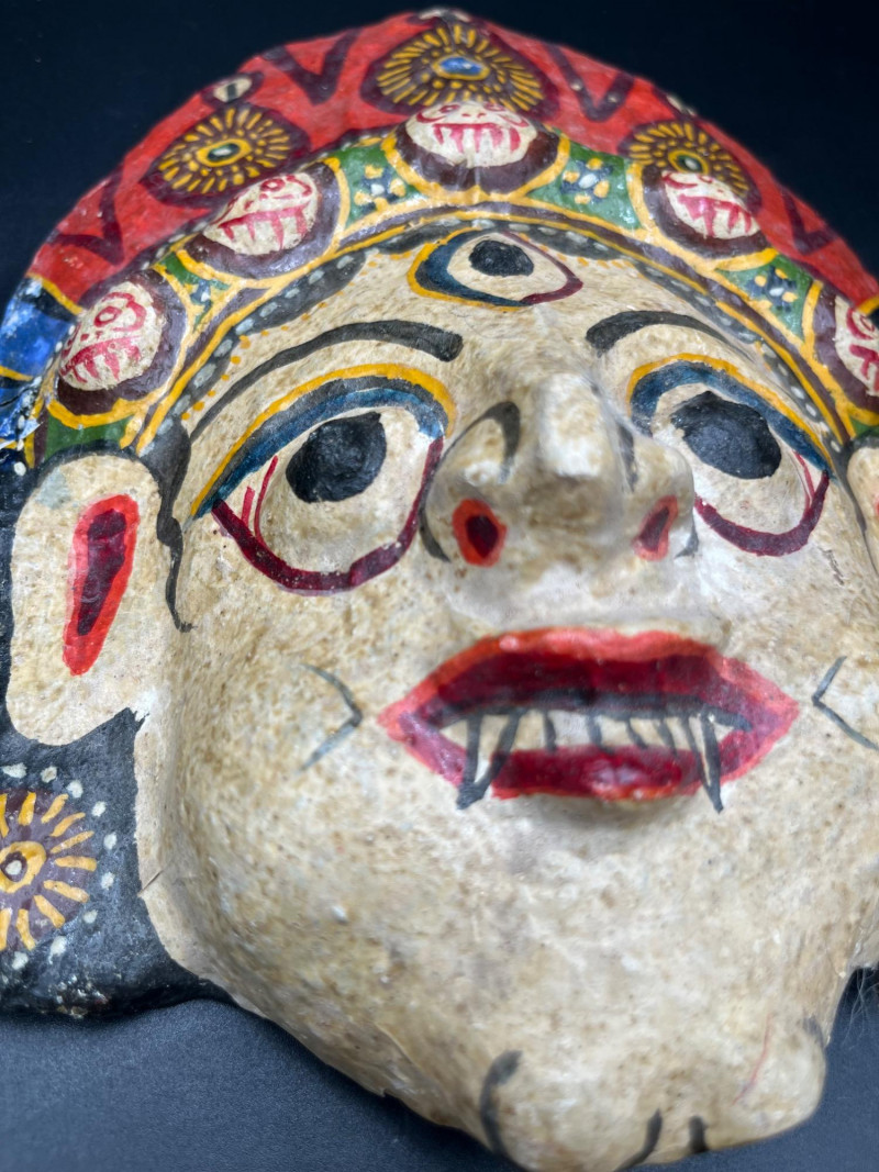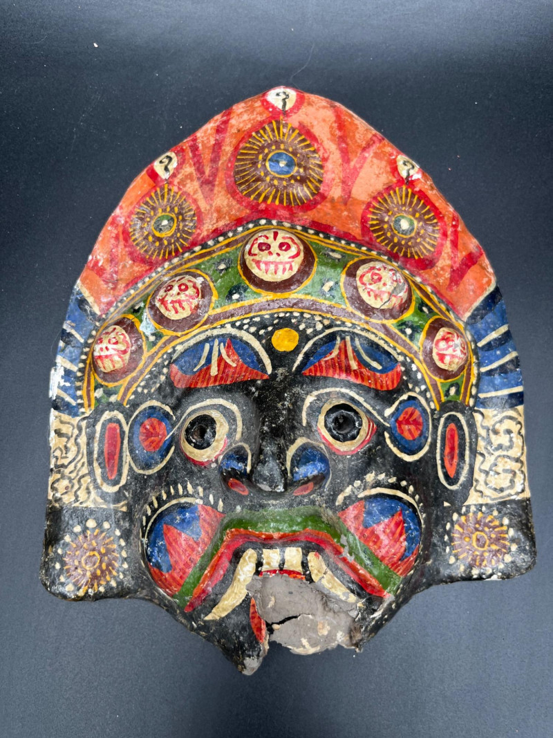 Handmade Nepalese Paper Mâché Masks – Kali & Mahakala Wall Art Set of three hand-formed paper mâché masks from Nepal, each painted with traditional imagery using natural pigments. Figures include representations of Kali, Mahakala, and other Himalayan deities. Crafted for wall display, ritual use, or inclusion in cultural art collections. Material: Paper mâché, natural pigment Measurements: