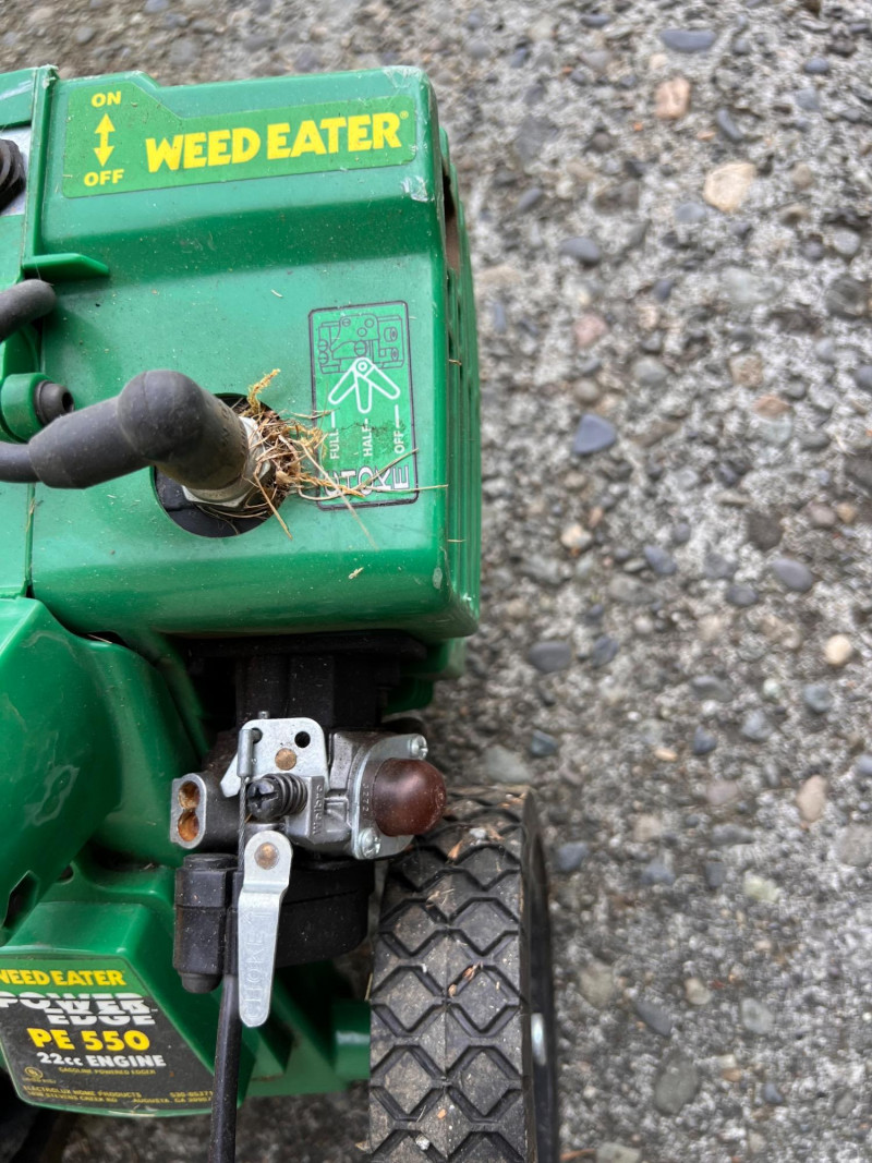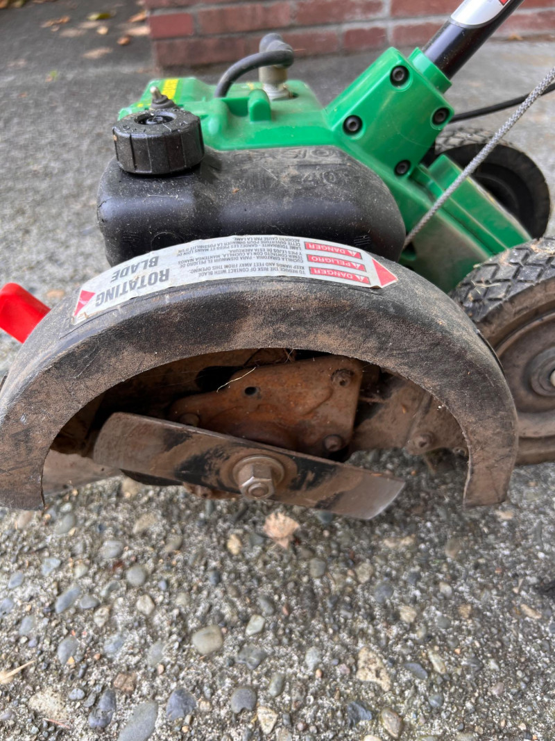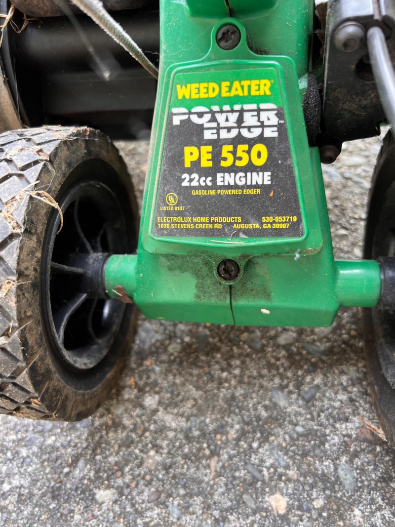 Gas-powered edger with 22cc engine (model PE550), rotating steel blade, and two-wheel frame.