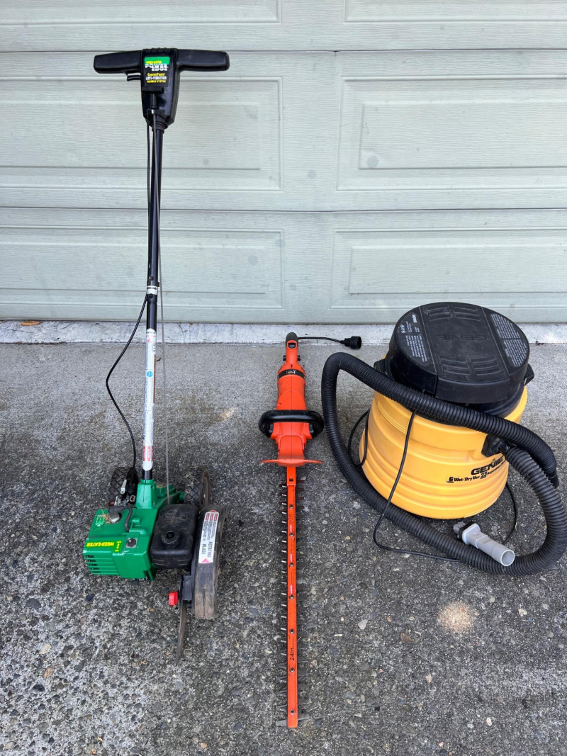 Yard Tools and Vac – Edger, Trimmer, Wet/Dry Vac Set of three yard and utility tools including: – Weed Eater Power Edge Edger – Black+Decker Hedge Trimmer – Genie Wet/Dry Vac