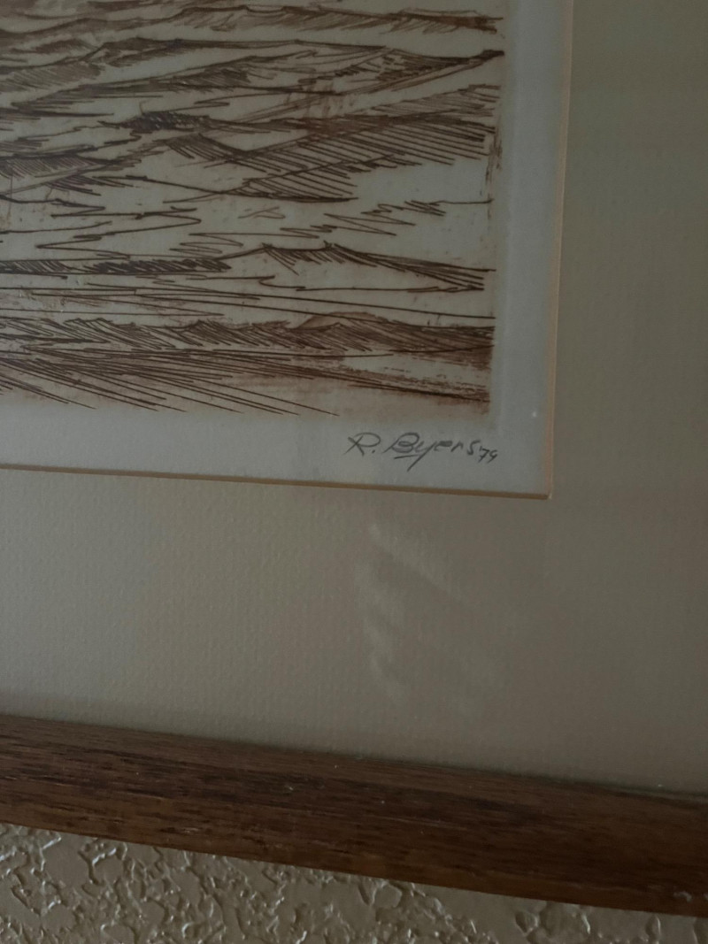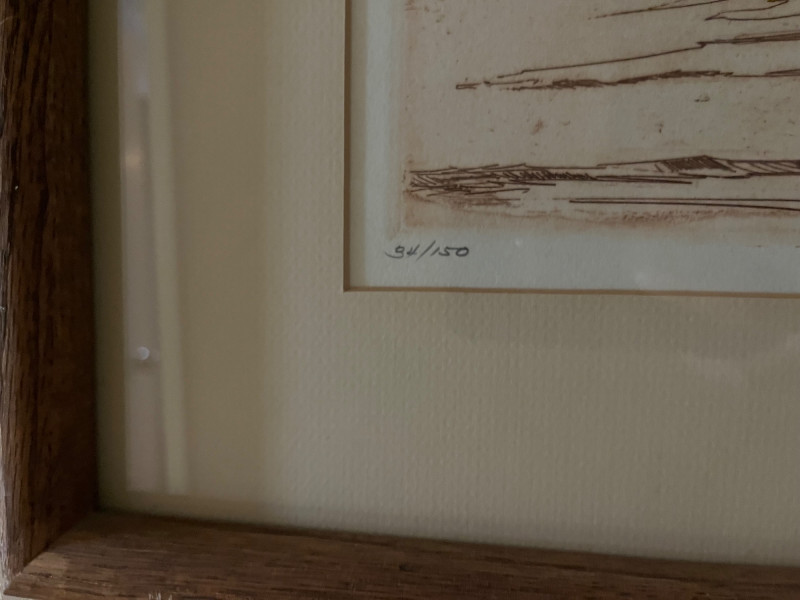 Port Dock of Friday Harbor – 25" x 19" Etching on paper depicting a harbor scene with boats moored at a bustling dock, identified as Friday Harbor. The foreground features rippling water, while detailed boats and structures line the shoreline, including signage reading "Port Dock – Friday Harbor." The work is signed "R. Byers ’79" in the lower right and hand-titled at center. Edition number 94/150 appears at lower left. Medium: Etching on paper