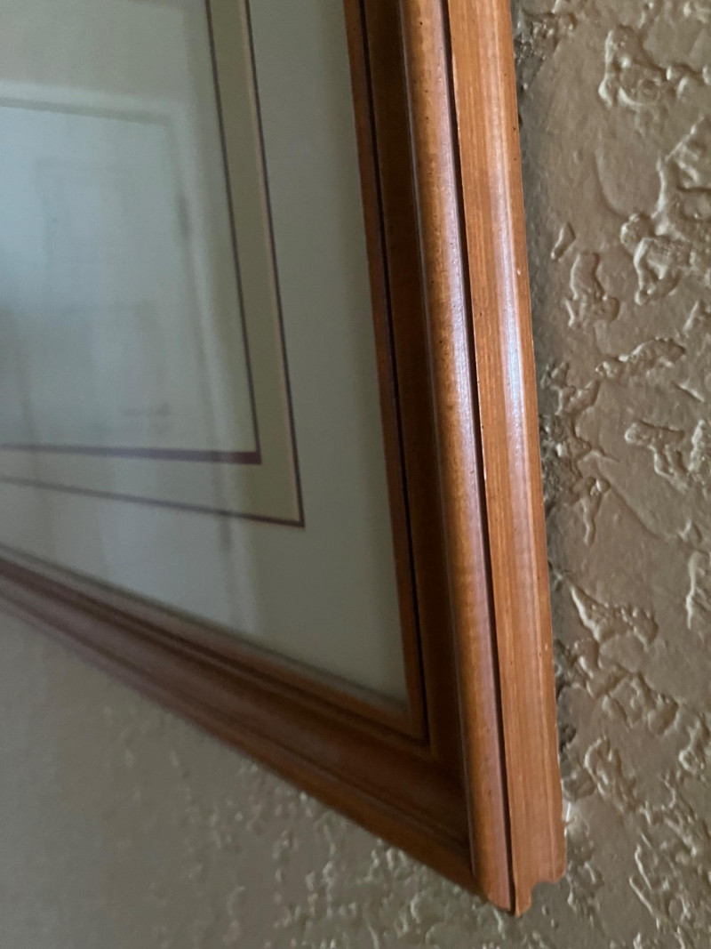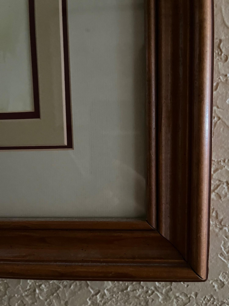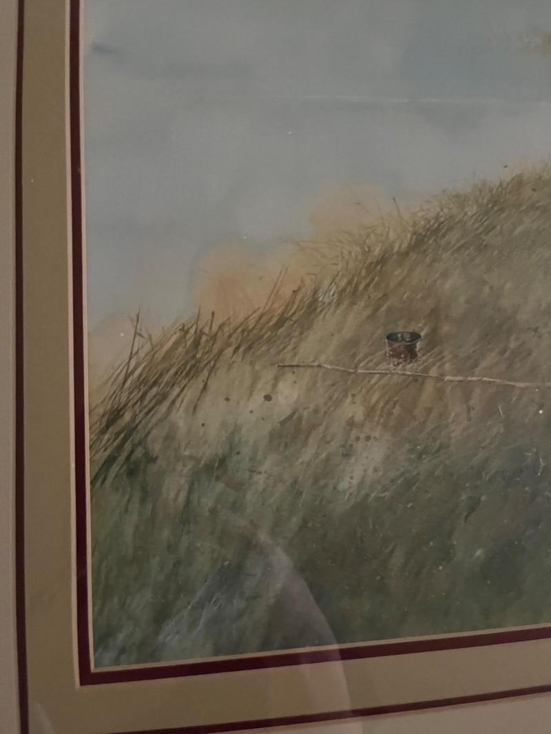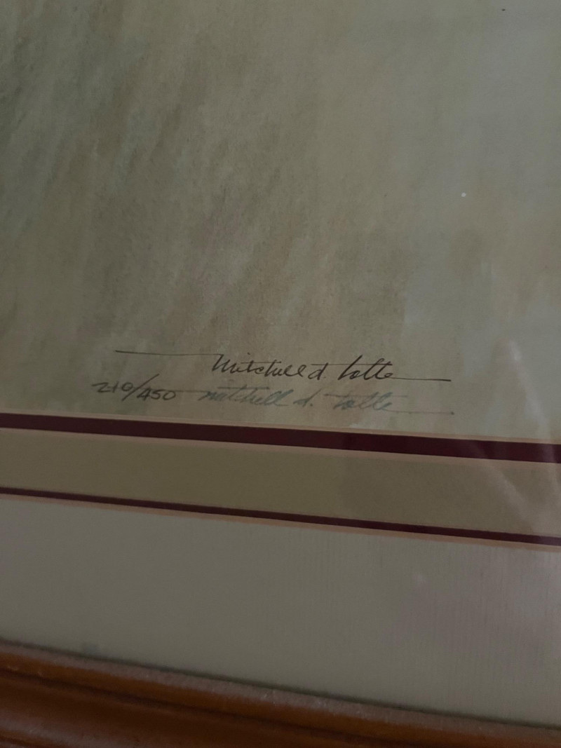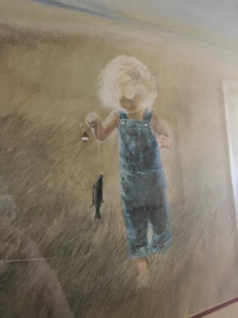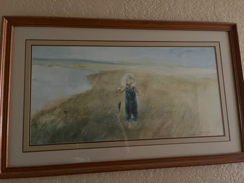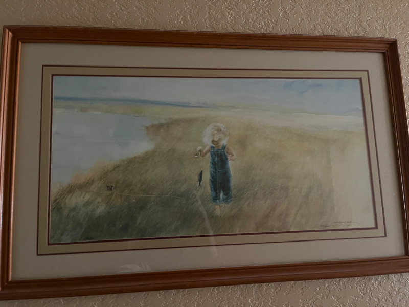 Child with Fish – Mitchell D. Tolle Limited Edition Print (210/450) Framed print depicting a young child standing barefoot in tall grass beside a body of water, holding a fishing line with a small fish. The child wears overalls and appears to be engaged in a quiet moment outdoors. The background shows open fields and sky with soft tonal transitions. Edition number 210/450 is handwritten along the bottom margin, beside the artist’s signature: Mitchell D. Tolle. Dimensions (frame): 38 in W x 23 in H