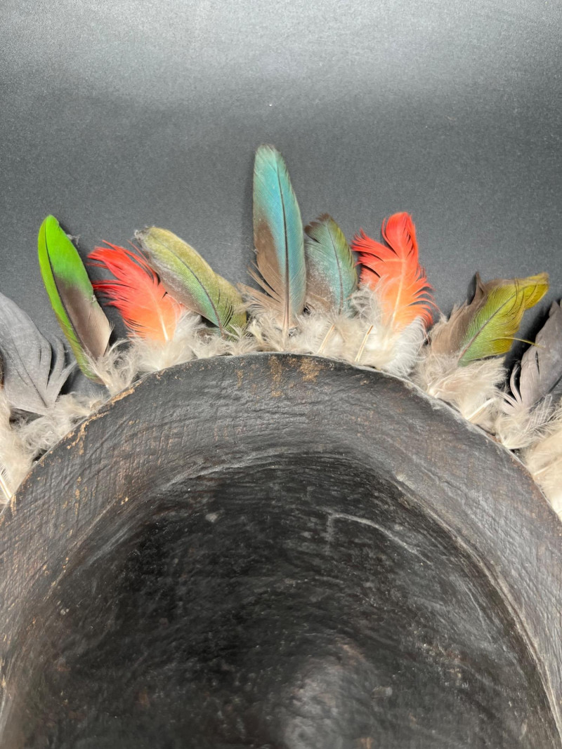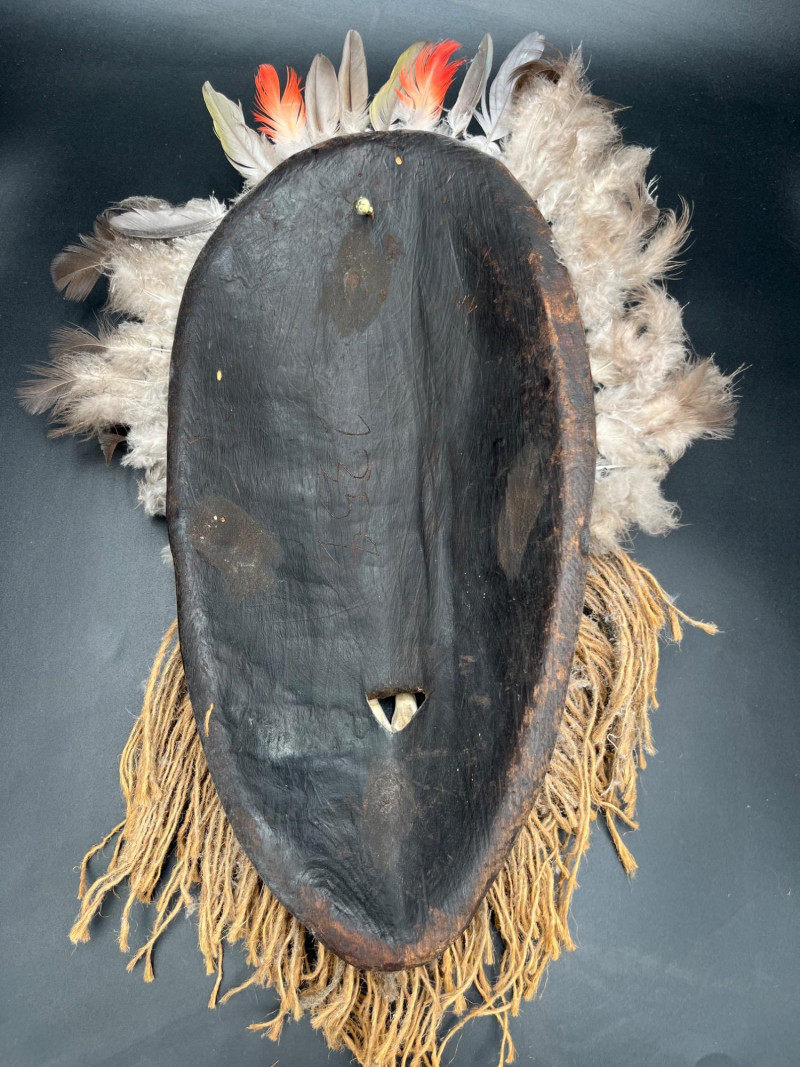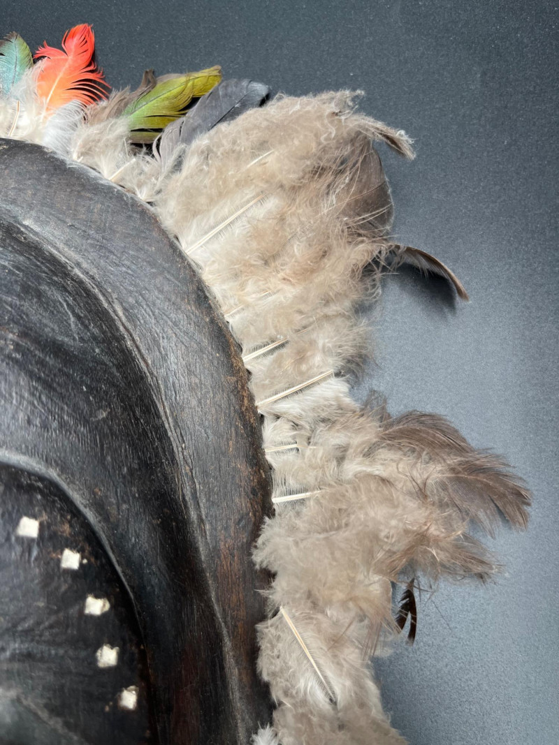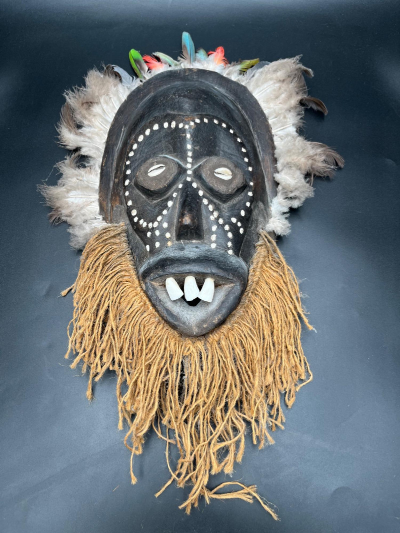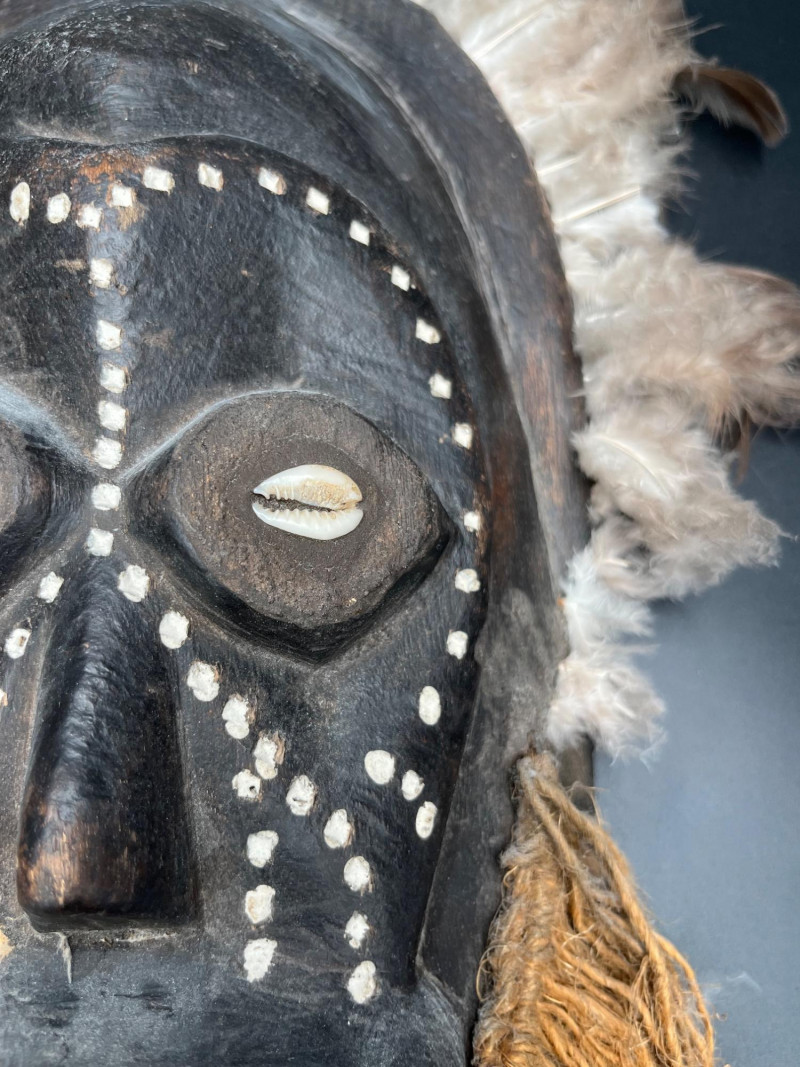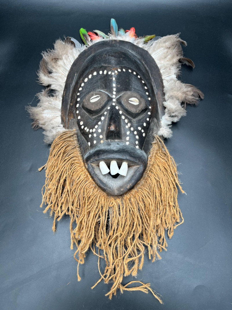 African Tribal Mask with Cowrie Shell Eyes and Raffia Beard Wooden mask with raised brow, deep eye sockets inset with cowrie shells, and a triangular nose. The open mouth holds three white tooth-like inserts. Raffia strands form a beard below the chin. The feathered headdress features white, brown, and a few colored feathers. Approximate dimensions: