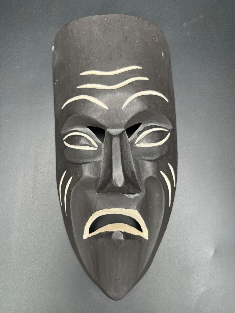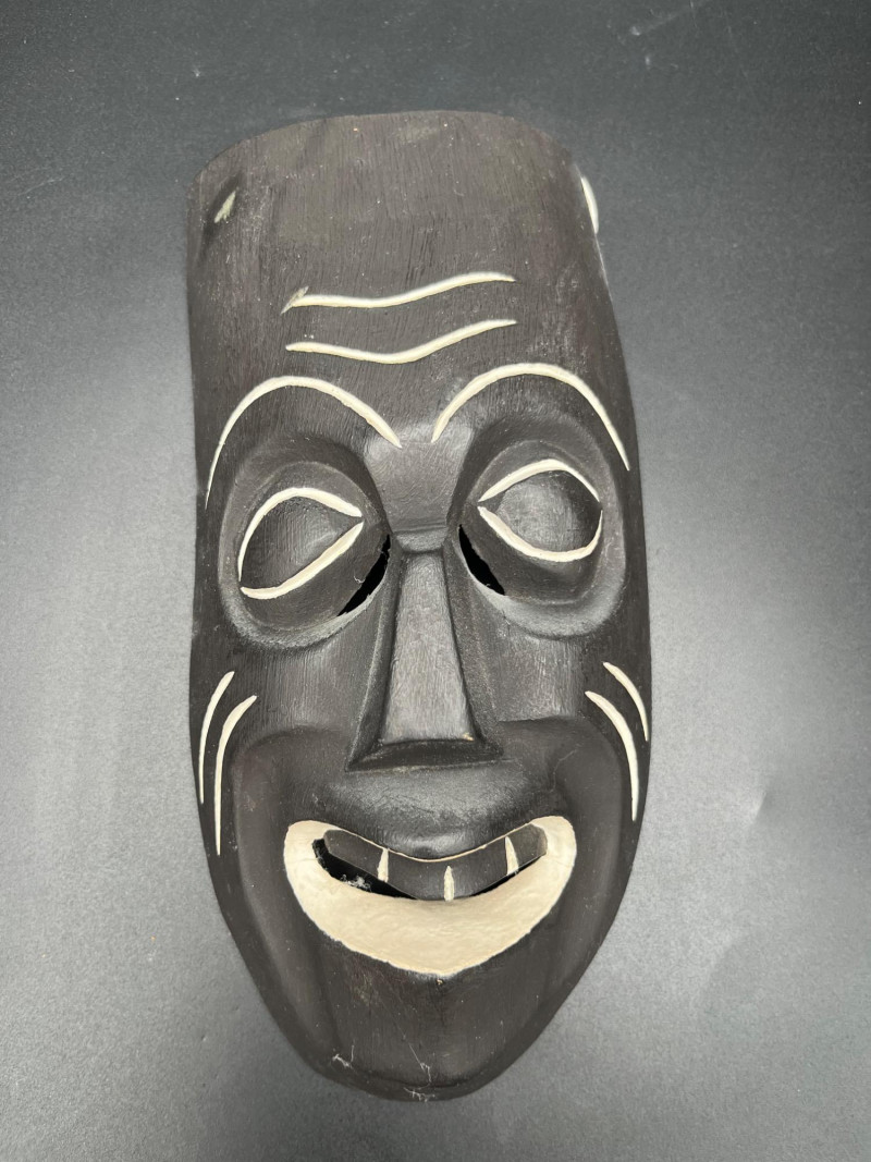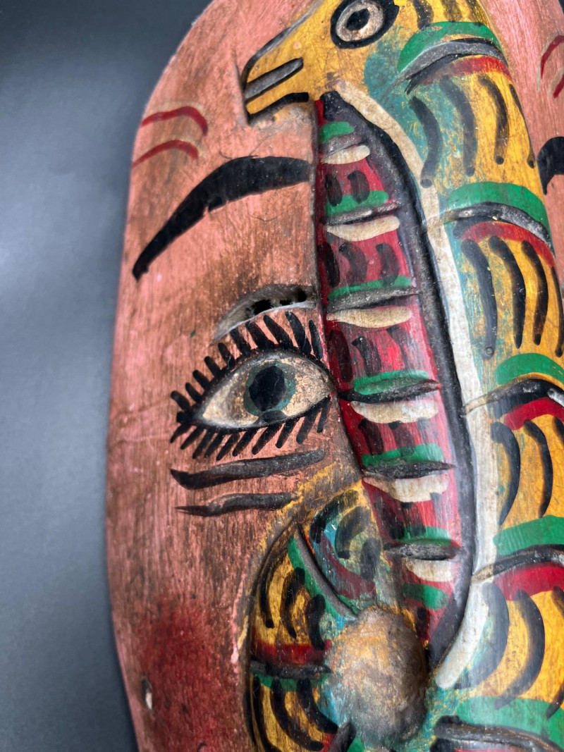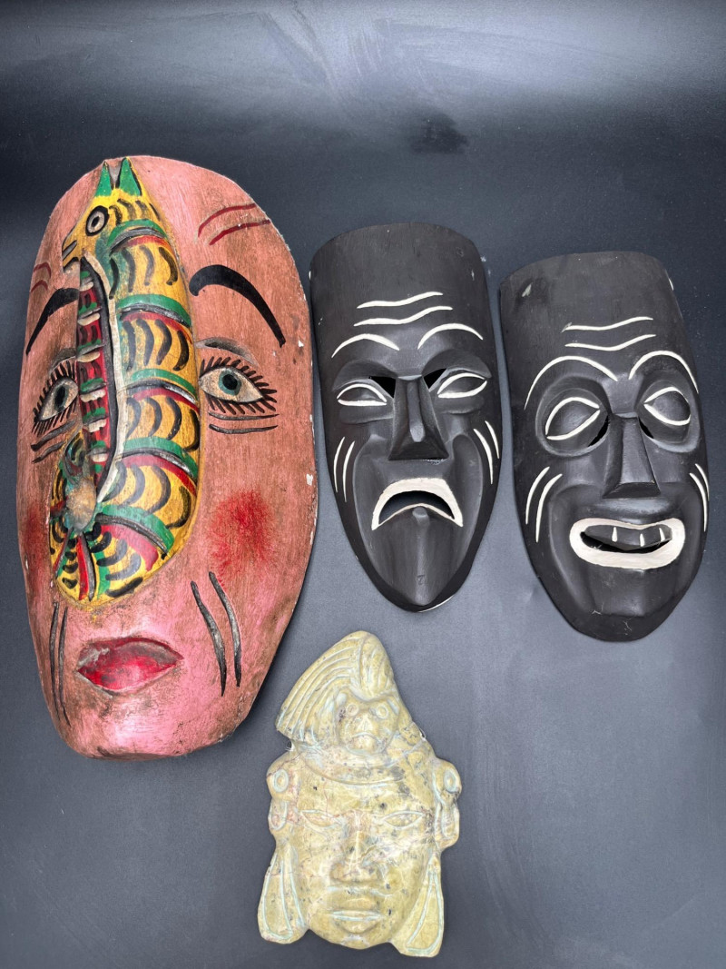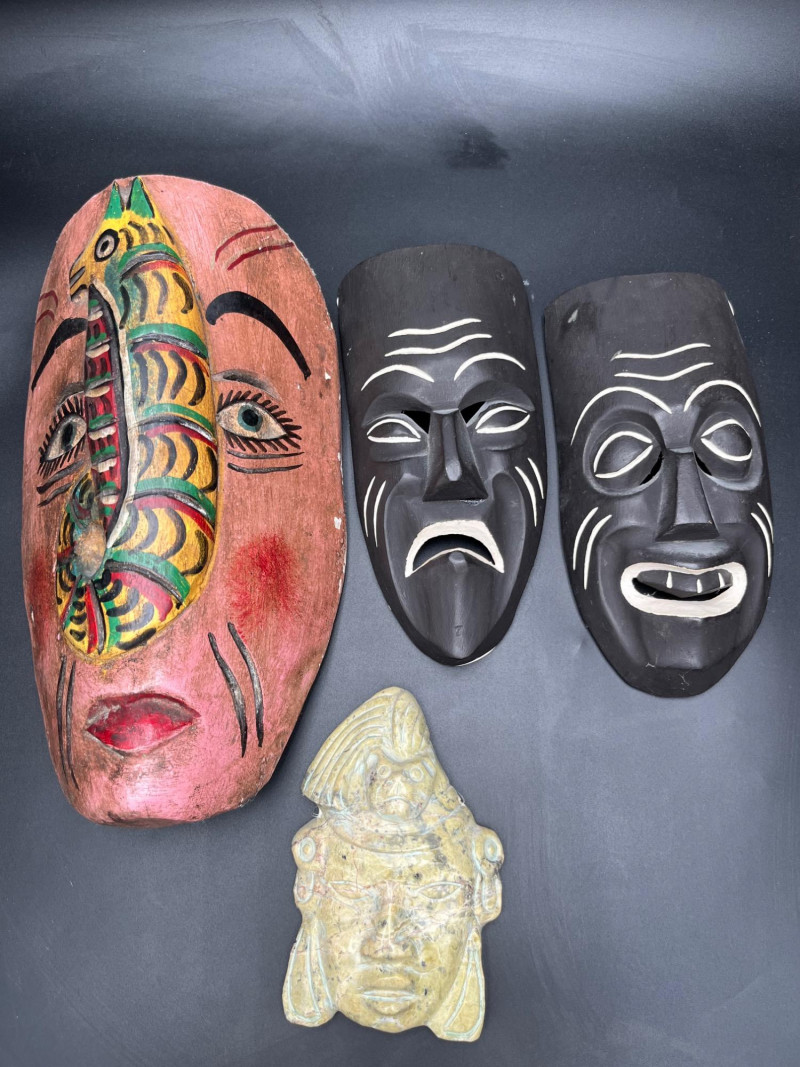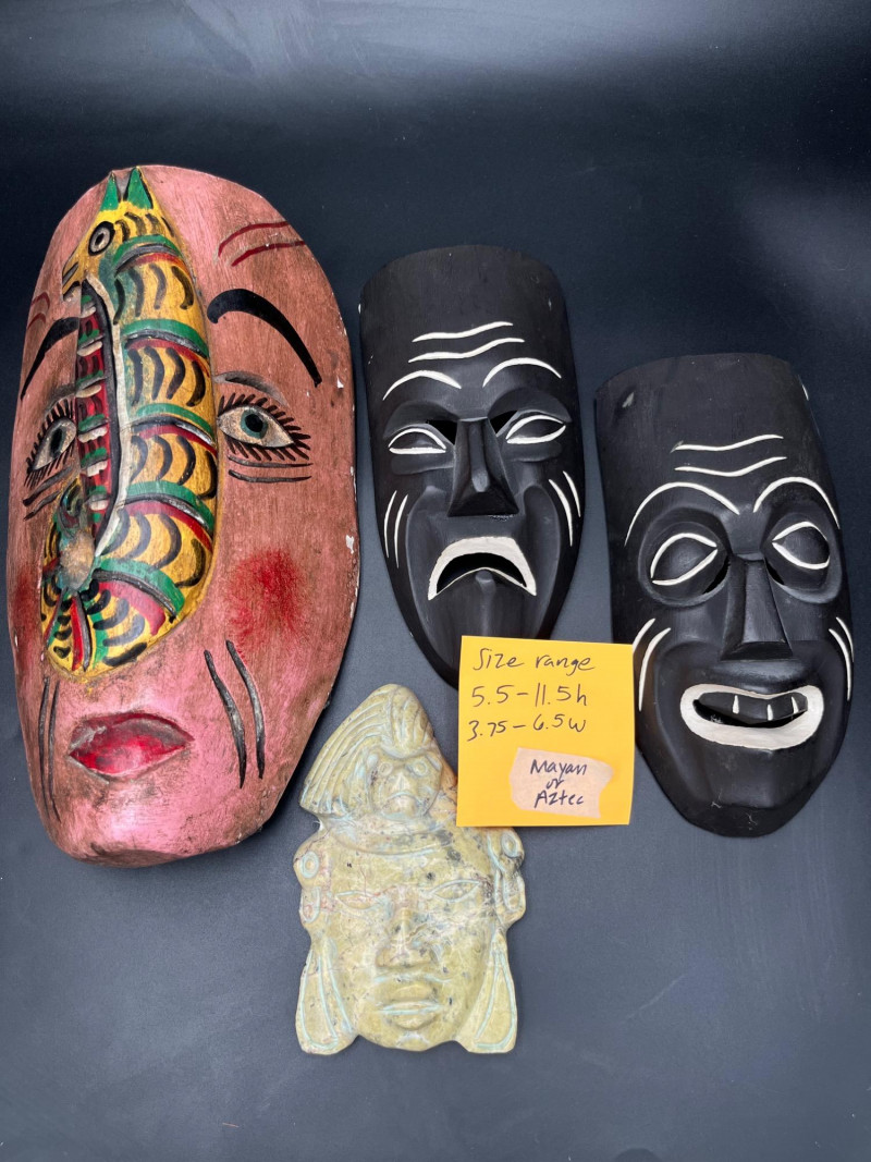 Lot of 4 Handcrafted Ethnic Masks – Carved Wood & Clay, Tribal & Folk Art Description: Features: Lot includes 4 individual masks in mixed materials: wood and clay/ceramic Size range approximately 5.5" to 11.5" tall, 3.75" to 6.5" wide (see photos for scale) Two carved black wood masks with bold white accent lines and dramatic expressions, evoking traditional tribal themes One large painted folk-art mask featuring vibrant colors, stylized facial details, and an eye-catching lizard motif in relief One small sculpted clay or ceramic piece with Mesoamerican-style facial features, possibly inspired by Mayan or Aztec art Highlights: Handcrafted, each piece has unique character and artisanal detail Rich cultural variety—perfect for an eclectic, global aesthetic Great conversation starters for home, office, or gallery walls Ideal for collectors of world art, folk art, and ethnographic décor