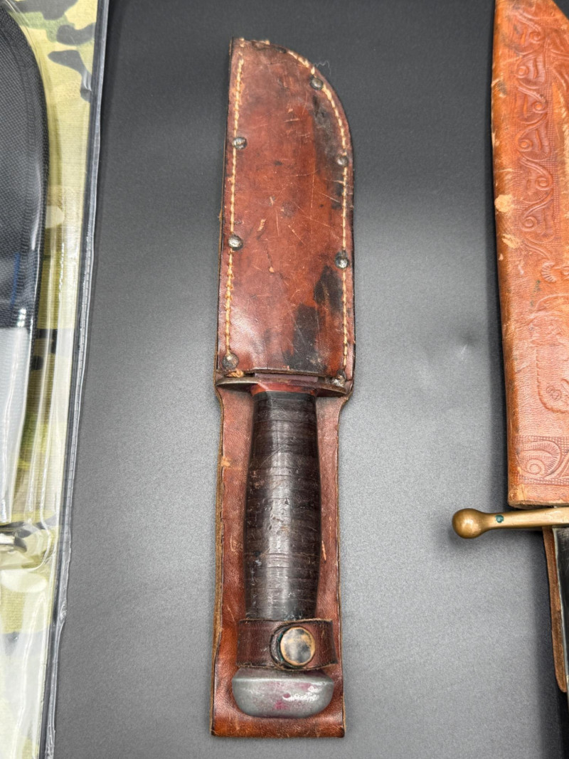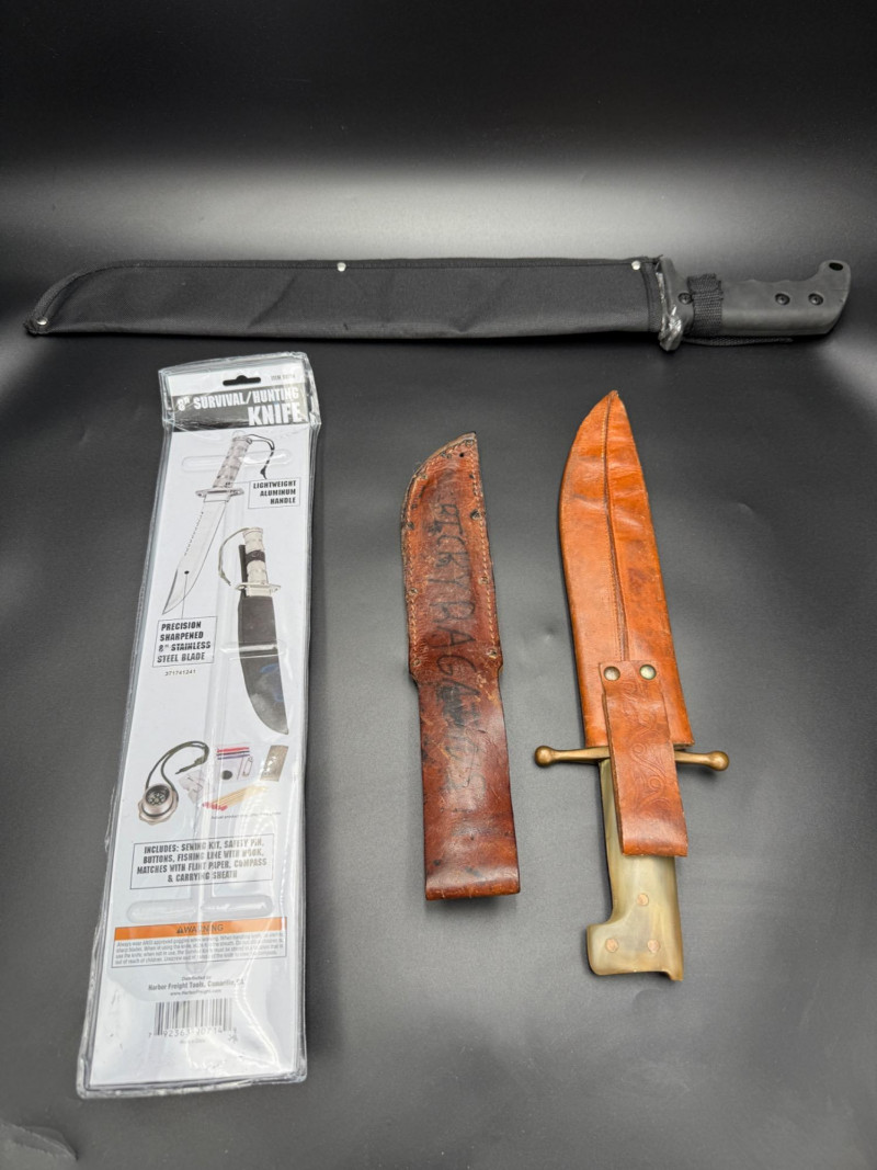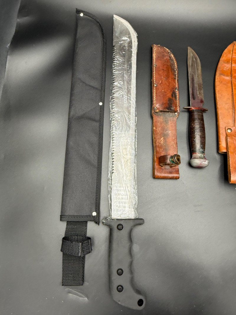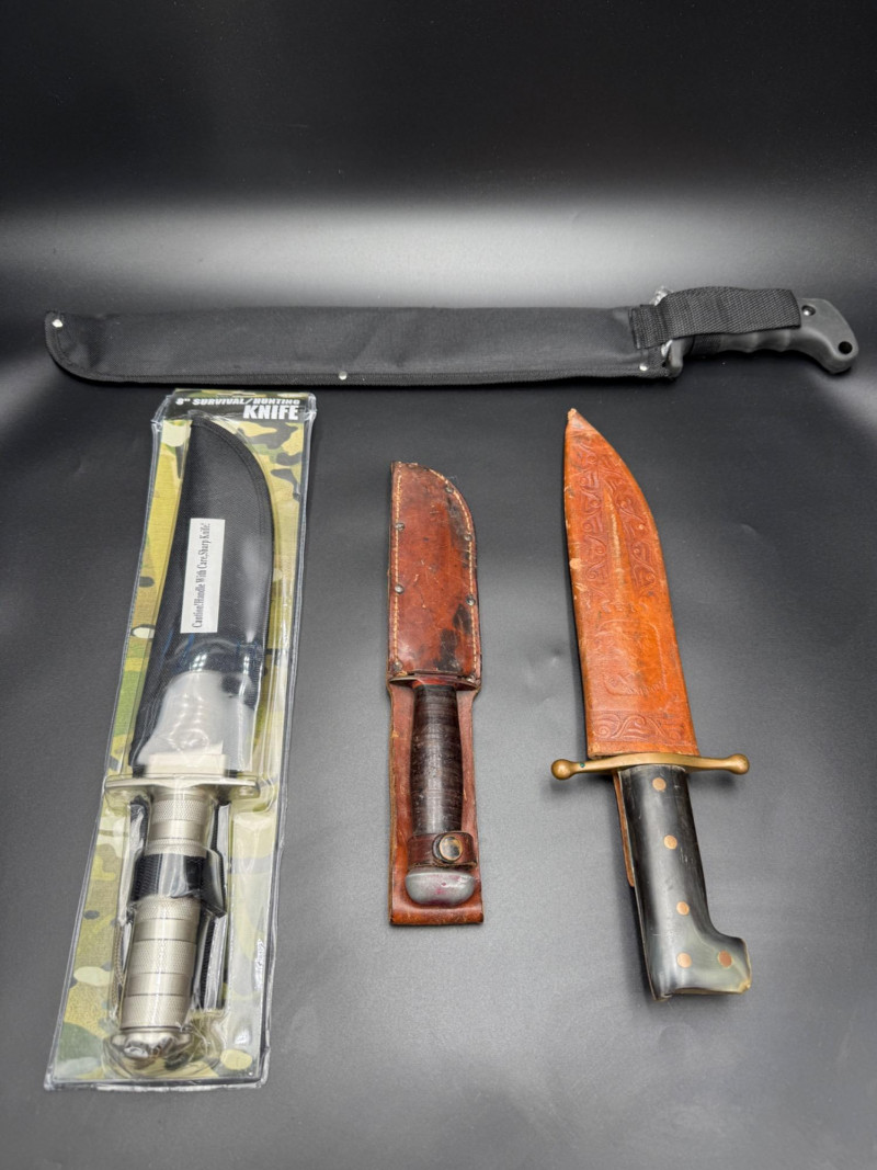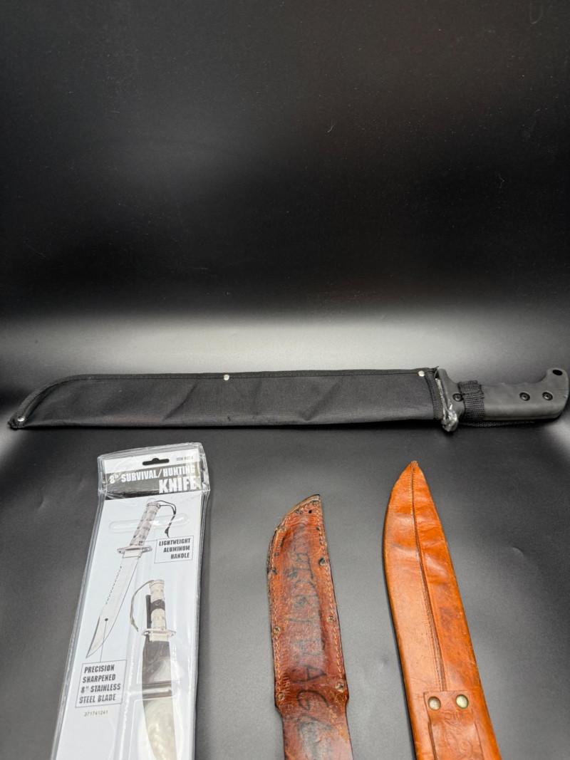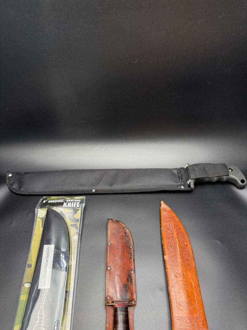 Lot of 4 Knives with Sheaths – Vintage Bowie, Machete, Survival Knife, Leather Handle Description: Lot Includes: Machete with Sheath Long black blade with sawback spine Textured molded handle for secure grip Comes with nylon sheath featuring snap closure Perfect for clearing brush or as an outdoor camp tool Condition: Lightly used with minor scuffs, overall good. 8" Survival/Hunting Knife (IN PACKAGE) Factory-sealed retail packaging Includes nylon sheath Compact design ideal for camping or hunting Condition: Brand new, unopened. Vintage Leather-Handled Hunting Knife Classic stacked leather washer grip Comes with aged brown leather sheath Blade shows wear, patina, and use Approx. 11"–12" range Condition: Well-used with authentic vintage look; sheath has old writing/markings. Cullinan No. 10 Bowie-Style Knife with Leather Sheath Blade stamped “Cullinan, LEGITIMUS MADE IN USA No. 10” Large clip-point bowie design Heavy brass guard with pinned black handle scales Ornate tooled leather sheath Condition: Vintage with visible oxidation, patina, and sheath wear.