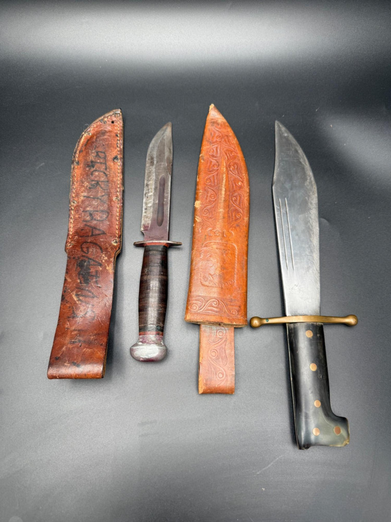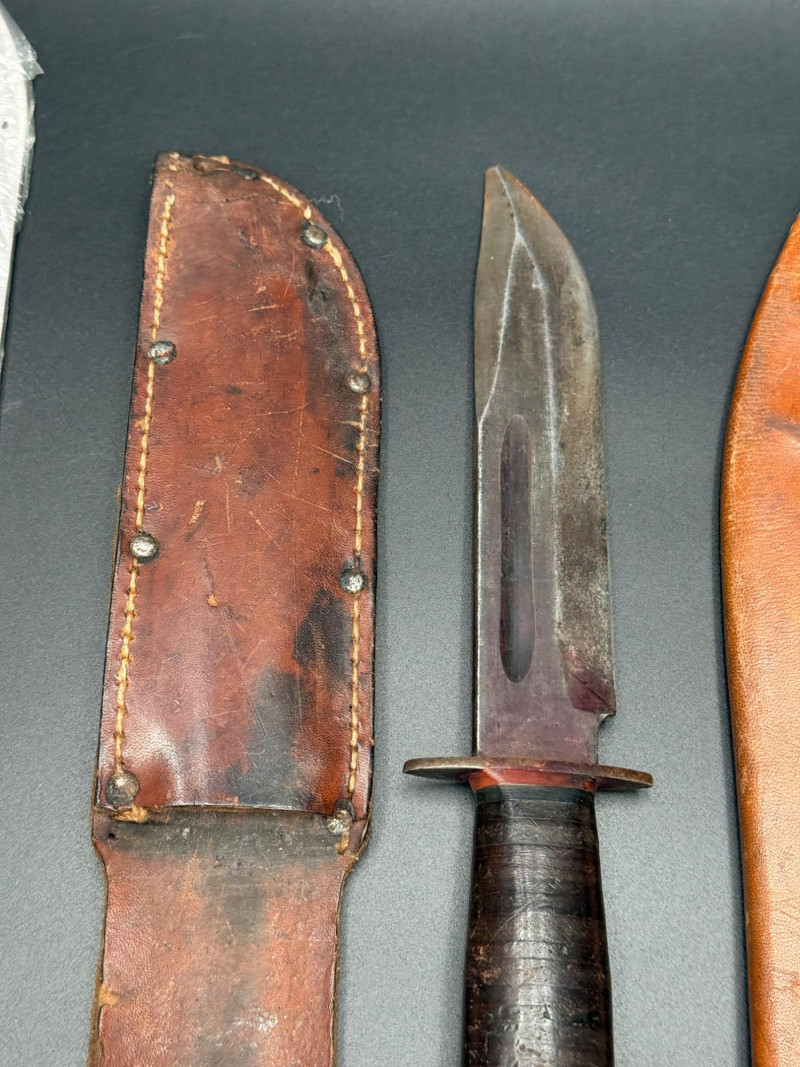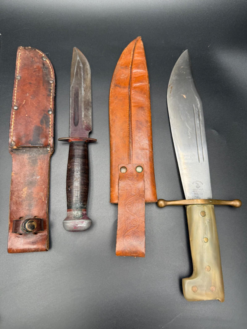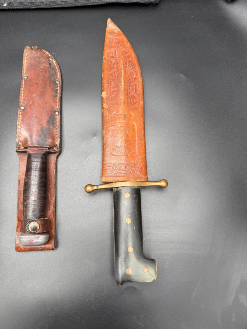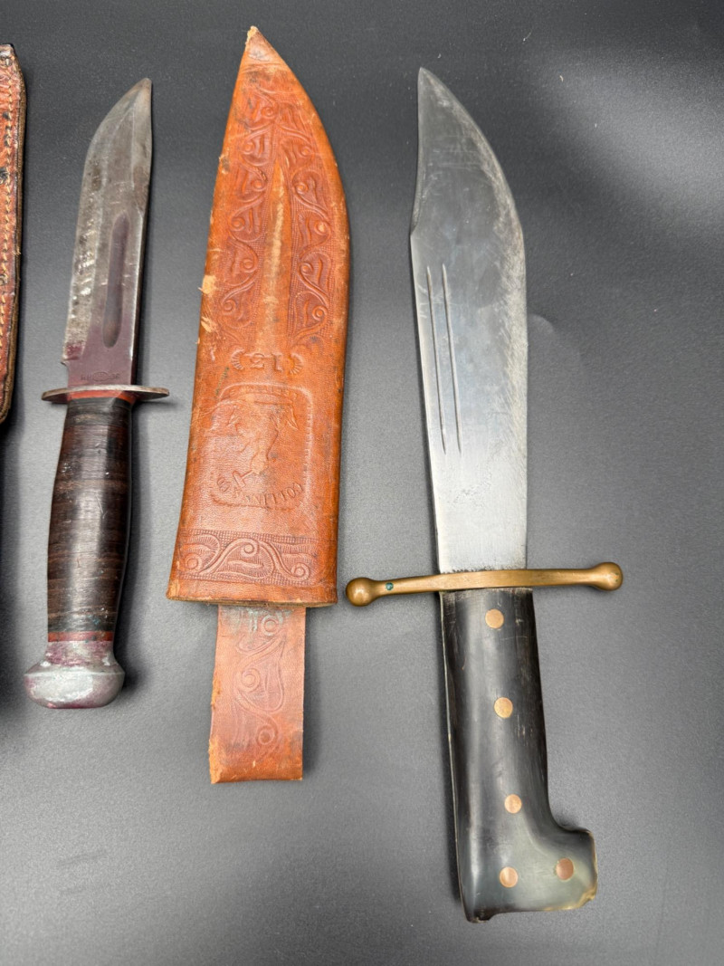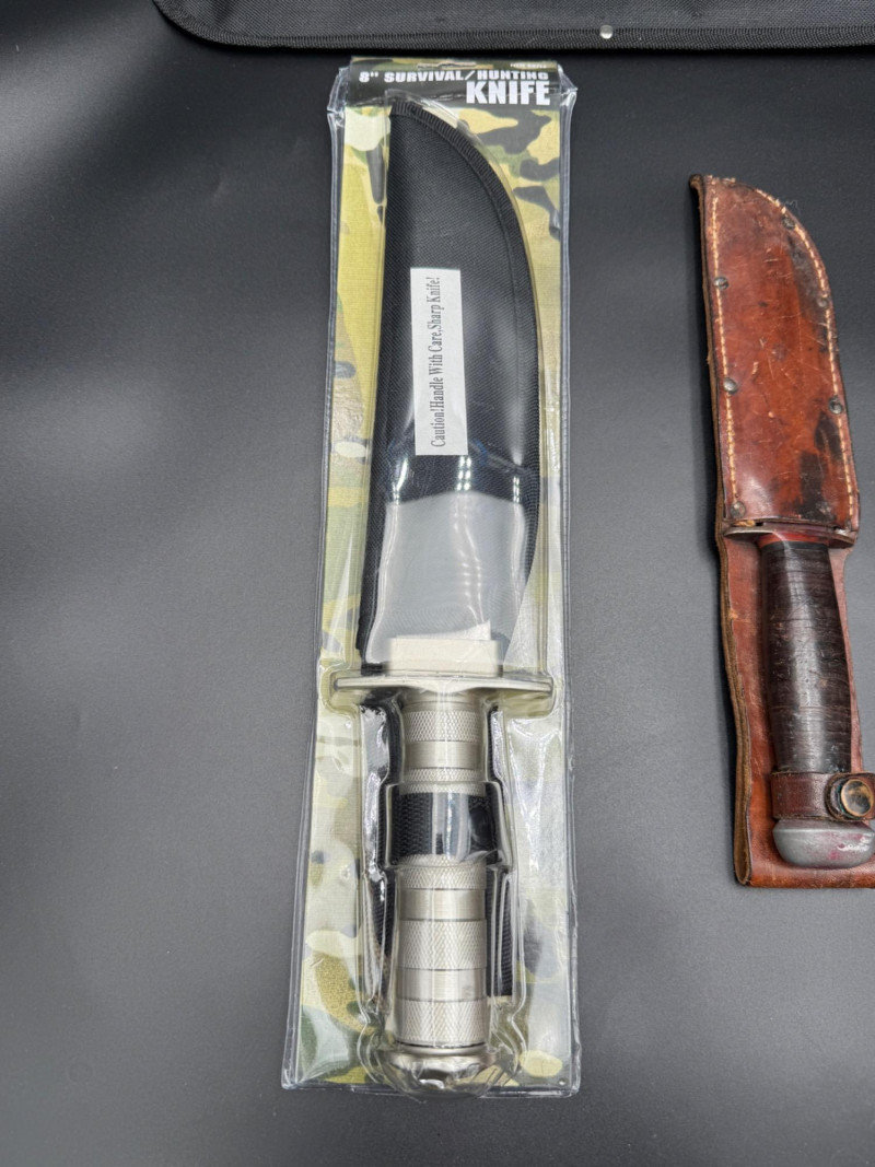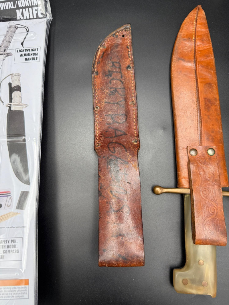 Lot of 4 Knives with Sheaths – Vintage Bowie, Machete, Survival Knife, Leather Handle Description: Lot Includes: Machete with Sheath Long black blade with sawback spine Textured molded handle for secure grip Comes with nylon sheath featuring snap closure Perfect for clearing brush or as an outdoor camp tool Condition: Lightly used with minor scuffs, overall good. 8" Survival/Hunting Knife (IN PACKAGE) Factory-sealed retail packaging Includes nylon sheath Compact design ideal for camping or hunting Condition: Brand new, unopened. Vintage Leather-Handled Hunting Knife Classic stacked leather washer grip Comes with aged brown leather sheath Blade shows wear, patina, and use Approx. 11"–12" range Condition: Well-used with authentic vintage look; sheath has old writing/markings. Cullinan No. 10 Bowie-Style Knife with Leather Sheath Blade stamped “Cullinan, LEGITIMUS MADE IN USA No. 10” Large clip-point bowie design Heavy brass guard with pinned black handle scales Ornate tooled leather sheath Condition: Vintage with visible oxidation, patina, and sheath wear.
