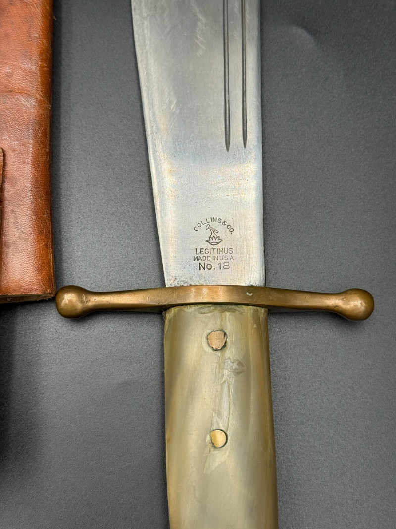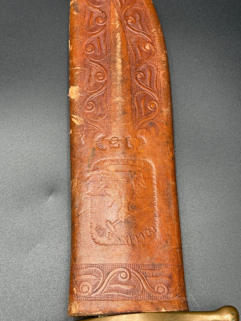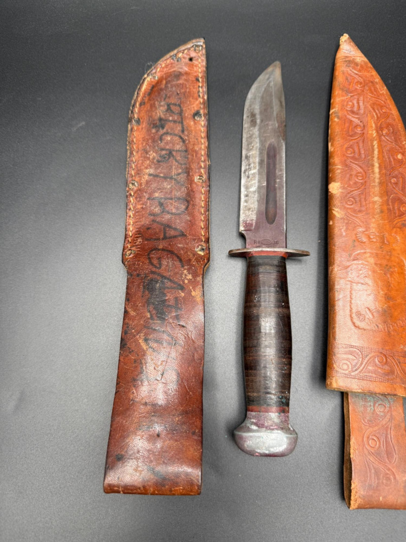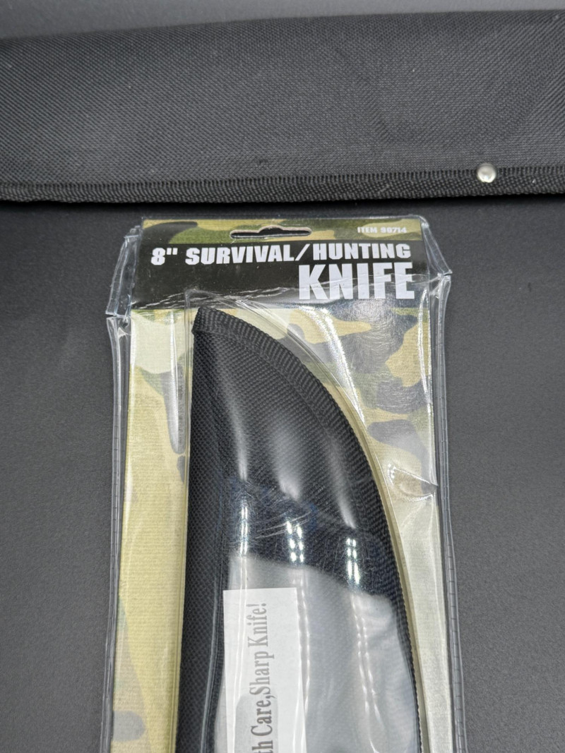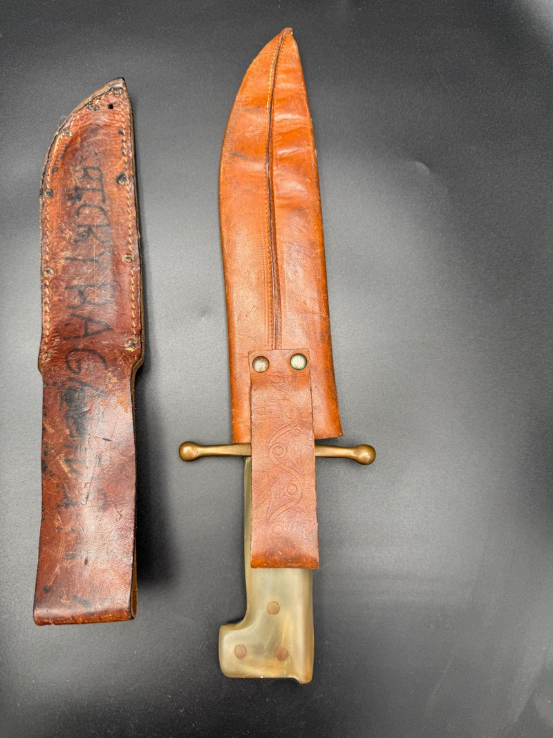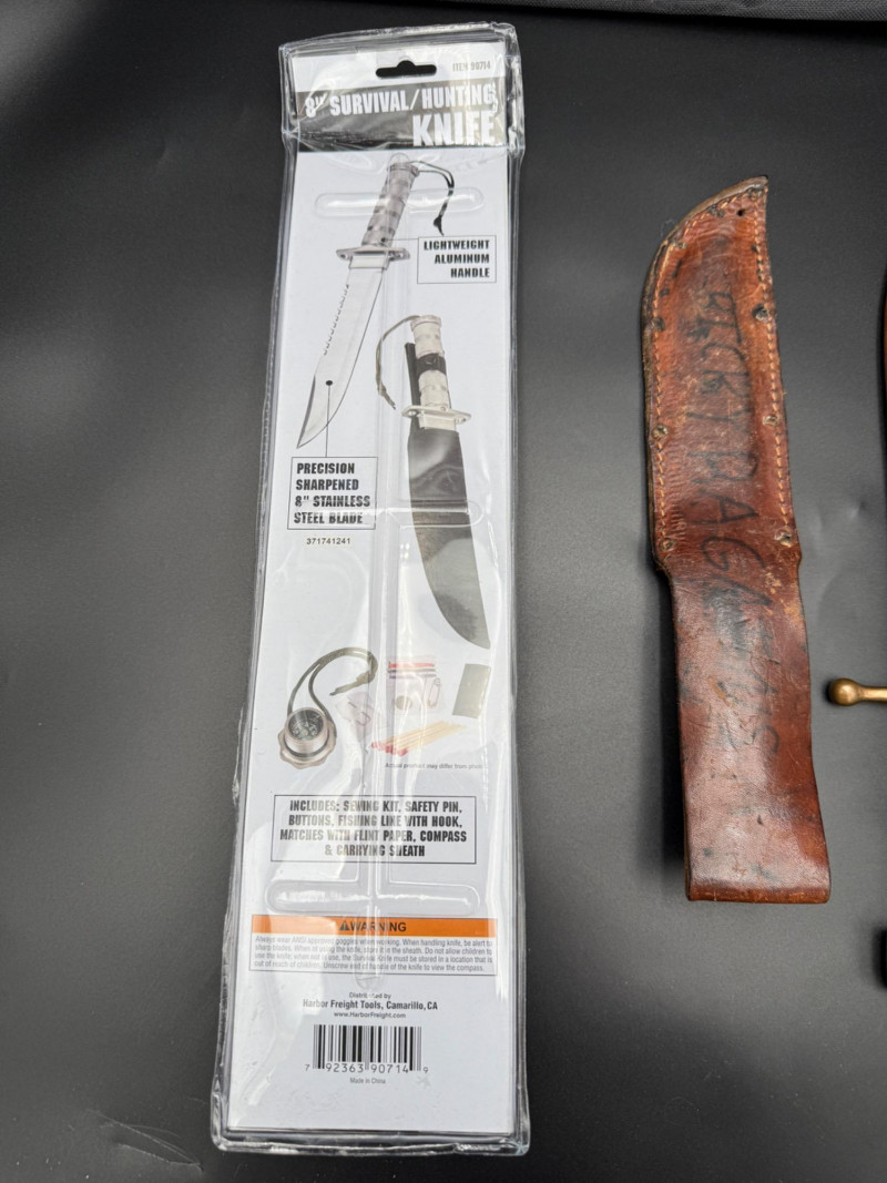 Lot of 4 Knives with Sheaths – Vintage Bowie, Machete, Survival Knife, Leather Handle Description: Lot Includes: Machete with Sheath Long black blade with sawback spine Textured molded handle for secure grip Comes with nylon sheath featuring snap closure Perfect for clearing brush or as an outdoor camp tool Condition: Lightly used with minor scuffs, overall good. 8" Survival/Hunting Knife (IN PACKAGE) Factory-sealed retail packaging Includes nylon sheath Compact design ideal for camping or hunting Condition: Brand new, unopened. Vintage Leather-Handled Hunting Knife Classic stacked leather washer grip Comes with aged brown leather sheath Blade shows wear, patina, and use Approx. 11"–12" range Condition: Well-used with authentic vintage look; sheath has old writing/markings. Cullinan No. 10 Bowie-Style Knife with Leather Sheath Blade stamped “Cullinan, LEGITIMUS MADE IN USA No. 10” Large clip-point bowie design Heavy brass guard with pinned black handle scales Ornate tooled leather sheath Condition: Vintage with visible oxidation, patina, and sheath wear.