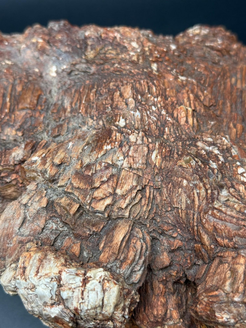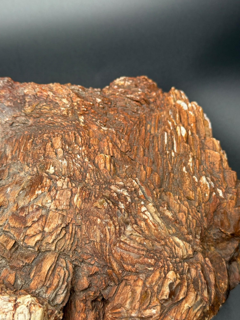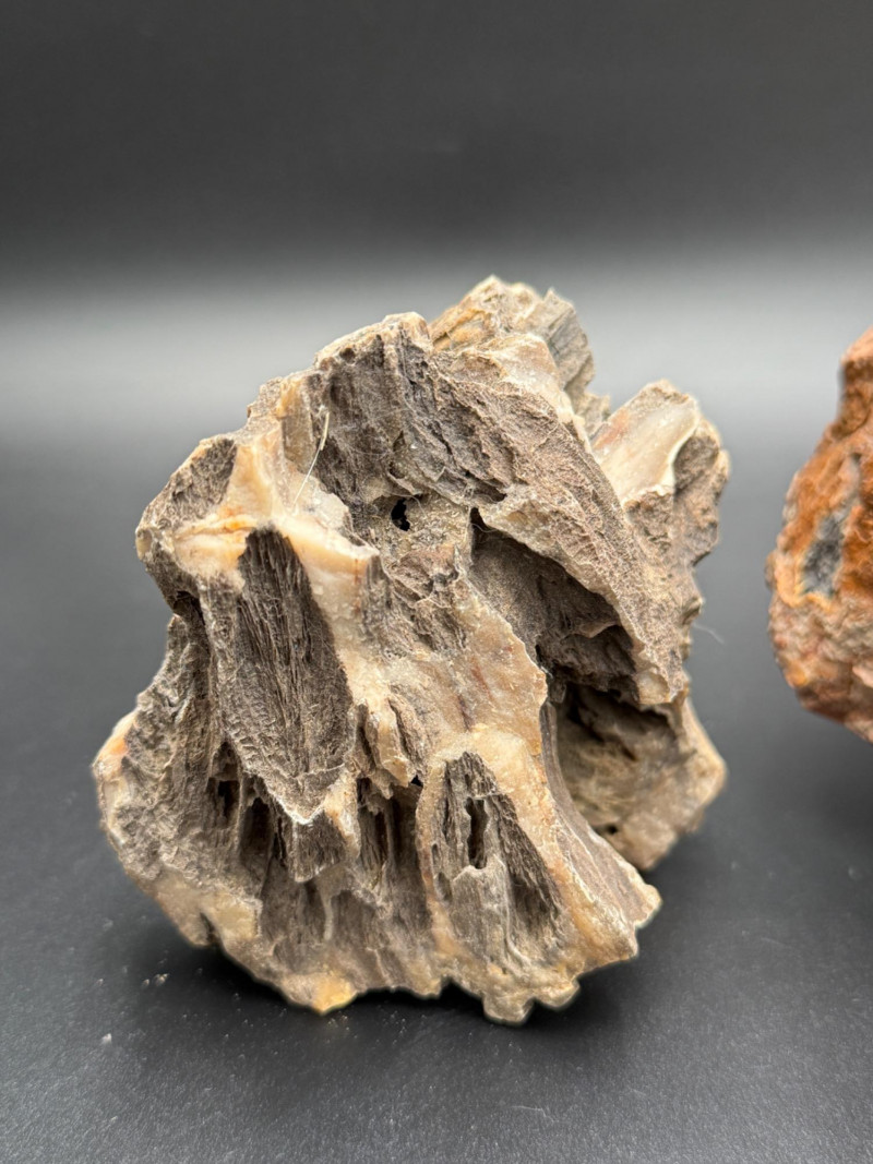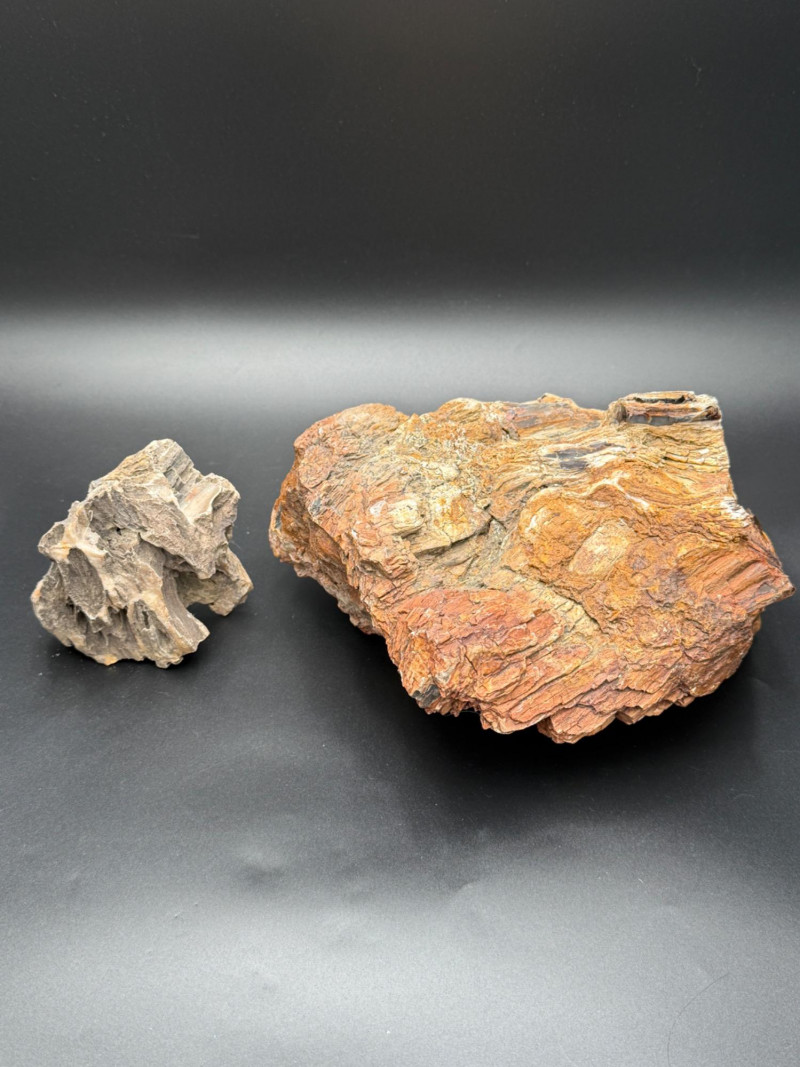 This lot includes two substantial natural stone specimens with rich, layered textures and earthy tones. They closely resemble petrified wood, with striking bark-like surfaces and growth-ring patterns typical of fossilized ancient trees.