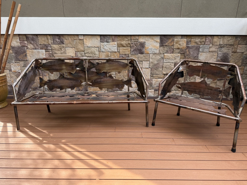 This striking handcrafted metal furniture set includes a large bench and a matching chair, both featuring intricate salmon cutout designs that celebrate Pacific Northwest artistry and craftsmanship.