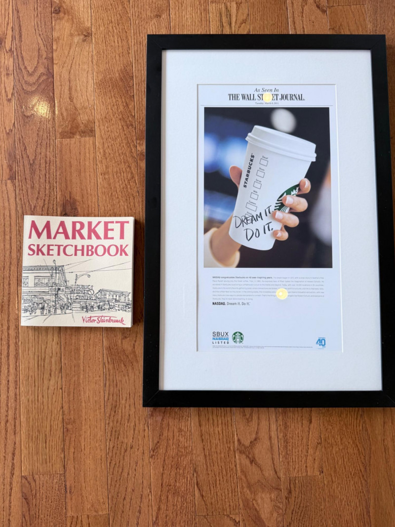 Starbucks Art and Pike Place Market Drawing Book Framed Wall Street Journal display featuring a Starbucks cup with the handwritten phrase "Dream it. Do it." The composition includes the NASDAQ logo marking 40 years and a message recognizing Starbucks' listing. Below the cup image is a NASDAQ statement alongside the Starbucks and SBX listed logos. The display is presented in a black wood frame with white mat and wire hanging hardware. Accompanying the frame is Market Sketchbook by Victor Steinbrueck, a published collection of line drawings and observations of Seattle’s Pike Place Market. The book features hand-rendered scenes of market buildings, vendors, street layouts, and the surrounding downtown area, highlighting the connection between the public market and the city. Dimensions: