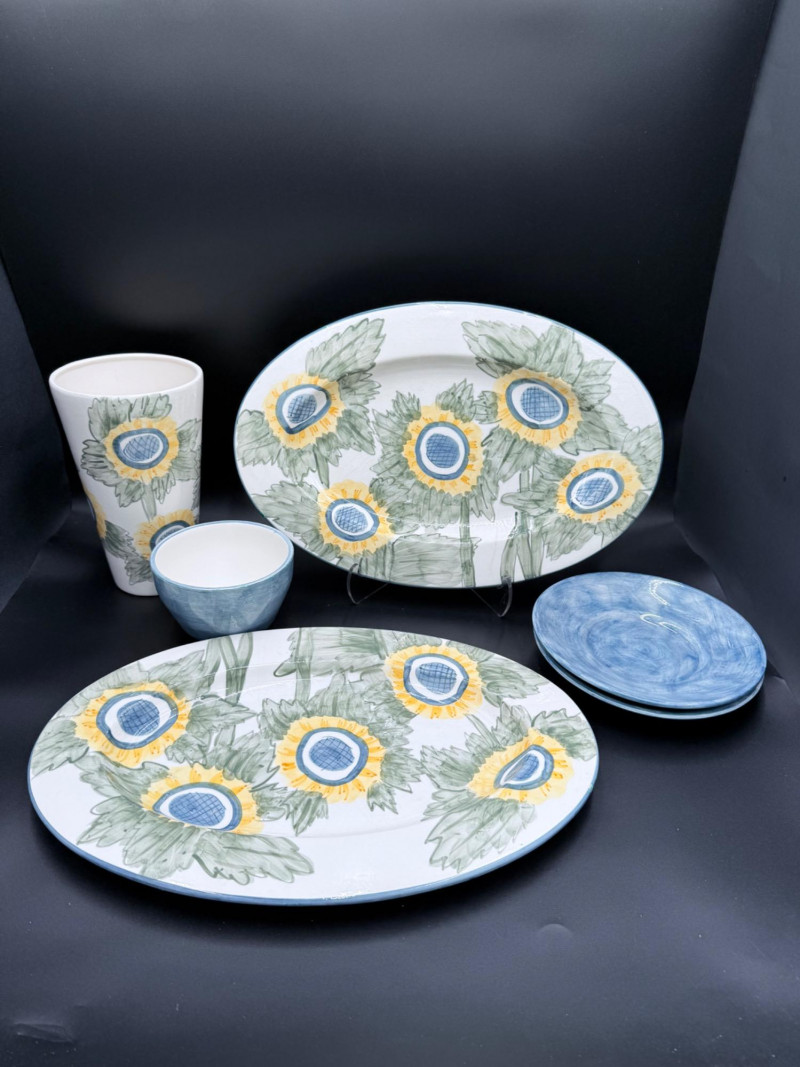 Eddie Bauer Home Ceramic Tableware Set – 6 Pieces Six-piece ceramic tableware set consisting of two oval serving platters, one vase, two round plates, and one bowl. The platters and vase display sunflower motifs composed of green leaves and concentric circular forms in yellow and blue. The round plates and bowl are finished in a blue brushed glaze with visible circular strokes. The platters have a shallow oval form with wide surfaces. The vase is tall and tapering with a flared mouth. The plates are round and flat. The bowl is small and rounded with an open top and smooth walls. All items are marked “Eddie Bauer Home – Made in China.” Dimensions: