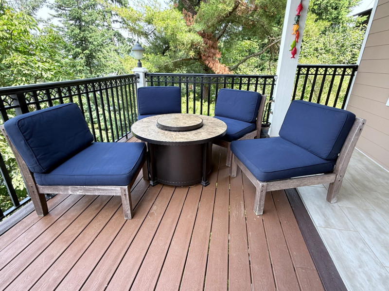 Outdoor Patio Seating and Fire Pit Set Five-piece outdoor set including four wood-frame chairs and a round propane fire pit table. The chairs feature slatted backs and bases with removable deep-seat cushions in a blue textile cover, finished with zippered closures. The fire table has a circular ceramic top with central basin lined with clear fire glass, operated by a propane tank stored beneath. Structural components show surface wear and aging across metal and wood elements. Dimensions (approx.):