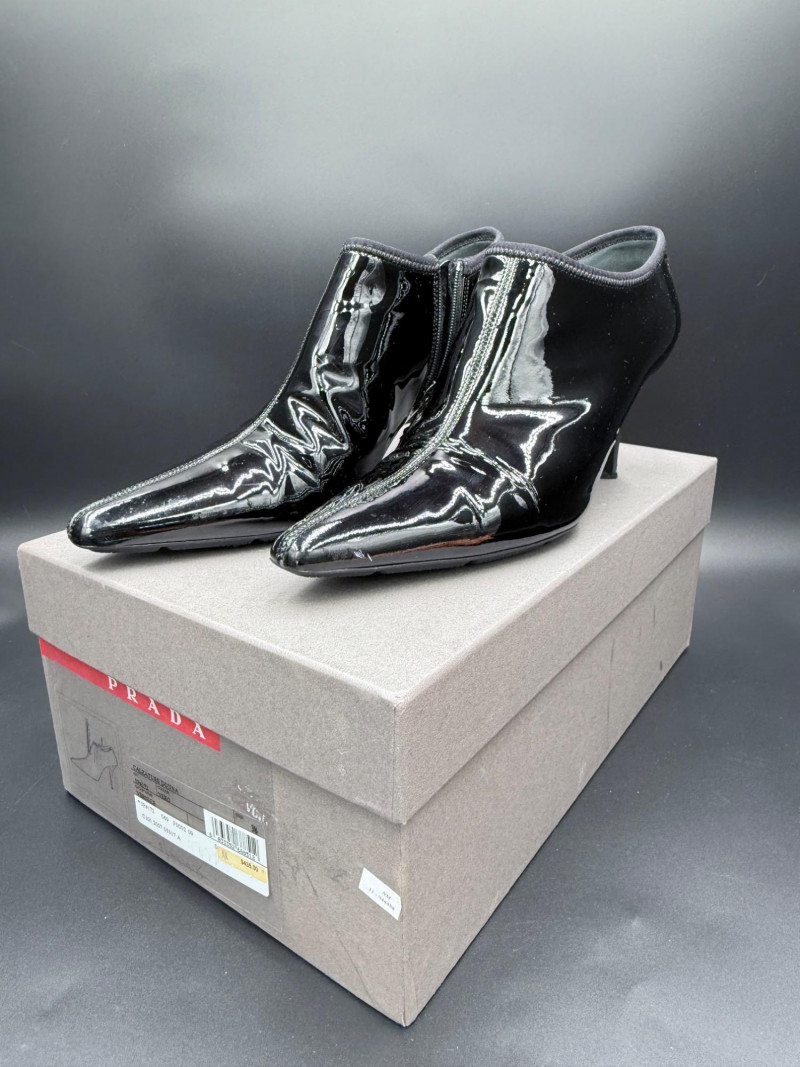 Lot # 13 - Prada Vernice Nero Kitten Heel Zip Booties – Size 38