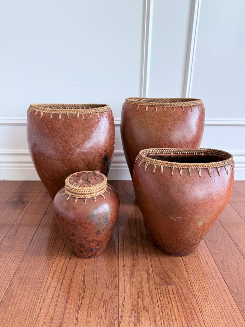 Terracotta Art Pottery Vessel Set with Woven Rims Set of four hand-formed terracotta art pottery vessels, each featuring a rounded body and a rim threaded with natural fiber lacing through pierced openings. Three vessels are open at the top; one includes a fitted lid topped with a sculpted animal figure and finished with a coiled woven edge. The surfaces show varied tones and irregularities from the firing process. The design and detailing are reminiscent of traditional Lombok pottery, though the pieces are unmarked. Estimated Dimensions: Vessel 1: 15" H x 11" W Vessel 2: 14" H x 11" W Vessel 3: 11" H x 9" W Lidded Vessel: 10" H x 6" W