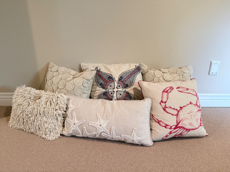 Coastal-Inspired Pillow Collection – Set of 6 Set of six decorative pillows featuring a range of coastal themes, patterns, and textures. One square pillow shows four embroidered fish in mirrored alignment, with a tag identifying it as a Pottery Barn piece filled with 95% waterfowl feathers and 5% down. Two square pillows are constructed with concentric circle appliqués across the front surface. One lumbar pillow is covered in overlapping starfish forms stitched to a plain ground. Another lumbar pillow has looped yarns creating a textured pile surface. The sixth pillow is a square form printed with a large red crab graphic. One pillow bears a Bella Lux Coastal Collection label. Fish embroidered pillow: 24" Two circle motif pillows: 20" Textured pillow: 12" x 19" Starfish pillow: 26" x 12" Crab pillow: 19"