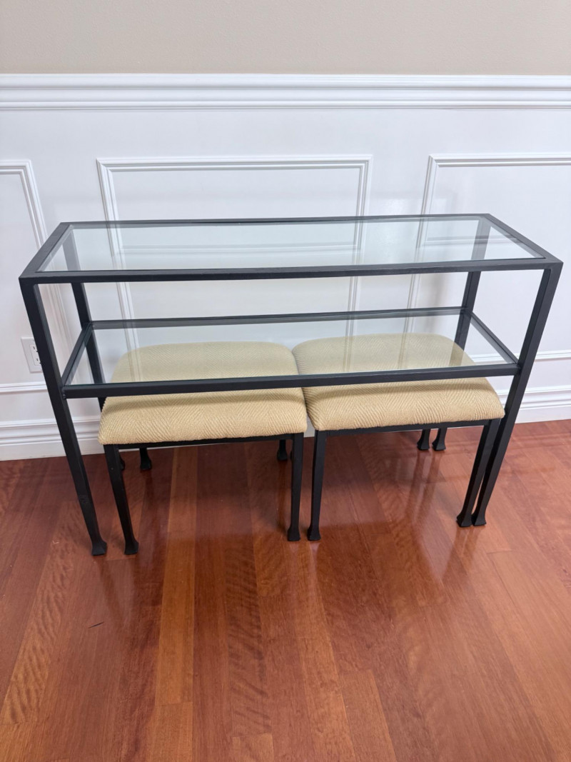 Glass Metal Console Table with Two Stools Console table constructed with a black metal frame and two-tier glass shelving. The upper and lower shelves are inset and supported at each corner by the rectangular frame. Beneath the lower shelf, two square stools with upholstered seats and matching metal legs are positioned for compact storage. Dimensions: