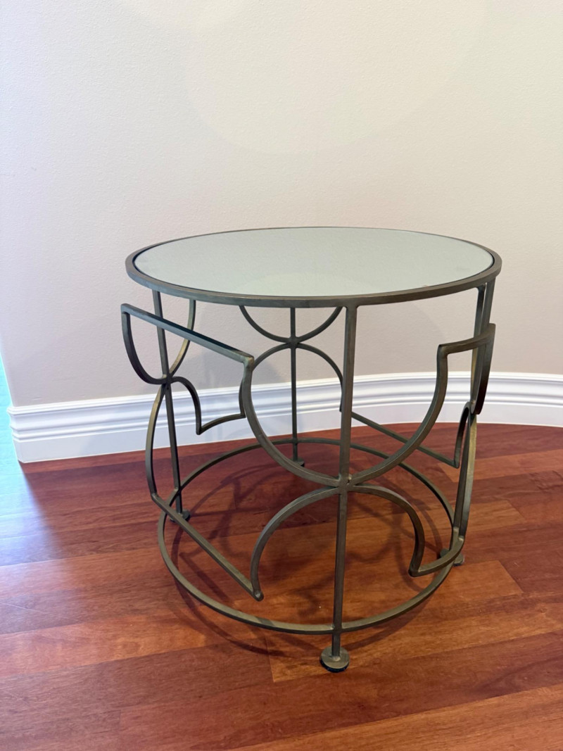 Round Gold-Tone Metal Side Table with Mirrored Top Round side table with a mirrored glass top and a gold-tone metal frame featuring curved and angular openwork designs. The structure includes a circular base ring and four upright supports connected to a raised rim that secures the top panel. Dimensions: