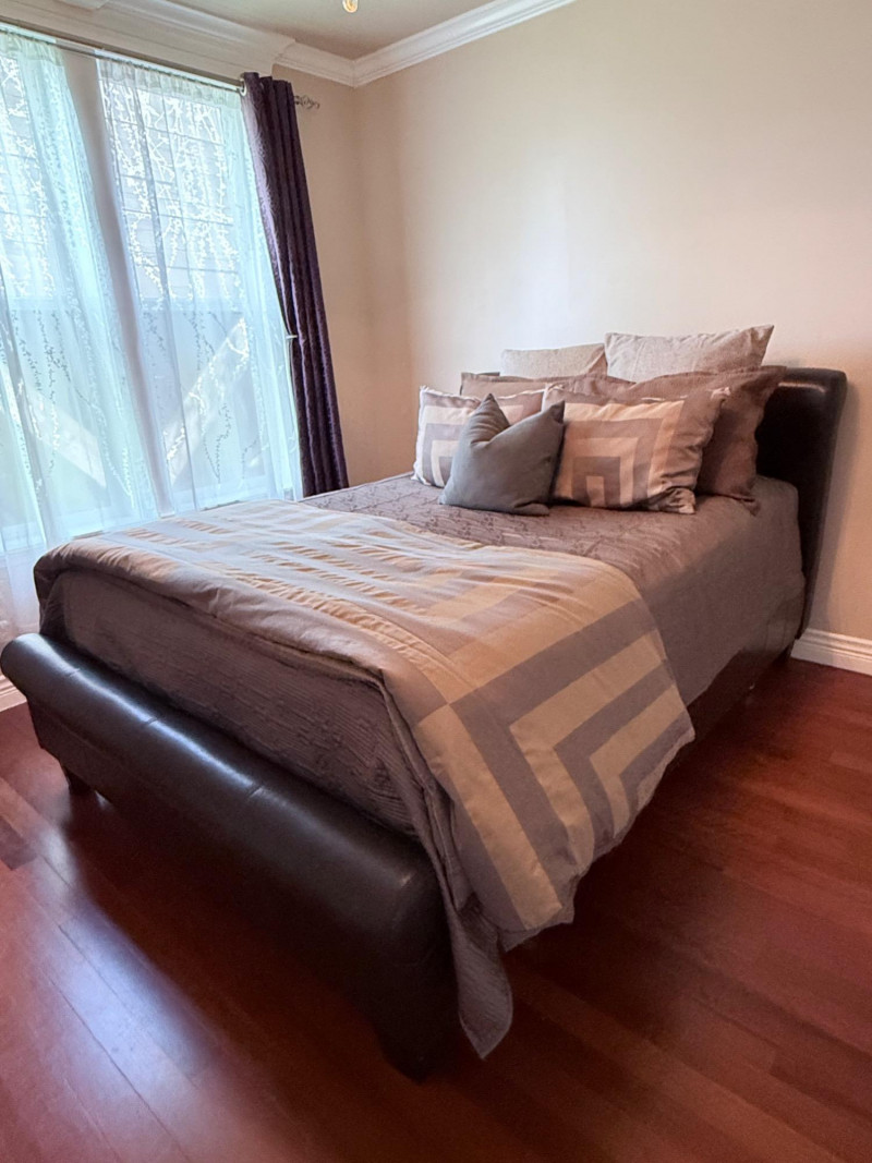 Faux Leather Bed Frame with Bedding and Pillows Full/queen-sized bed frame with synthetic leather headboard and footboard. Includes a geometric-pattern quilt cover, four standard pillows with cases, two 25" accent pillows, and one gray 18" pillow. Fabric content is a cotton and polyester blend. Frame Dimensions: 45" H x 91" L x 65" W Note: Mattress and box springs are not included.