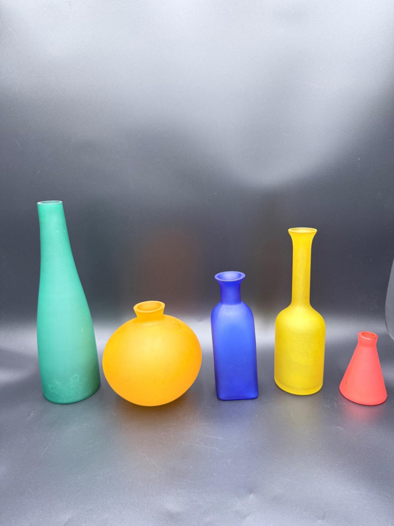 Assorted Satin Finish Colored Glass Vase Group of five vases in assorted shapes and colors, made from satin finish glass. Forms include a round-bodied vessel, a conical piece, a square-shouldered vase, a tall narrow-necked bottle, and a gently curved cylinder. Colors include red, yellow, blue, green, and orange. Heights range from approximately 4" to 13".