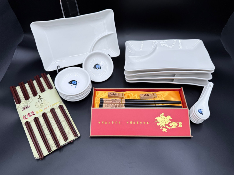 Durable China Sushi Set with Plates, Bowls, Spoons, and Chopsticks Porcelain sushi dining set featuring a black and blue fish motif across matching dinnerware. Each piece is marked “Durable China Made in China.” Set includes: 5 rectangular sushi plates (6" x 10") 6 round bowls (4") 6 porcelain soup spoons (5") 12 pairs of chopsticks in two styles
