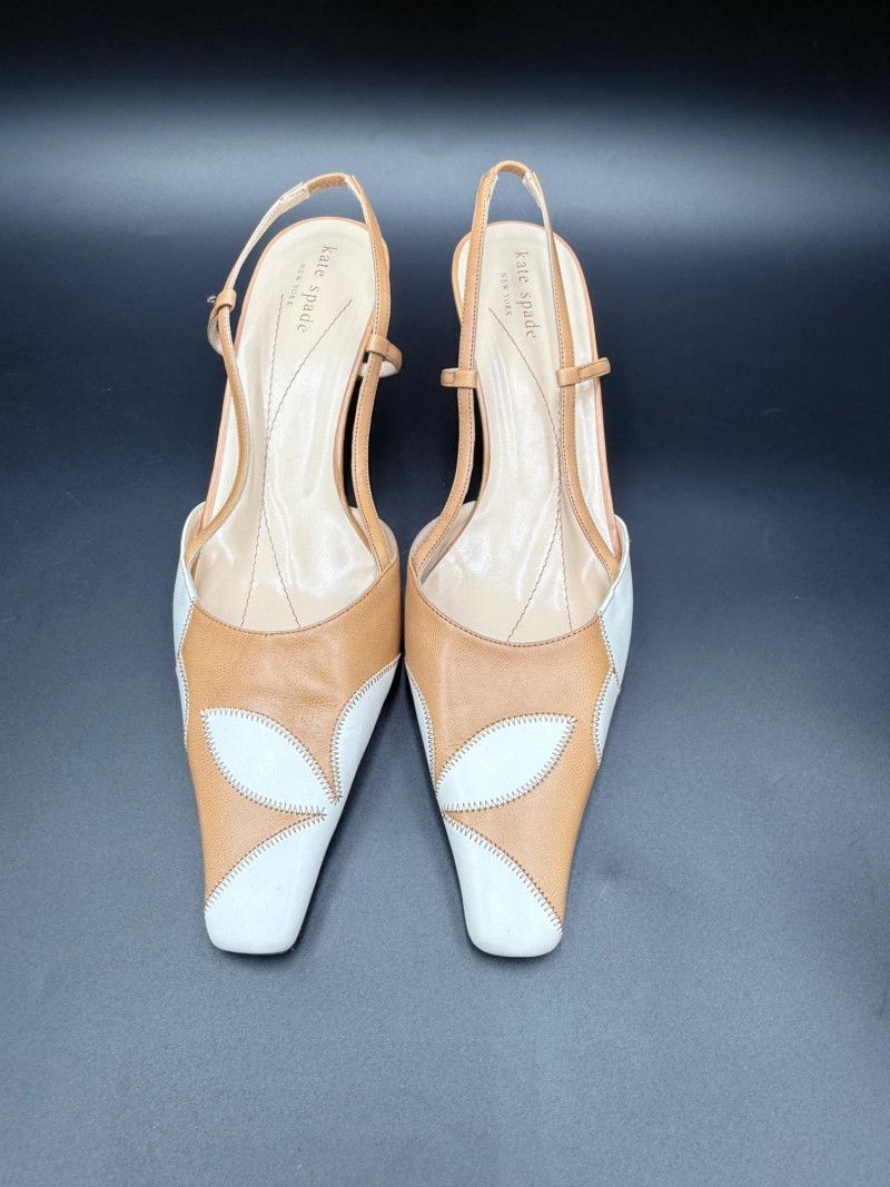 Kate Spade Slingback Heels – Size 8.5 Leather slingback heels featuring a two-tone upper with petal-shaped stitched inlays and a squared toe. The design includes an open back with adjustable strap and stacked wood-look heel. Leather soles marked “Kate Spade New York – Made in Italy.” No box included. Size: 8.5 M