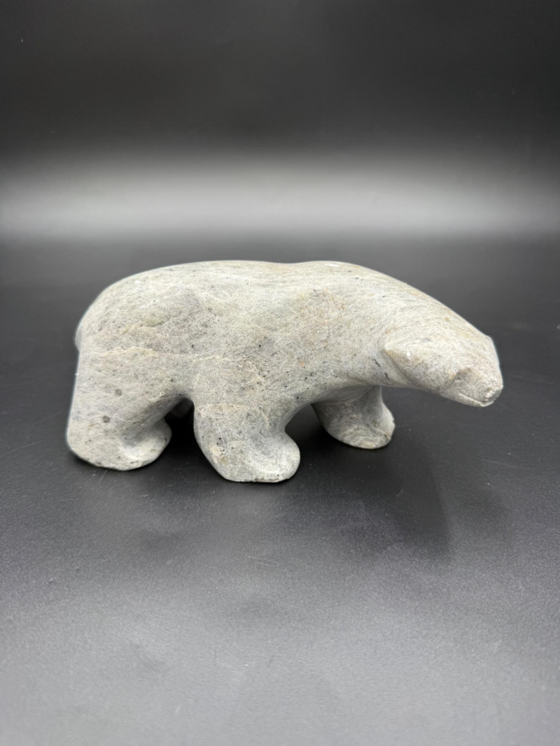 Hand-Carved Stone Polar Bear Sculpture – 7" Artisan Carving Description: Expertly shaped with an understated, timeless form, this sculpture channels the aesthetic of Northern and Indigenous carving traditions while remaining versatile enough for any sophisticated collection. The cool-toned stone reveals subtle variations and veining, emphasizing its natural origin and artisanal craftsmanship. Highlights: Hand-carved from solid stone Dimensions: 7" L x 3" W x 4" H Artist: Unknown Elegant minimalist form inspired by traditional carving styles Beautiful natural stone variations A distinctive, heirloom-quality art object Condition: Notes: