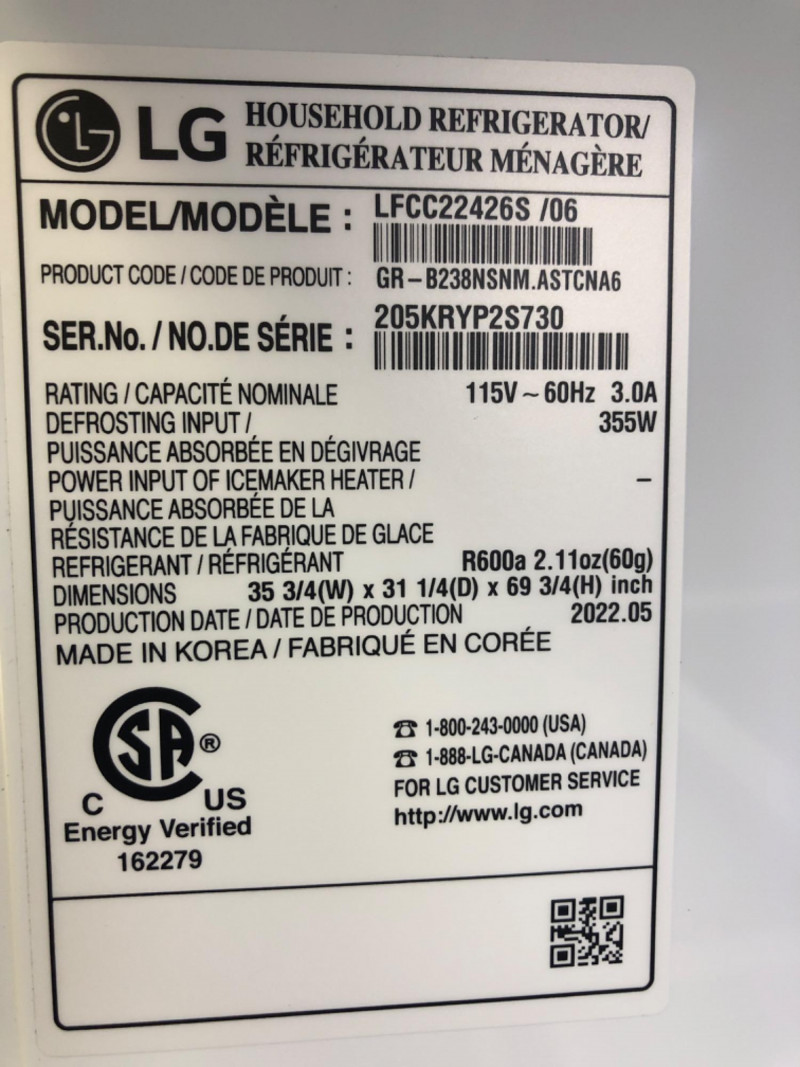 LG 22.8 Cu. Ft. Stainless French Door Refrigerator - Counter Depth Model LFCC22426S Recent homeowner purchase; hardly used and still has all the store tags on the inside of the refrigerator. For more information click here Friendly Reminder: This auction will start closing at 6:30pm on Tuesday, August 12th