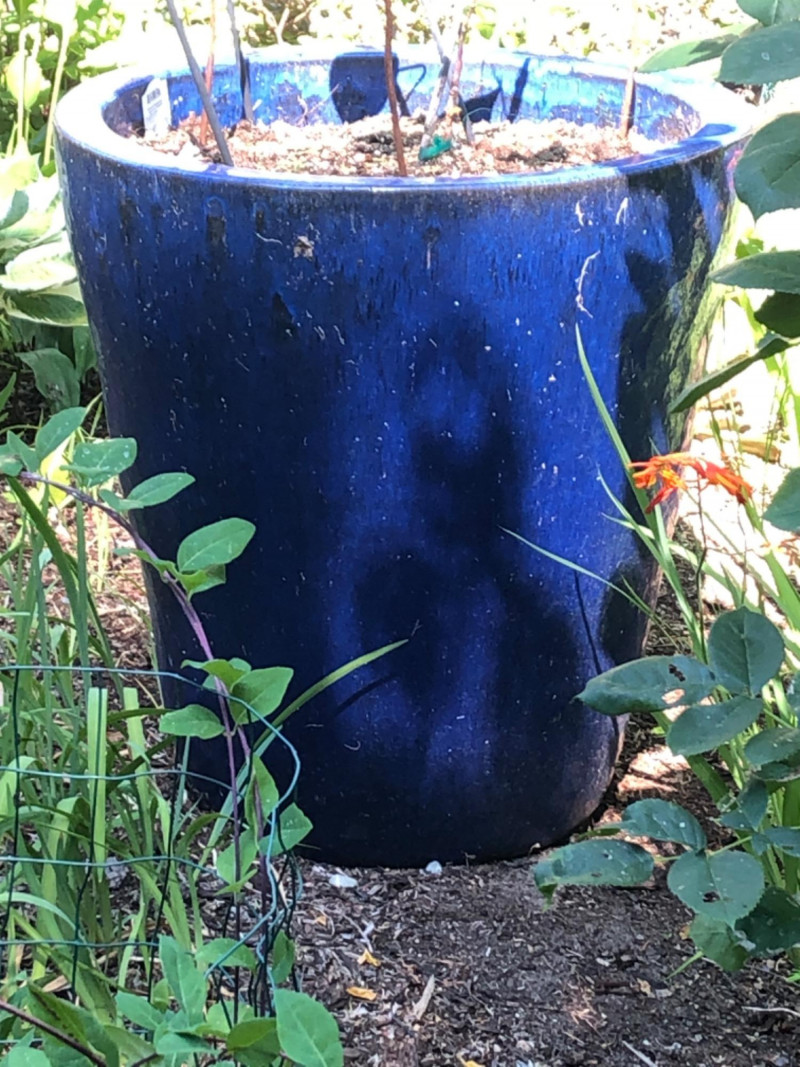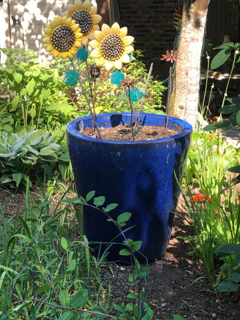 Lot # 3 - Large Blue Ceramic Planter with Metal Sunflower Garden Accents