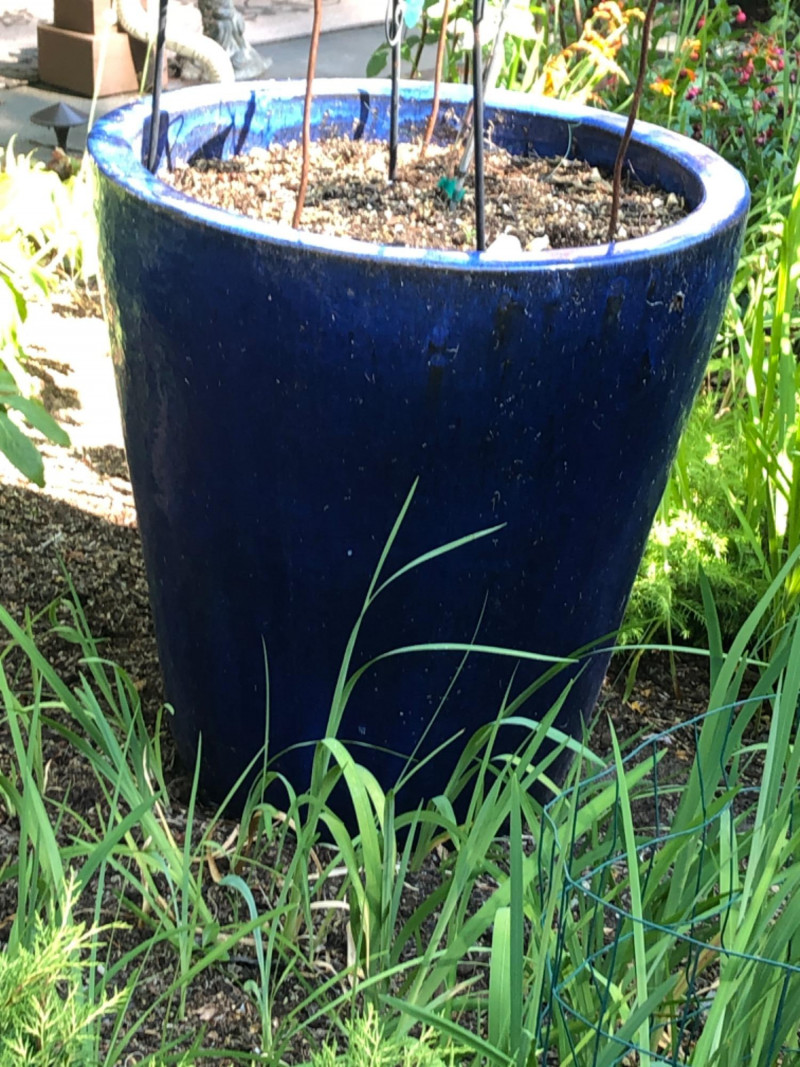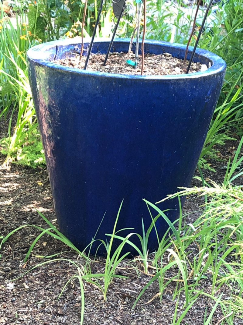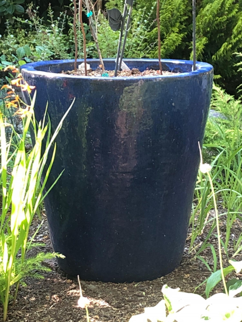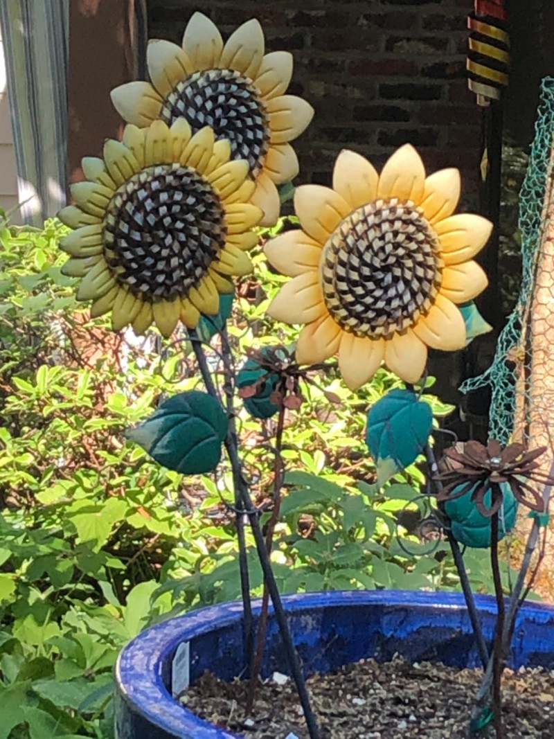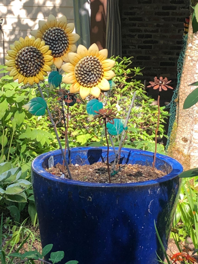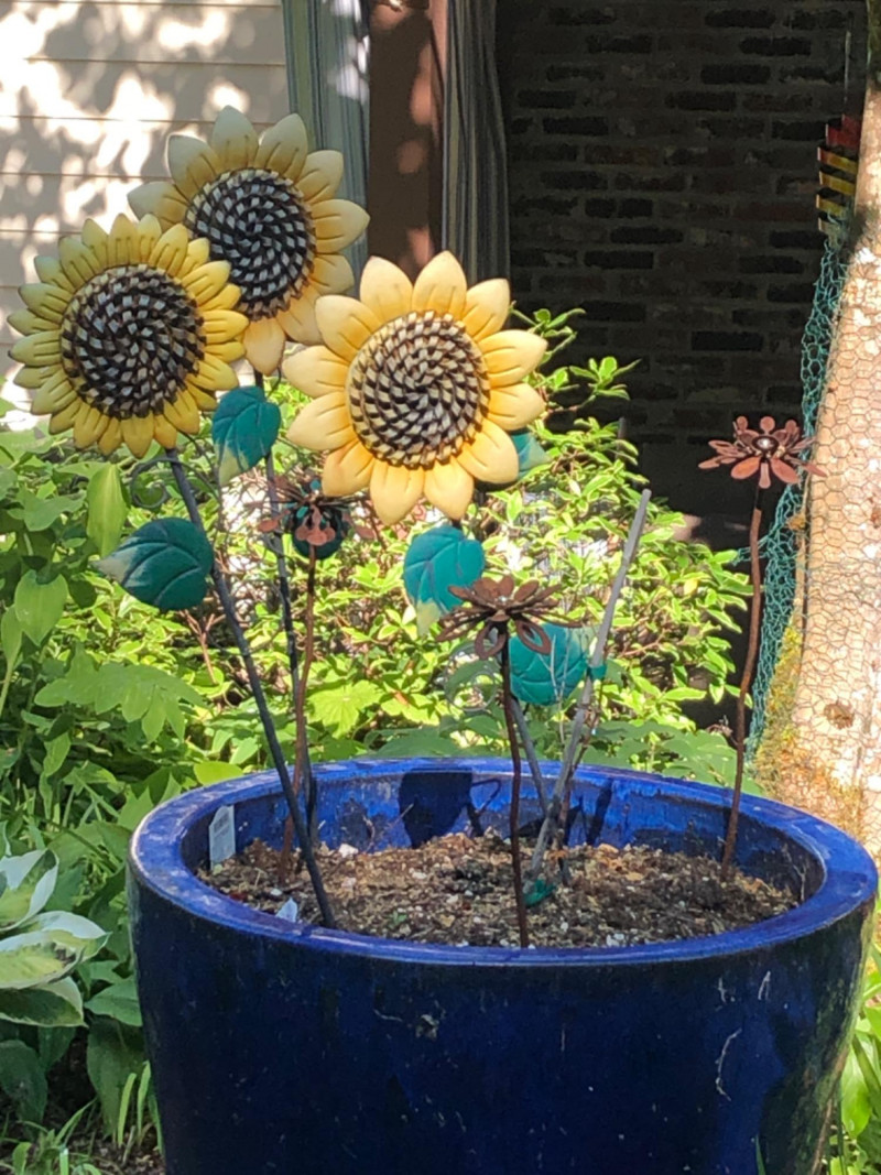 This heavy ceramic garden planter boasts a bold, cobalt blue glaze and substantial presence. Made of true fired clay (not plastic or composite), its thick-walled construction and high-gloss finish lend an elegant touch to patios, entryways, and garden corners alike. Included are three metal sunflower stakes, each showcasing bright yellow petals and rustic detailing. Planted securely in soil, these floral sculptures offer seasonal cheer without fading—perfect for year-round display. Details: Planter dimensions: 26.5" W x 26" H Material: Fired ceramic with blue glaze Sunflower stakes: Three included; approx. 24"H each Condition: Garden-ready presentation Category: Outdoor décor A striking centerpiece for any landscape design, this planter invites attention with its vibrant color, generous size, and playful metallic blooms. Ideal for garden enthusiasts, outdoor decorators, or anyone seeking a touch of permanent sunshine. Friendly Reminder: This auction will start closing at 6:30pm on Tuesday, August 12th