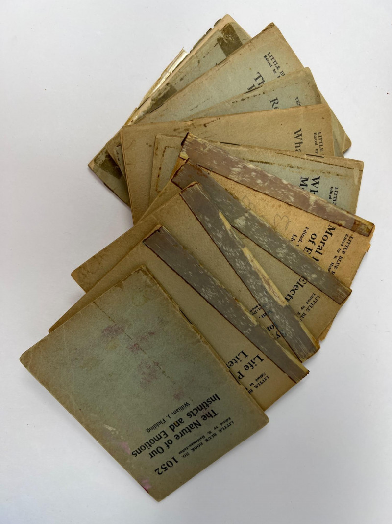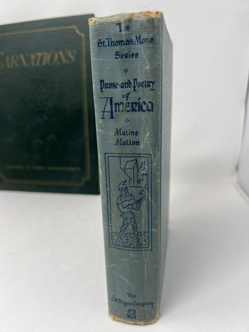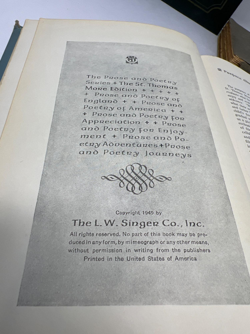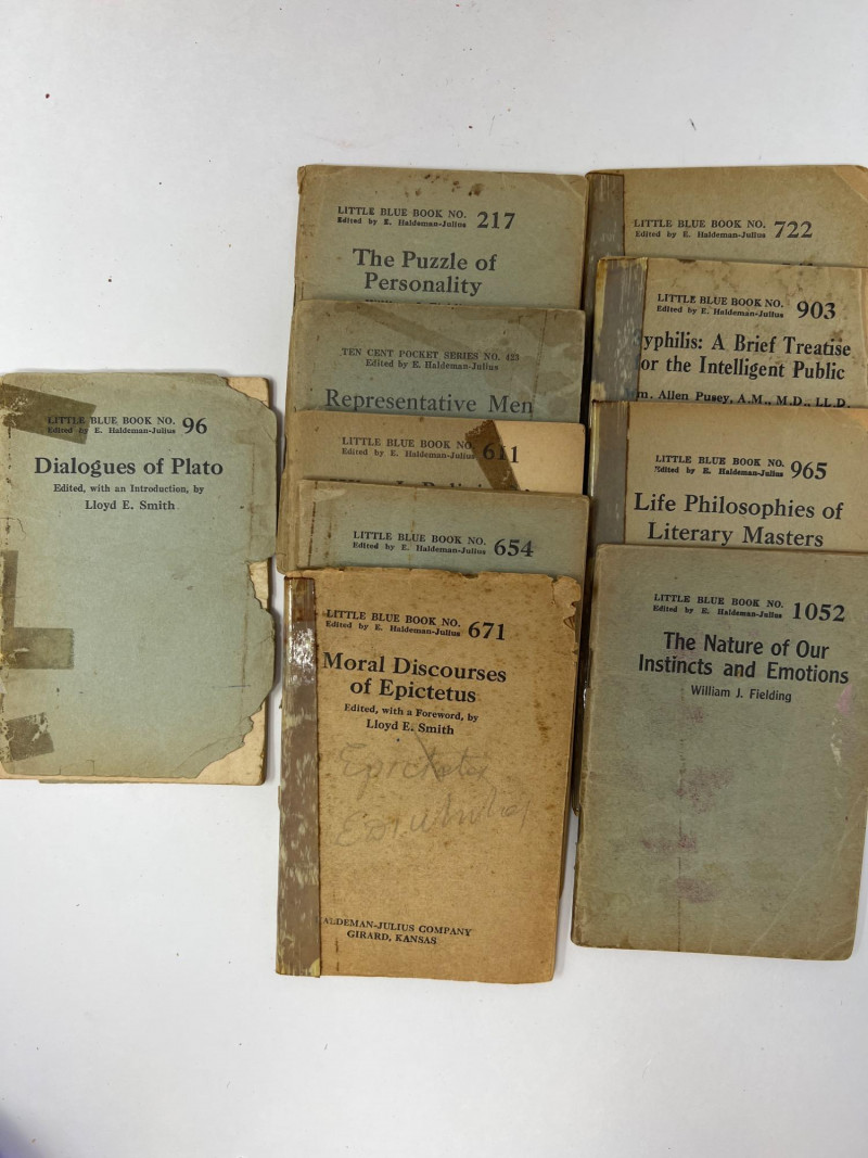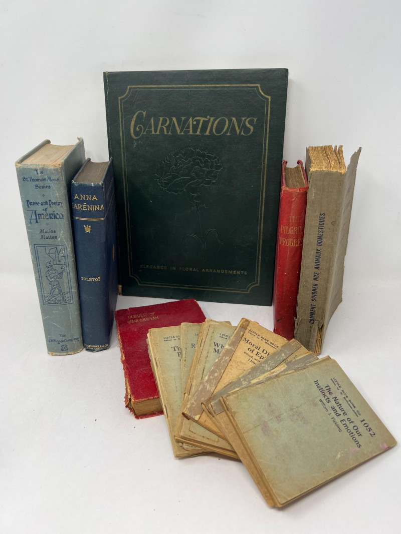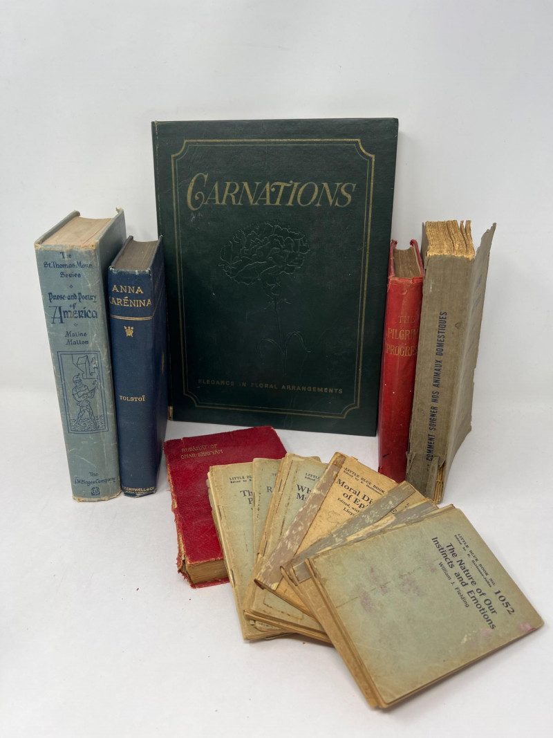 A thoughtful mix of vintage and mid-century titles, ranging from philosophy and literature to floral arrangement and education. Each volume offers a distinct glimpse into cultural and intellectual history. Included Titles: “Prose and Poetry of America” by Meline Mallon – Part of the St. Thomas More Series, this anthology celebrates American literary tradition with select works reflecting patriotism, wit, and introspection. “Anna Karenina” by Tolstoy – Tolstoy's masterwork of love, betrayal, and societal constraint—a cornerstone of Russian literature. “Carnations: Elegance in Floral Arrangements” – A delightful guide to artistic floral design, showcasing the mid-century fascination with structured beauty in home décor and garden culture. “The Pilgrim’s Progress” – John Bunyan’s enduring allegory of faith and perseverance, influential in both religious and literary spheres. “Moral Discourses of Epictetus” (Library of Standard Writers) – Stoic philosophy at its finest; Epictetus shares reflections on virtue, endurance, and the nature of wisdom. “The Nature of Our Instincts and Emotions” – Little Blue Book No. 1052 – A compact exploration of human psychology, part of the influential early 20th-century Little Blue Book series. “What is Man?” – Little Blue Book No. 1000 – A provocative examination of human identity and philosophical inquiry, likely drawing from Twain or similar thinkers. “The Republic” – Little Blue Book No. 828 – Plato’s foundational political treatise, introducing timeless concepts of justice, ideal society, and leadership. “The Philosophy of Education” – Little Blue Book No. 837 – A concise summary of educational theory and the importance of intellectual development, tailored for a general readership. ... AND MORE Condition: Varies from gently worn to well-loved, with characterful patina consistent with age. This is a lot for collectors of vintage books, philosophers at heart, or decor enthusiasts seeking a scholarly accent. Friendly Reminder: This auction will start closing at 6:30pm on Tuesday, August 12th