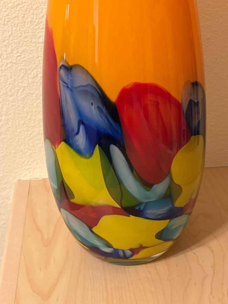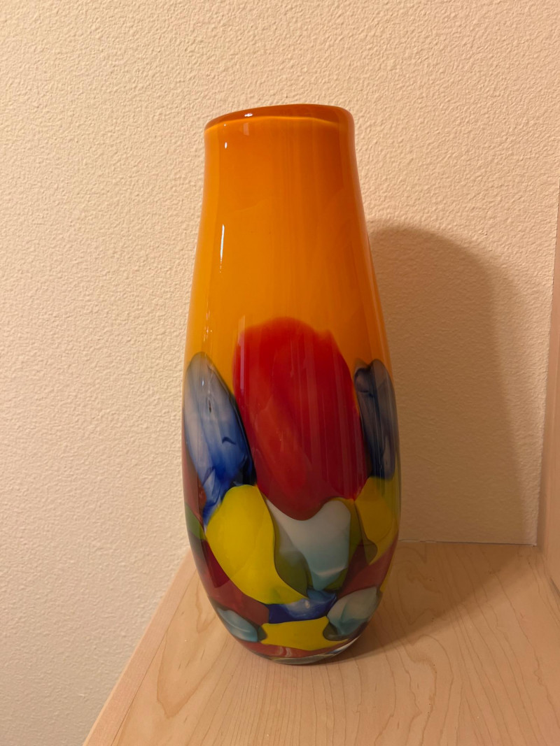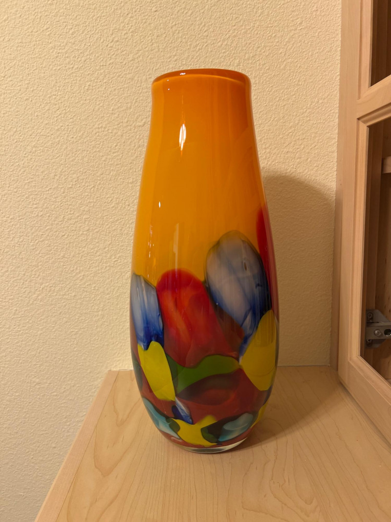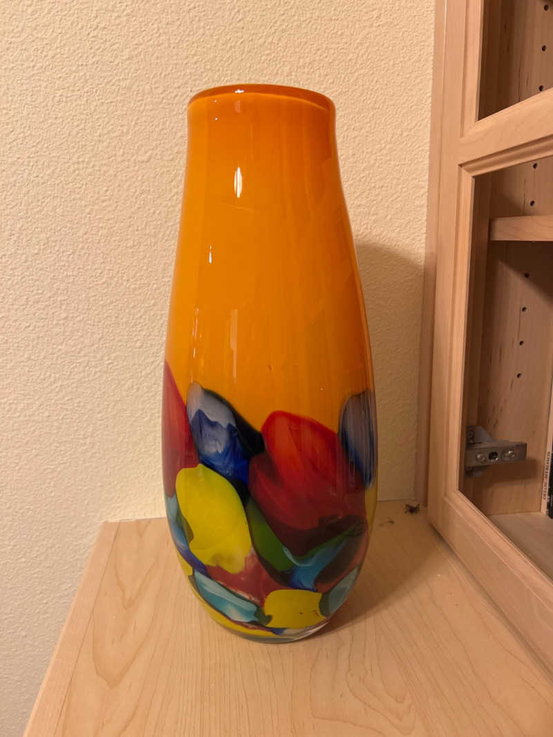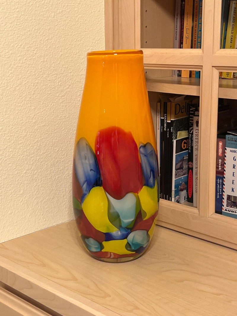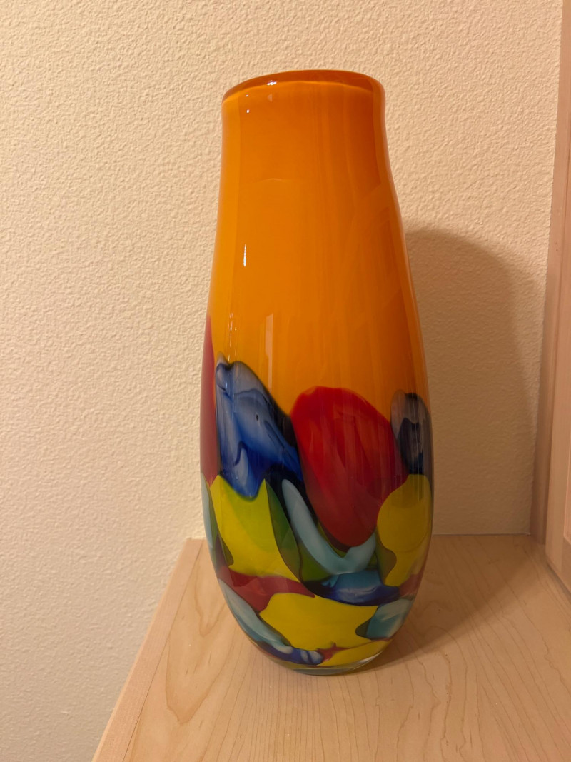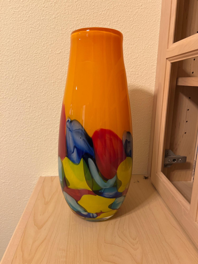 Add a bold statement piece to your home decor with this stunning hand-blown art glass vase, featuring a rich blend of vibrant colors including red, yellow, blue, and green against a warm amber-orange top. The abstract pattern is reminiscent of modern Murano-style artistry, making it a unique and eye-catching addition to any collection. Features: Hand-blown art glass with abstract multicolor inclusions Glossy, smooth finish with a clear glass casing Tapered cylindrical shape with rounded base and wide opening Unsigned, but consistent with studio or Murano-inspired art glass styles Friendly Reminder: This auction will start closing at 6:30pm on Tuesday, August 12th