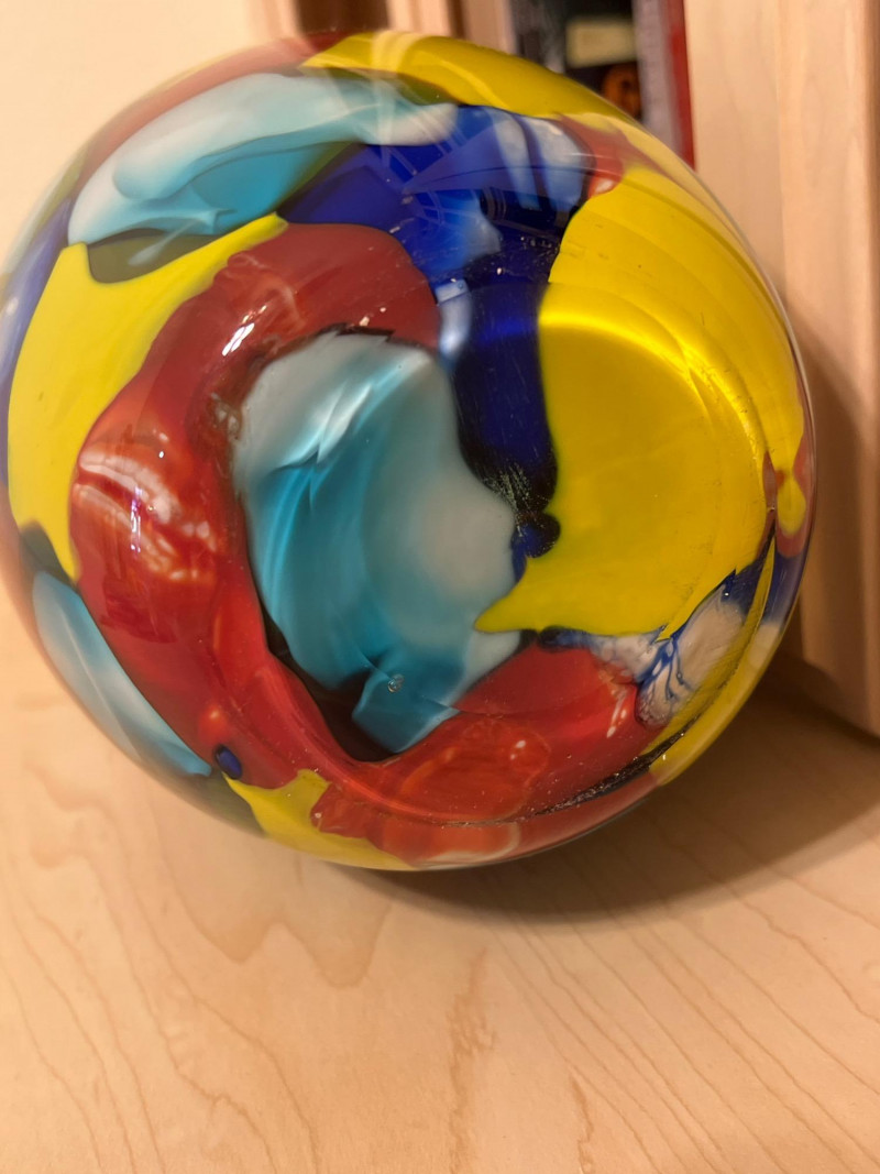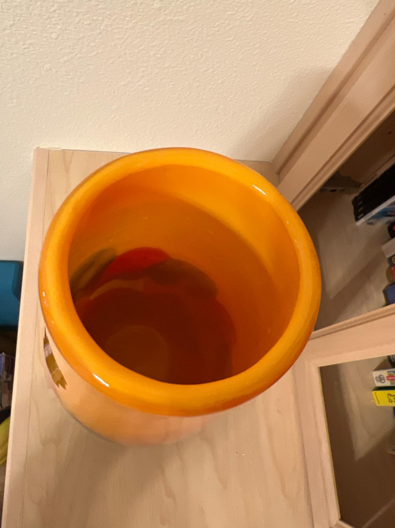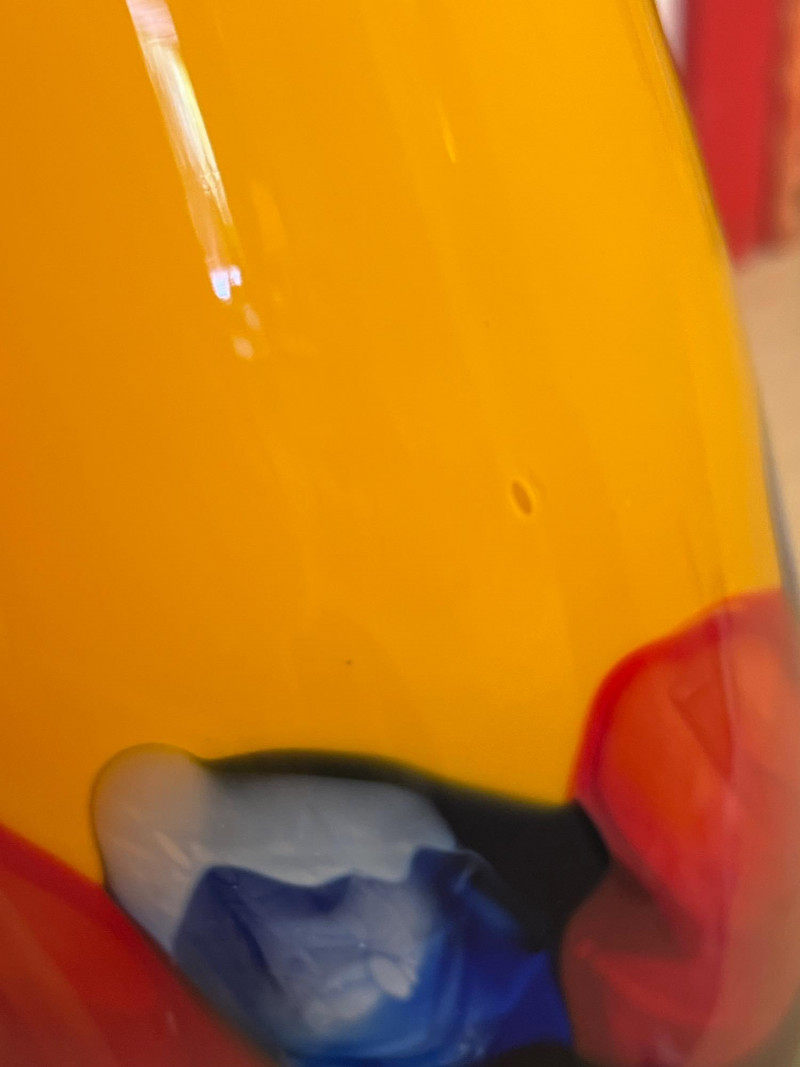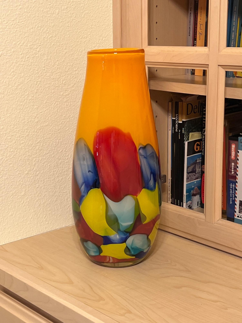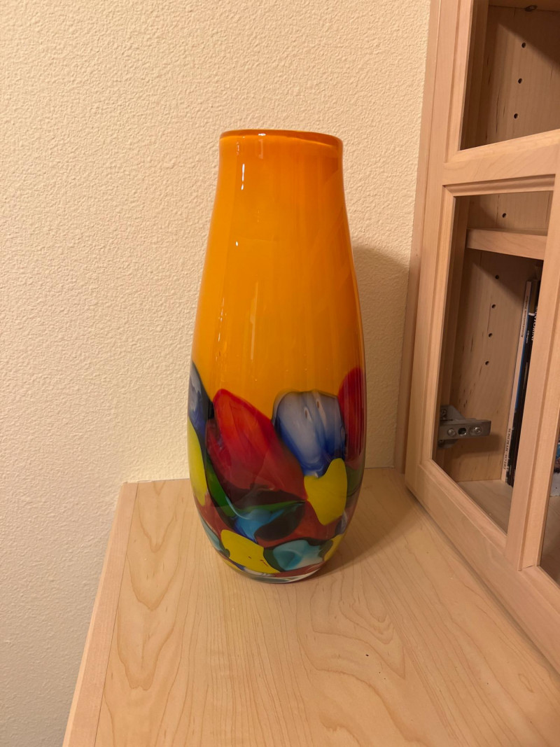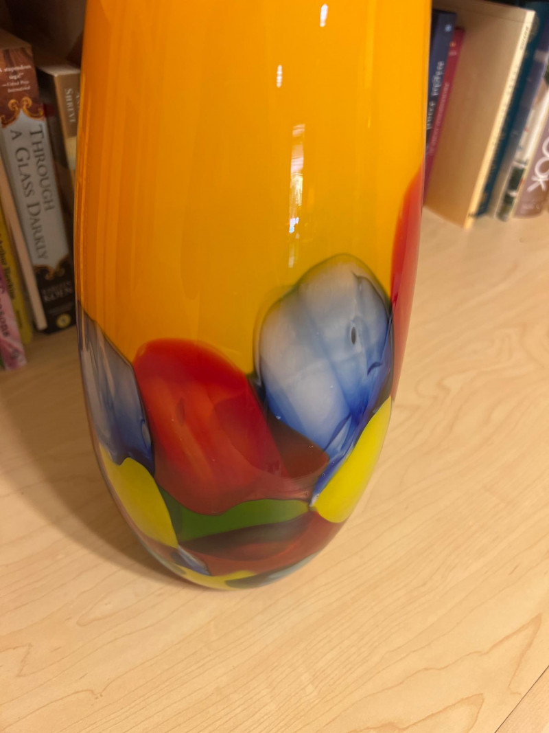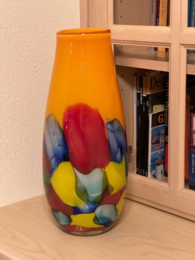 Add a bold statement piece to your home decor with this stunning hand-blown art glass vase, featuring a rich blend of vibrant colors including red, yellow, blue, and green against a warm amber-orange top. The abstract pattern is reminiscent of modern Murano-style artistry, making it a unique and eye-catching addition to any collection. Features: Hand-blown art glass with abstract multicolor inclusions Glossy, smooth finish with a clear glass casing Tapered cylindrical shape with rounded base and wide opening Unsigned, but consistent with studio or Murano-inspired art glass styles Friendly Reminder: This auction will start closing at 6:30pm on Tuesday, August 12th